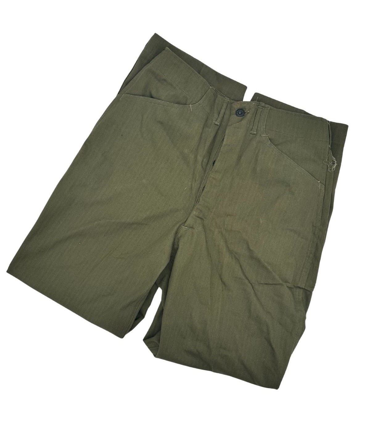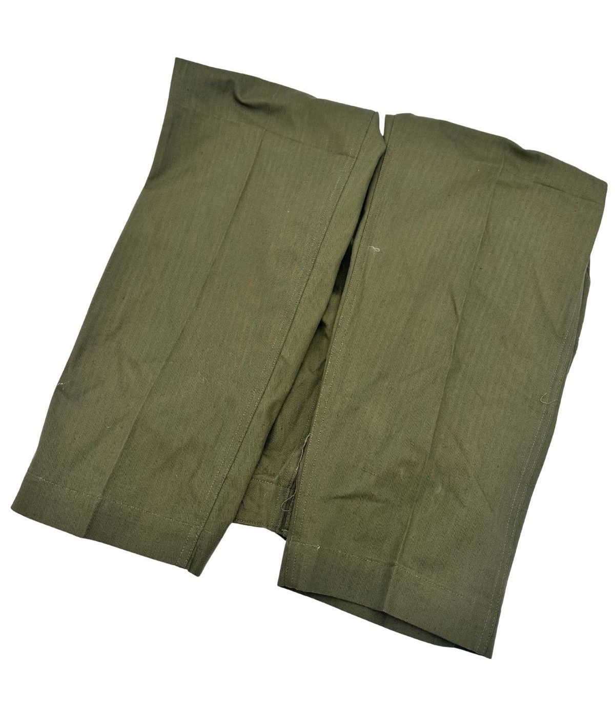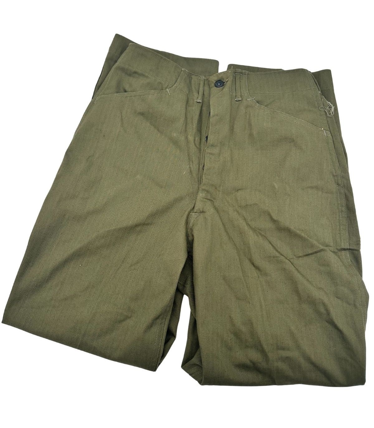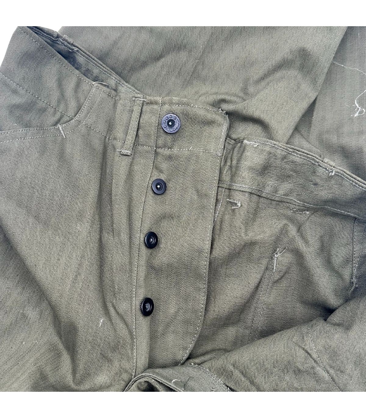 Cet exemplaire n'a jamais été porté ni lavé. Il possède encore toute la rigidité et la couleur profonde de la toile Herringbone Twill (HBT) d'origine. La teinte est le vert olive typique de la Navy, souvent appelé "Sage Green" ou OD#7.