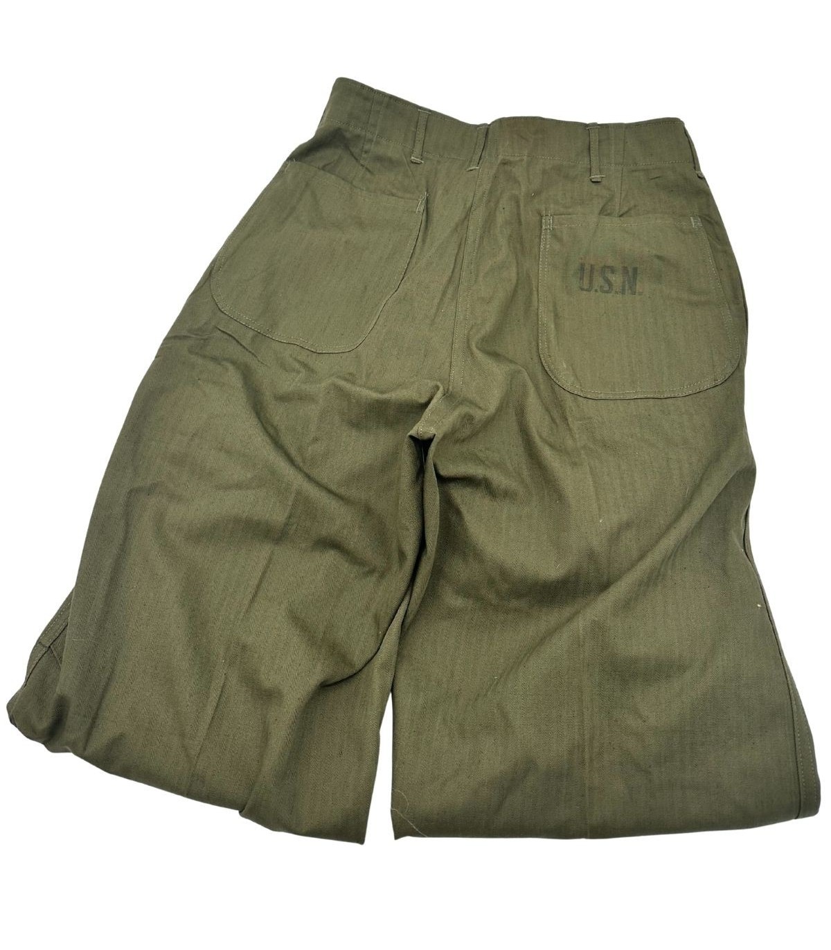 Marquages : Présence probable du tampon "U.S.N." (souvent sur la poche arrière ou à l'intérieur de la ceinture) et de l'étiquette de taille d'origine.