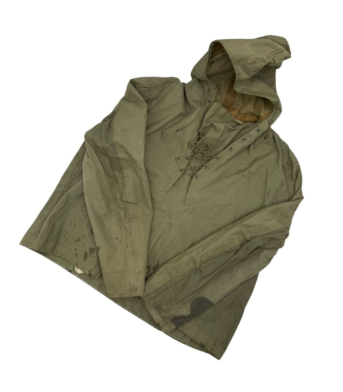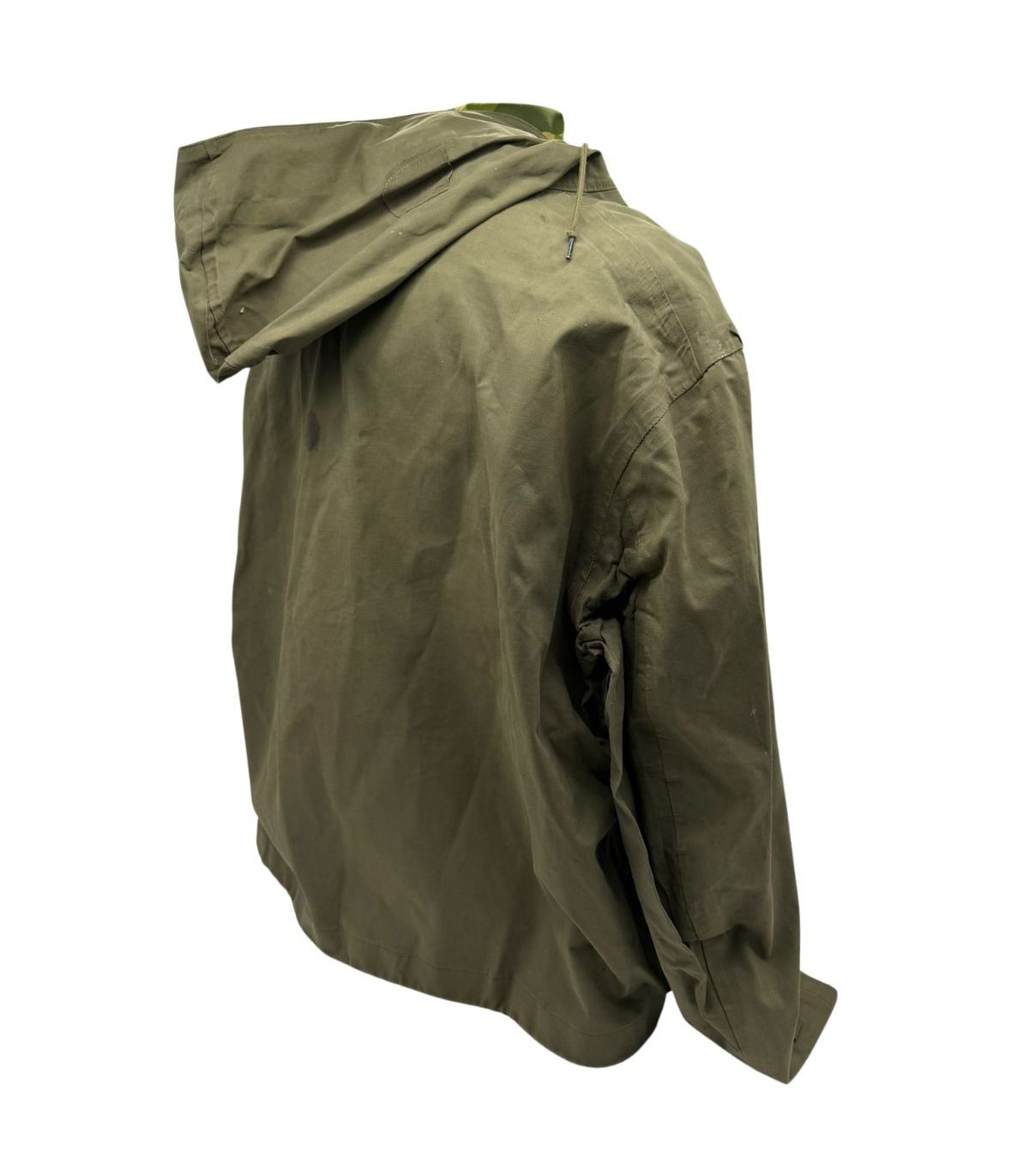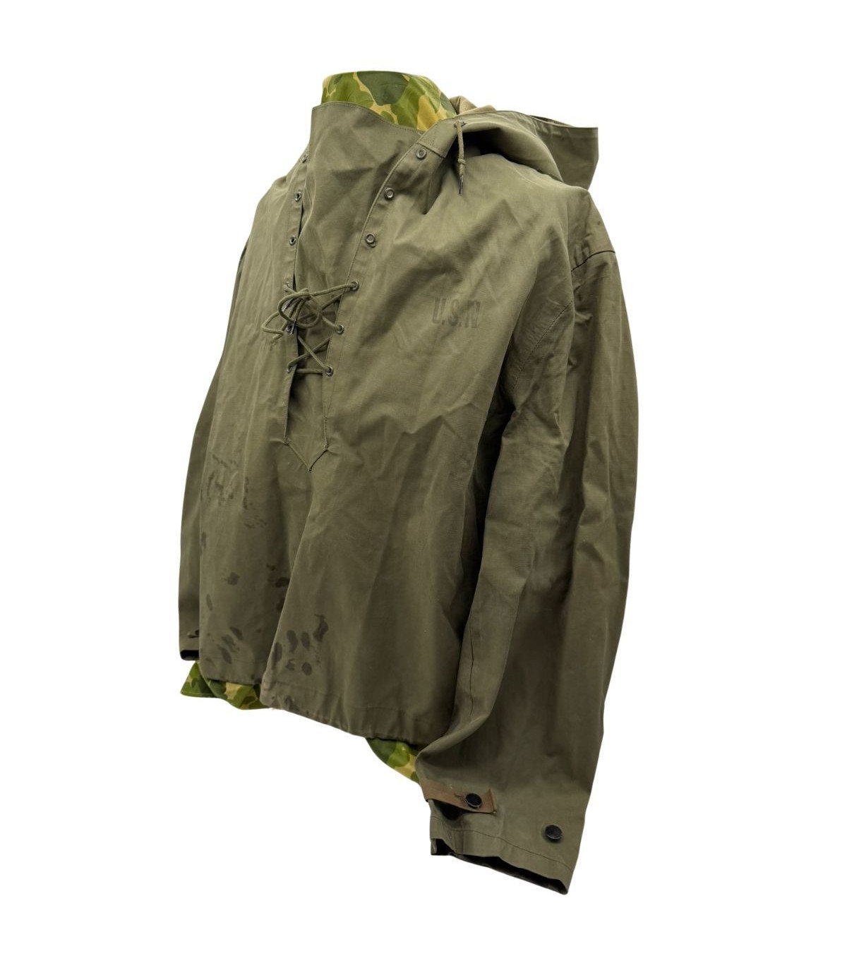 Cette parka de pluie (Rain Parka) de type N-2 était l'équipement standard des marins de l'US Navy pour affronter les conditions météo les plus rudes. Contrairement aux modèles de pont en "Jungle Cloth" doublés de laine, cette version en toile de coton traitée (souvent caoutchoutée ou gommée) est strictement dédiée à l'étanchéité totale contre les paquets de mer et les averses.