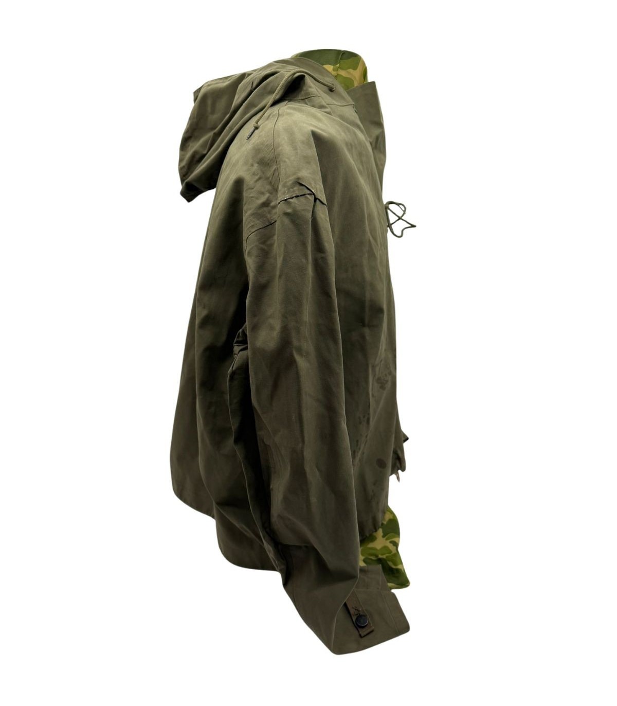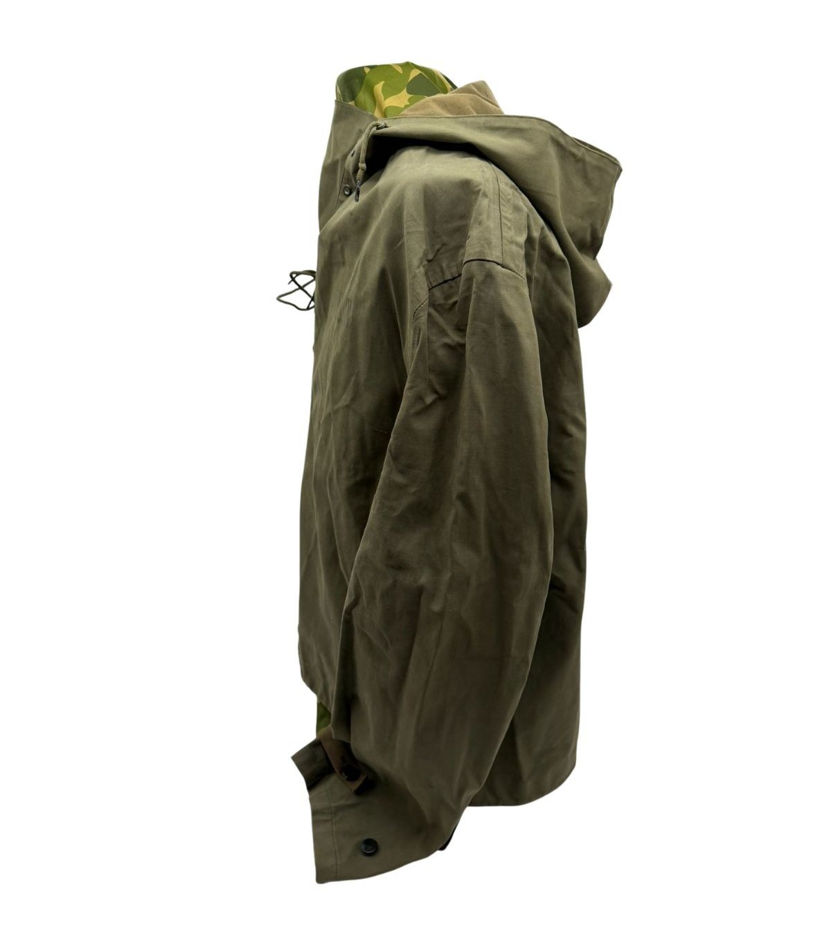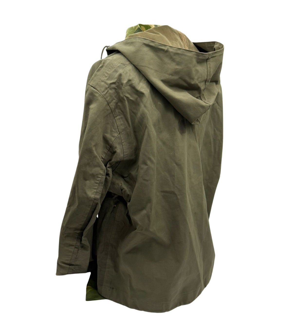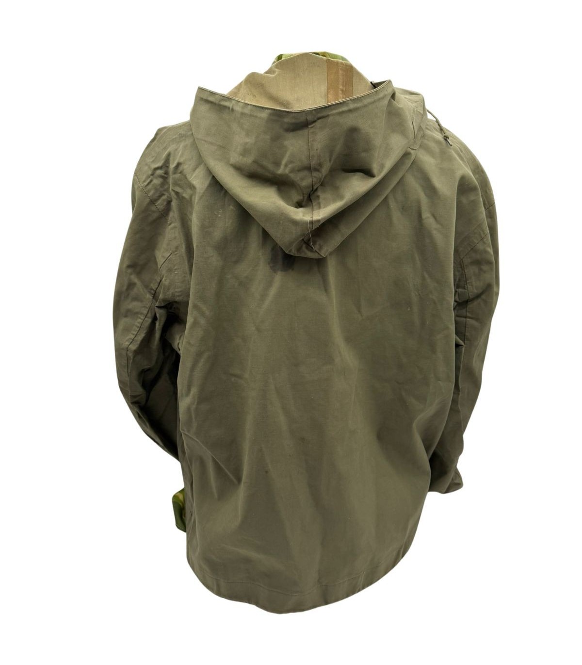 Cette parka de pluie (Rain Parka) de type N-2 était l'équipement standard des marins de l'US Navy pour affronter les conditions météo les plus rudes. Contrairement aux modèles de pont en "Jungle Cloth" doublés de laine, cette version en toile de coton traitée (souvent caoutchoutée ou gommée) est strictement dédiée à l'étanchéité totale contre les paquets de mer et les averses.