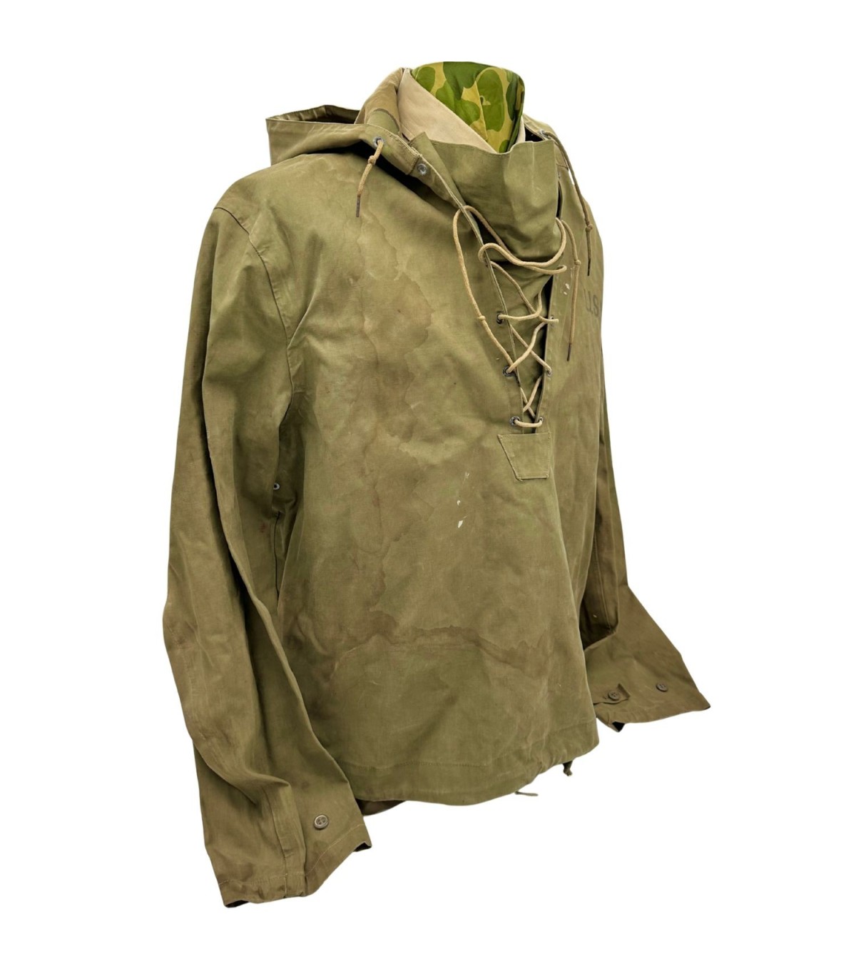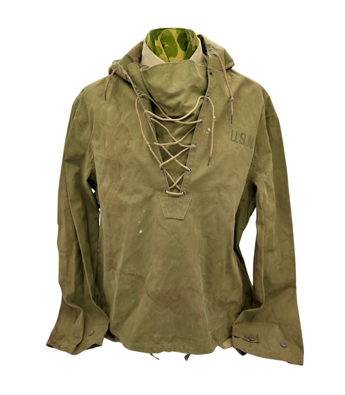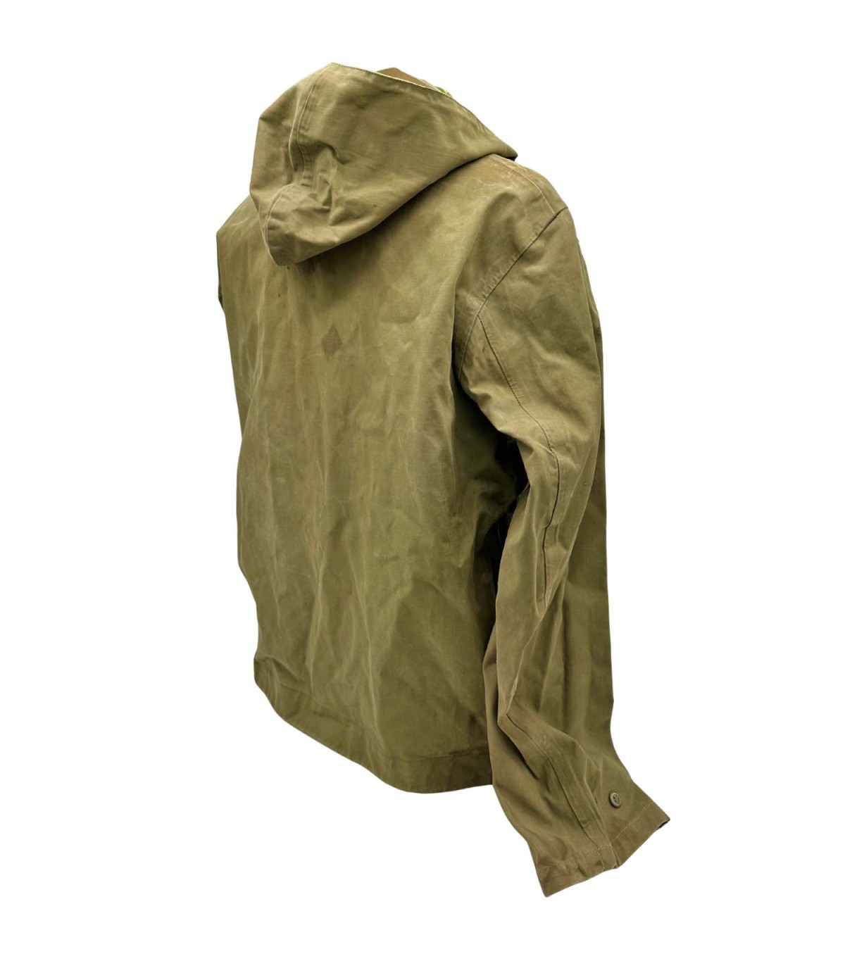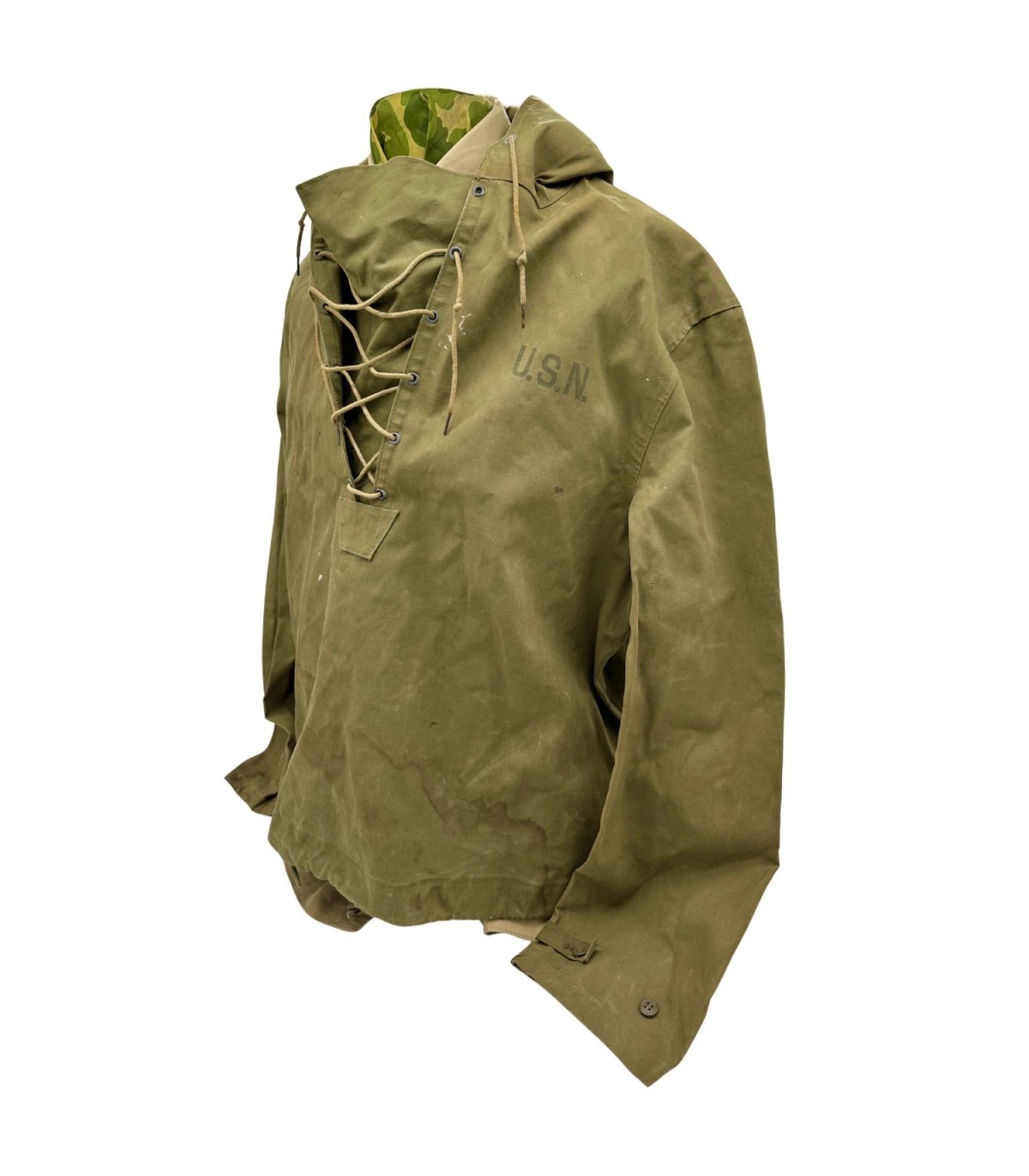 Parka de pont de l'US Navy d'origine deuxième guerre. Ce parka de pont en tissu recouvert de résine synthétique était utilisé par le personnel de la Navy. Ce type de veste fut utilisée lors du débarquement par les membres de la Navy à bord des LCVP. Le marquage "U.S.N" est parfaitement lisible. La veste est souple et ne présente de défauts, ou déchirures.
