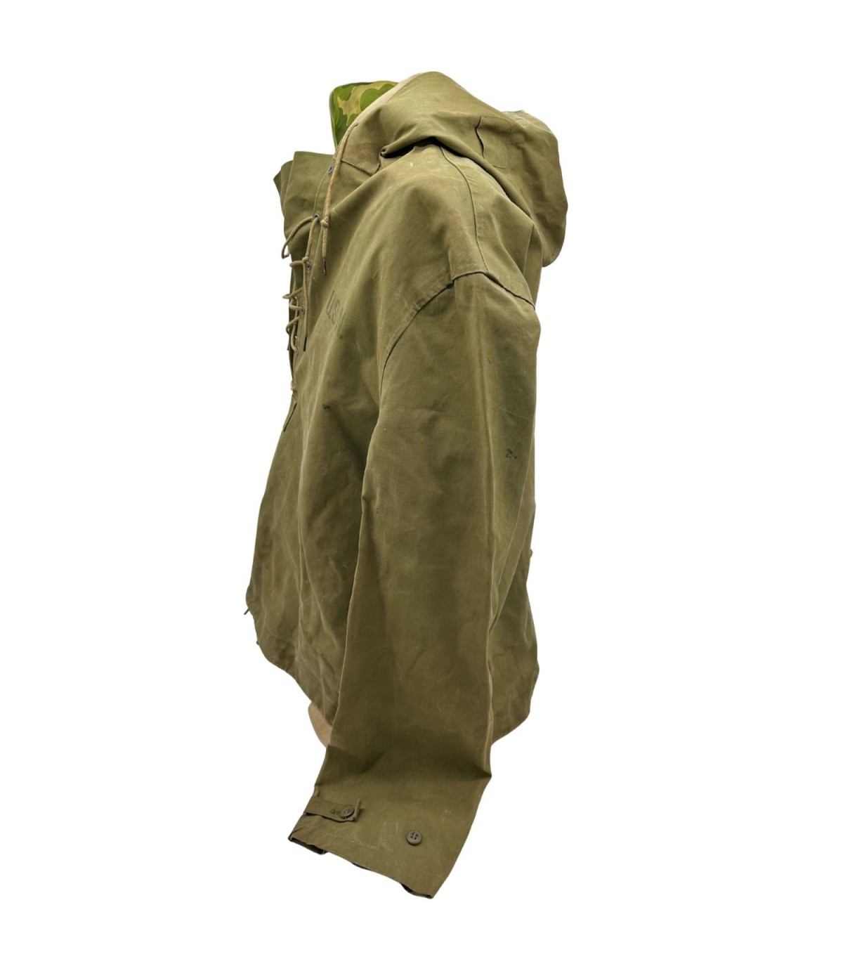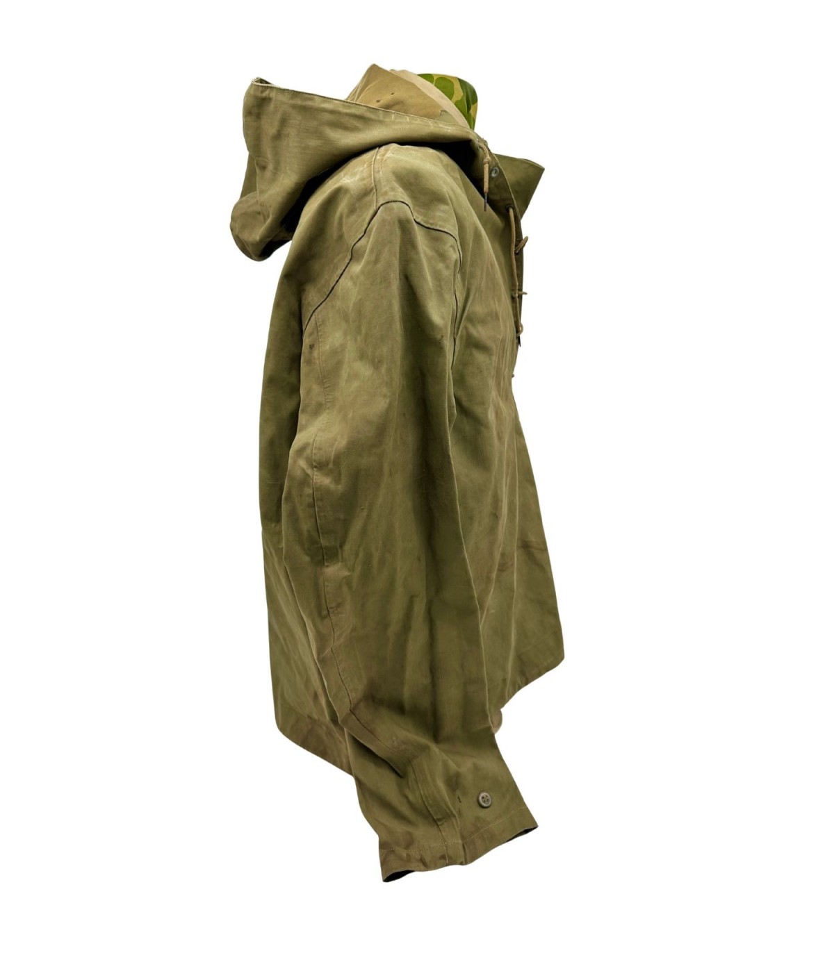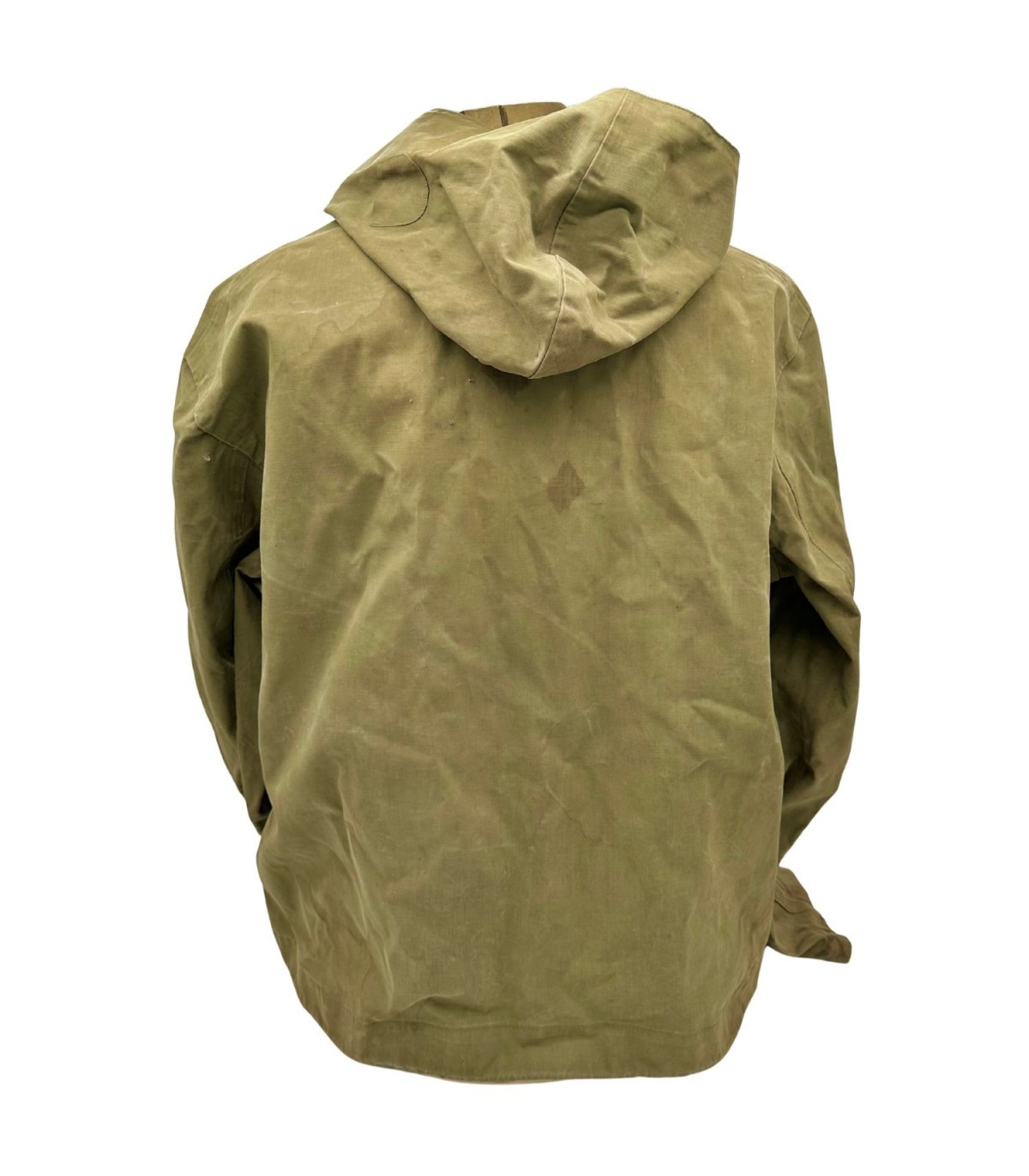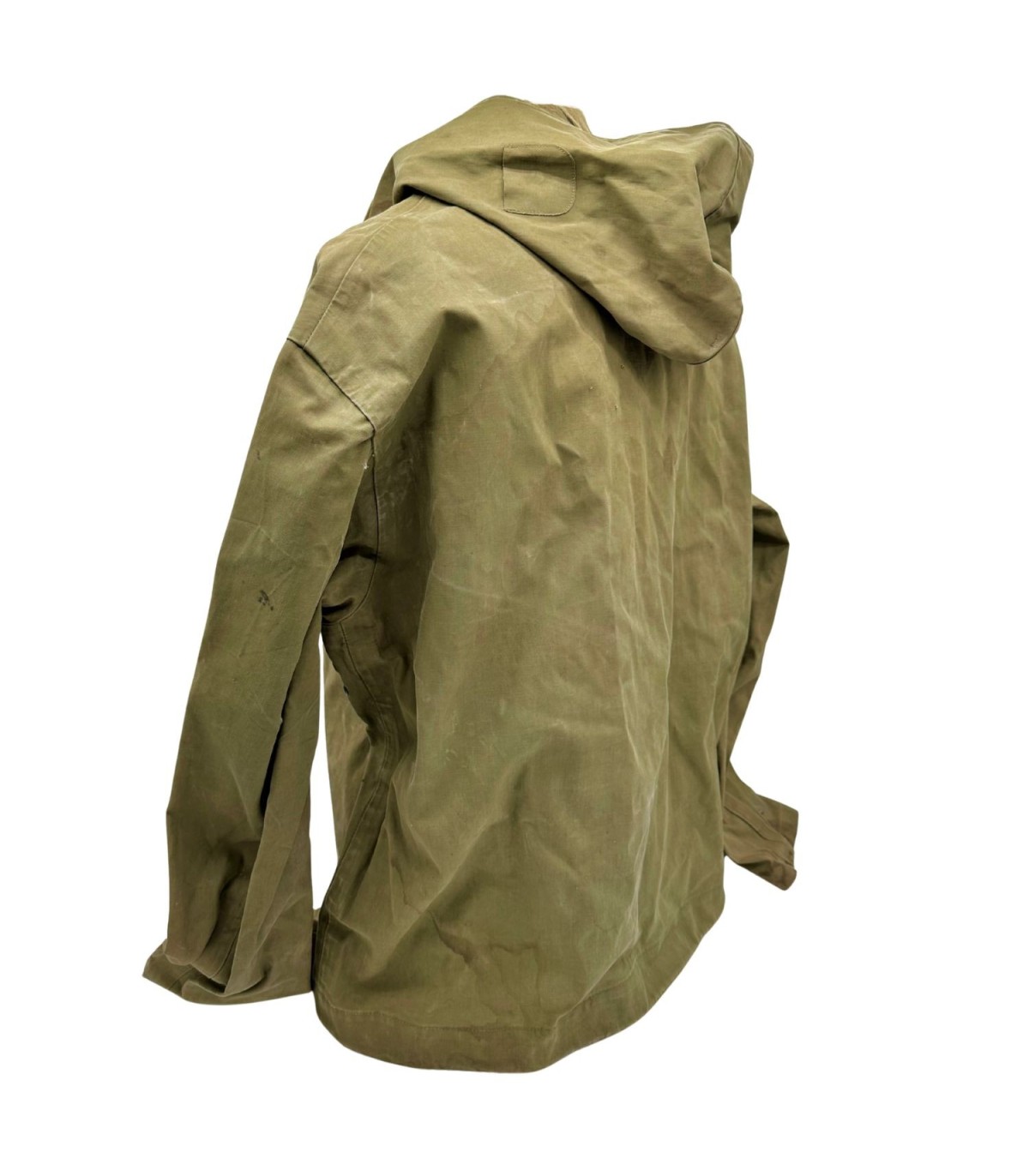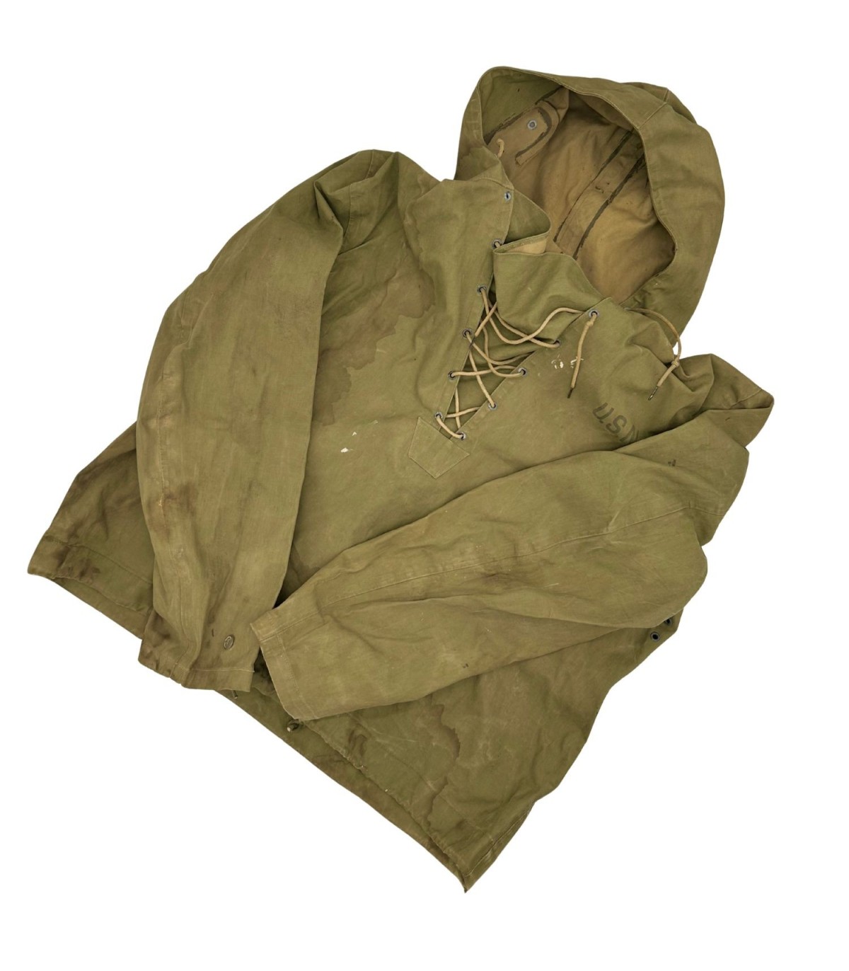 Parka de pont de l'US Navy d'origine deuxième guerre. Ce parka de pont en tissu recouvert de résine synthétique était utilisé par le personnel de la Navy. Ce type de veste fut utilisée lors du débarquement par les membres de la Navy à bord des LCVP. Le marquage "U.S.N" est parfaitement lisible. La veste est souple et ne présente de défauts, ou déchirures.