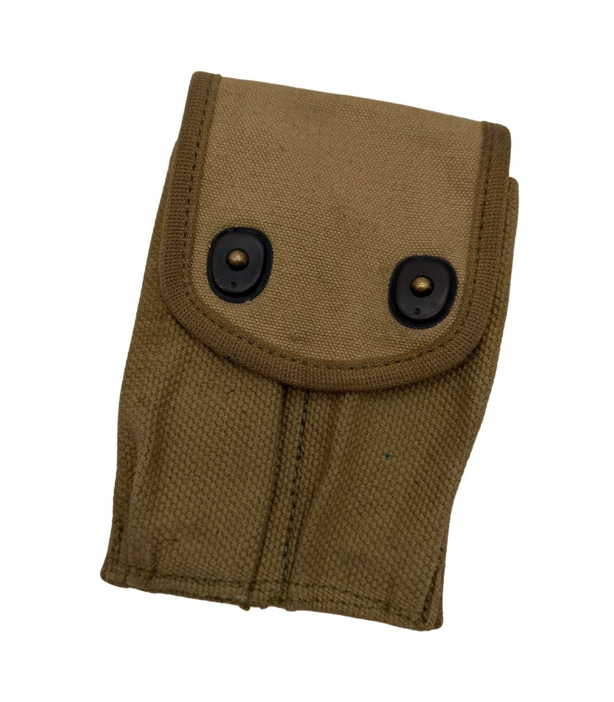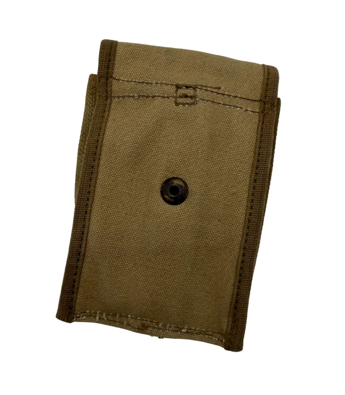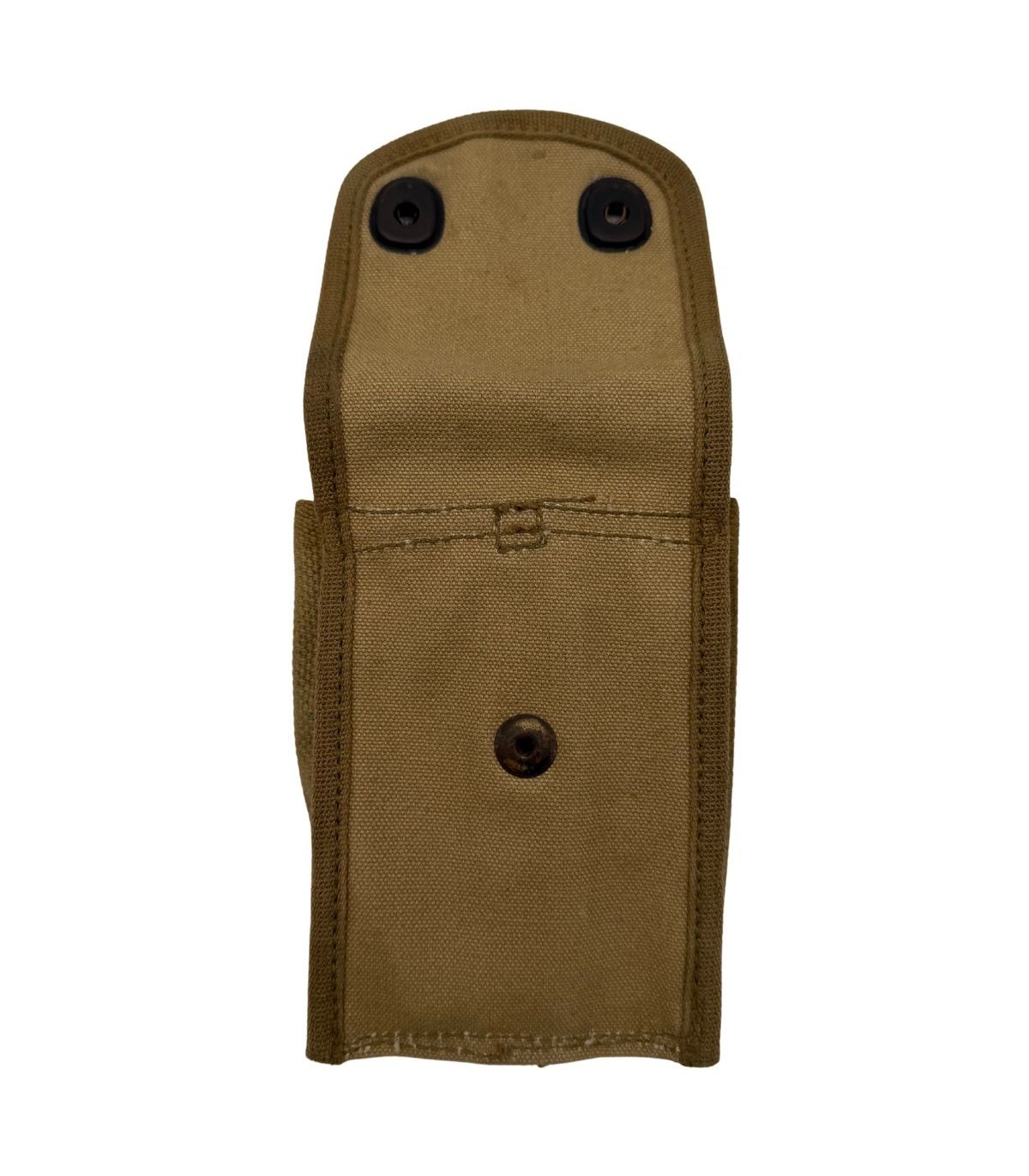 Cette pochette porte-chargeurs est un exemplaire iconique de l'équipement de l'American Expeditionary Forces (AEF). Fabriquée à la toute fin de la Première Guerre mondiale, elle était destinée à accompagner le pistolet Colt M1911 au ceinturon des officiers, des sous-officiers et des troupes spécialisées.