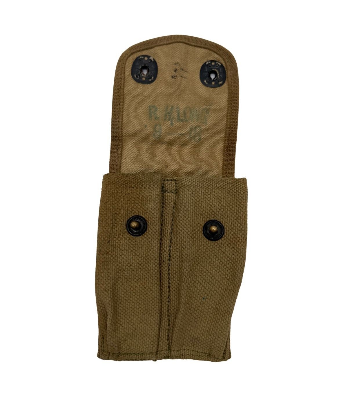 Pochette porte-chargeurs emblématique de l’American Expeditionary Forces, destinée au pistolet Colt M1911 durant la Première Guerre mondiale. Fabriquée par R.H. Long et datée septembre 1918, elle représente l’équipement de la toute fin du conflit, à la veille de l’Armistice.