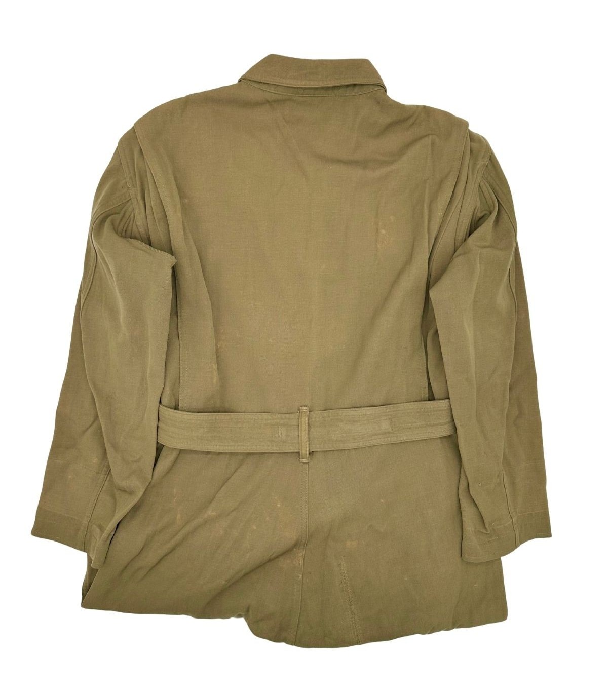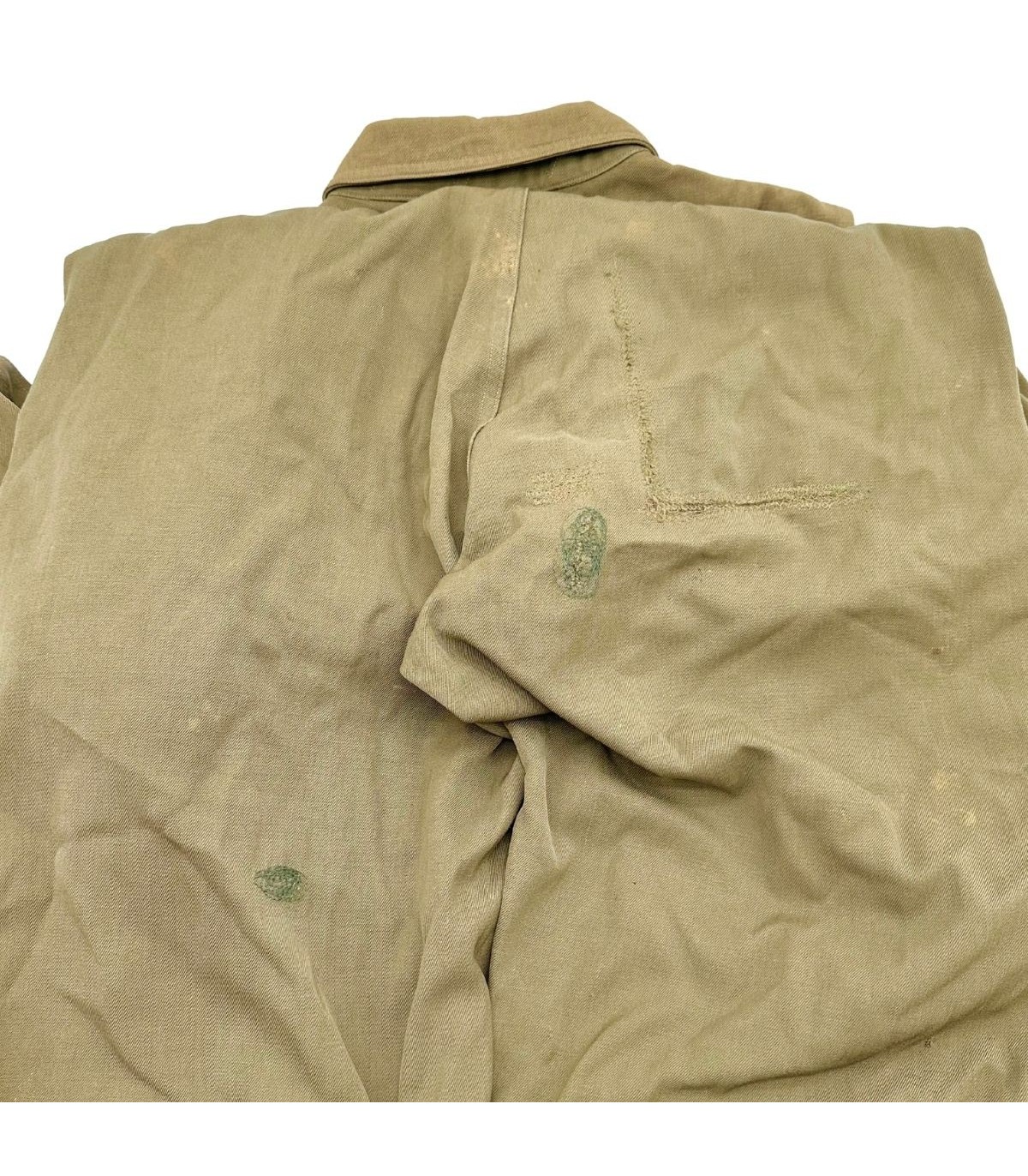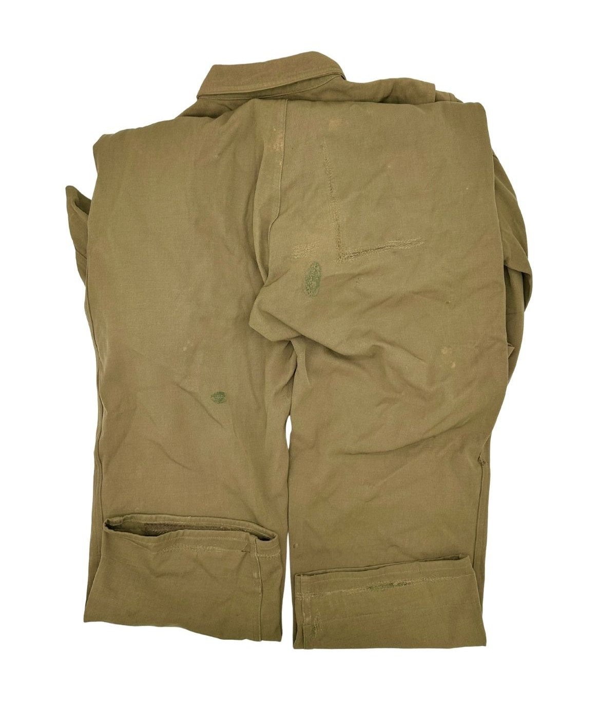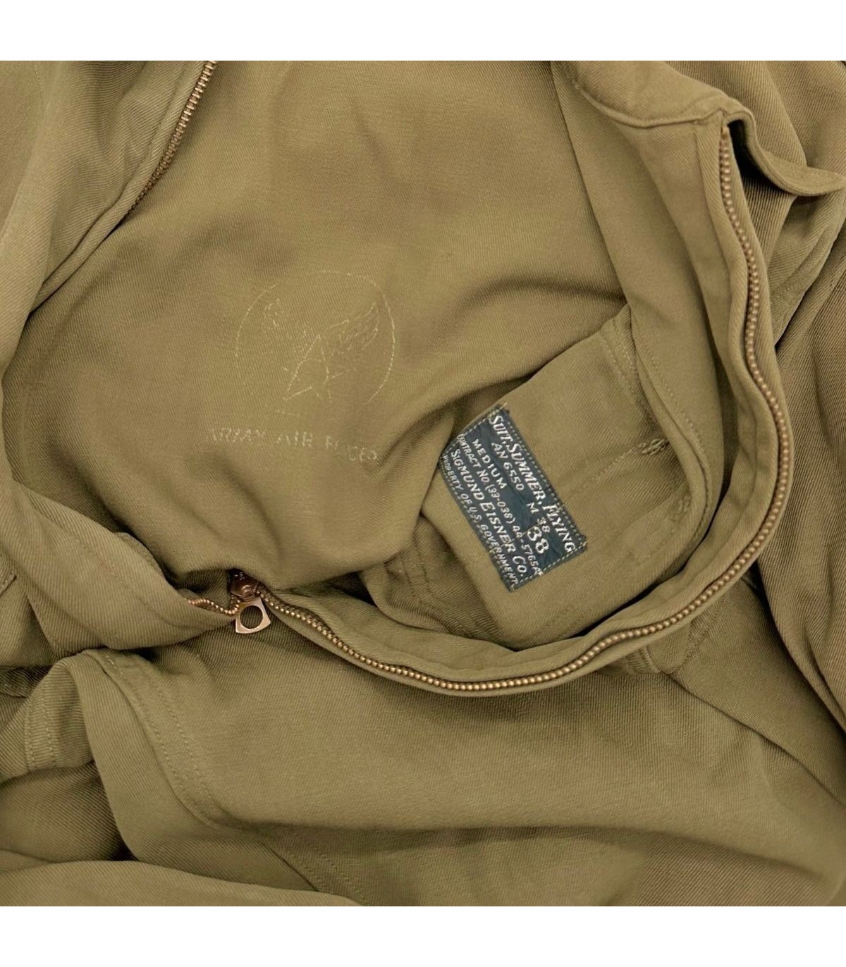 Cette combinaison est un spécimen 100 % original, clairement daté de 1944, ce qui la place au cœur des grandes offensives aériennes de la guerre. Elle porte la référence réglementaire AN-6550 (un standard conjoint Armée-Marine). Sa taille 38 est une taille de présentation et de collection très recherchée. Le tissu en coton ou en gabardine légère, de couleur Olive Drab ou Khaki, est conçu avec de multiples poches à fermeture éclair et des systèmes de réglage pour un accès facile et rapide à l'équipement. L'authenticité est souvent confirmée par les fermetures éclair d'époque (souvent des marques comme Talon ou Conmar).