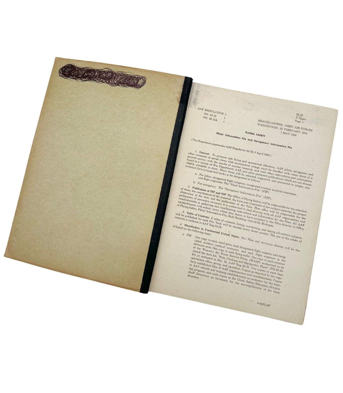 Relié sous la forme d’un classeur à vis métallique, ce document regroupe des consignes techniques, des procédures de vol, des informations de navigation et des protocoles de sécurité vitaux. Il était remis directement aux pilotes pour les préparer aux missions de combat et leur fournir des références rapides et fiables en pleine guerre.