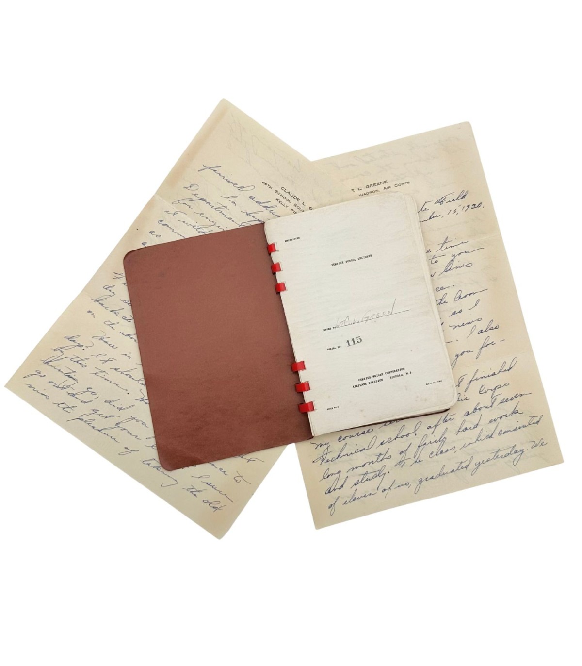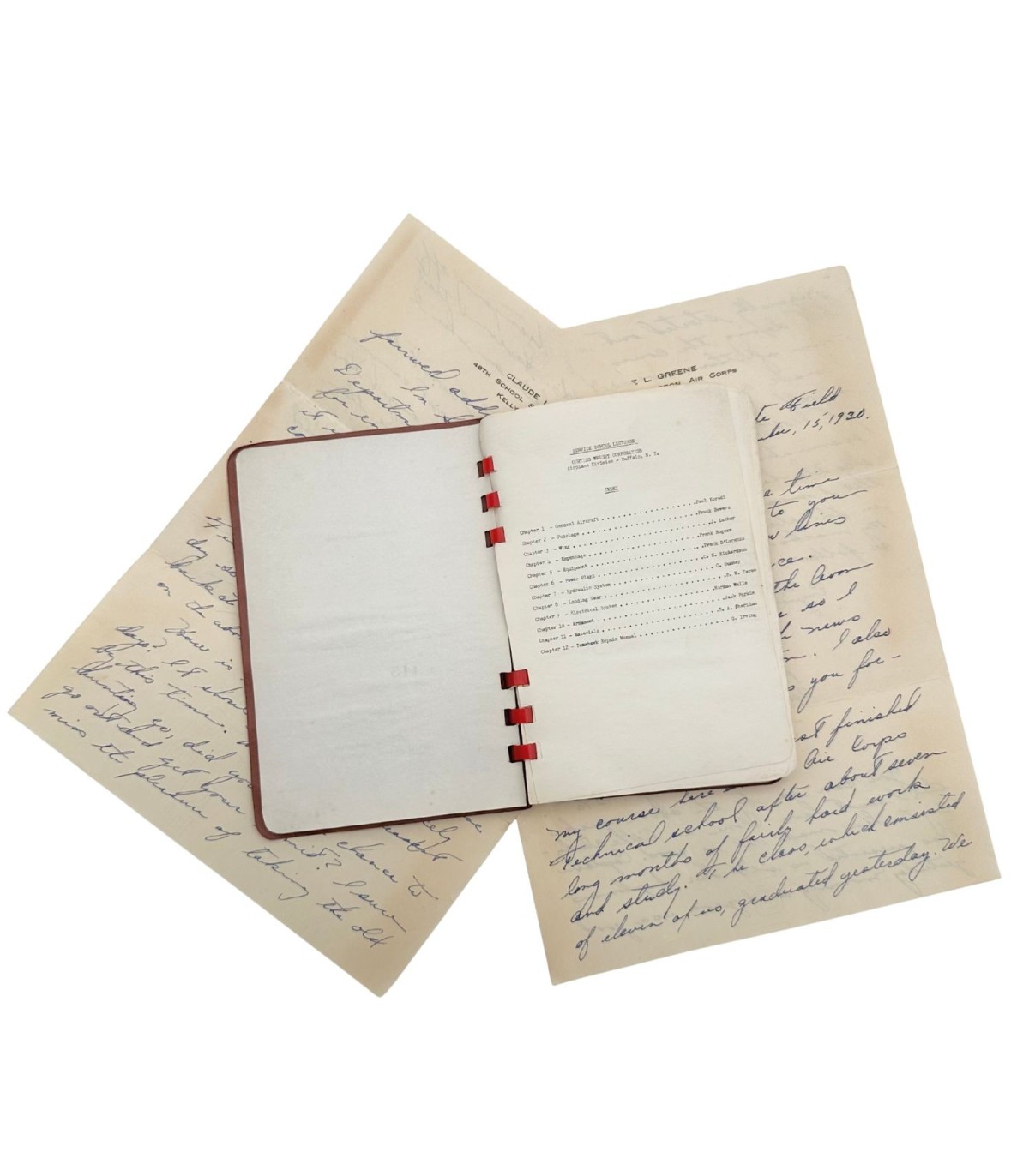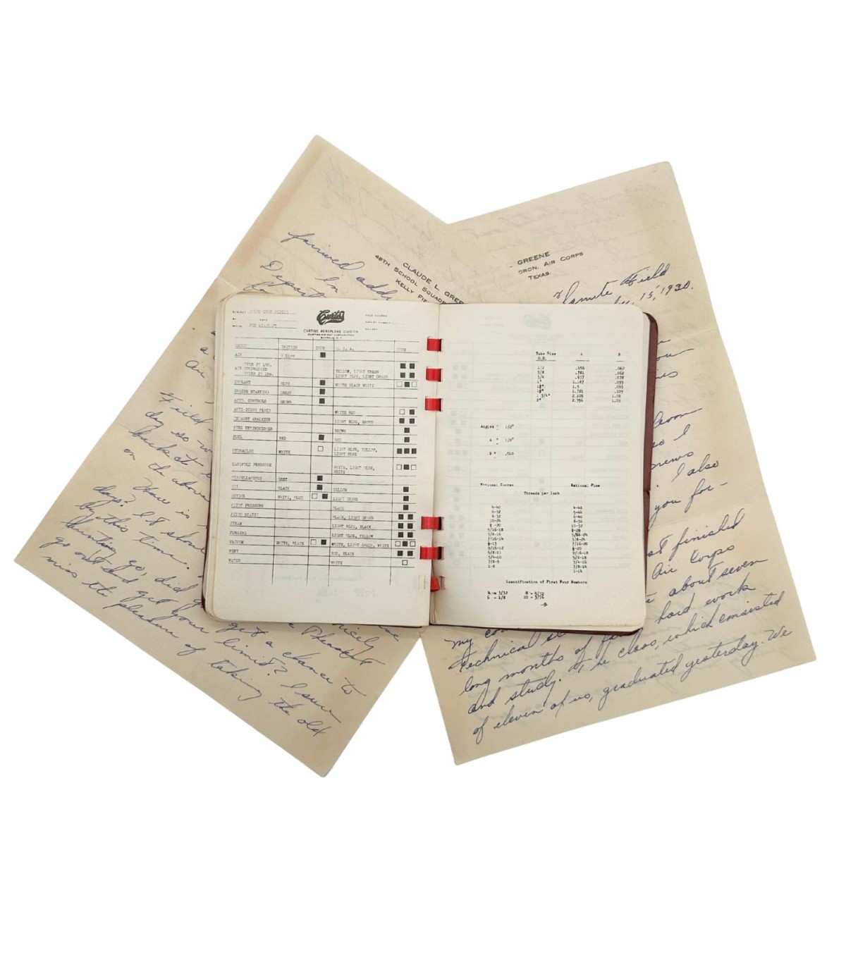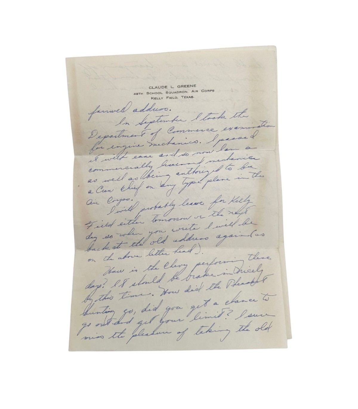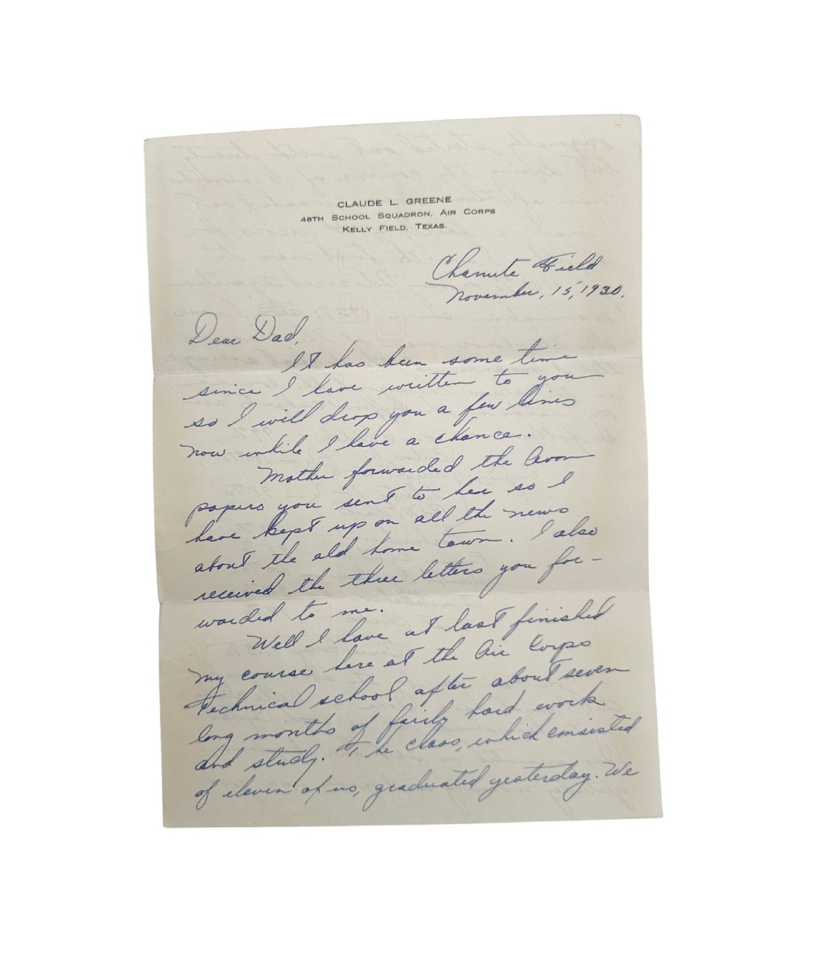 Il est accompagné de 2 lettres rédigée en 1930 par Claude L. GREENE du 48th School Squadron, Air Corps - KELLY FIELD. TEXAS.