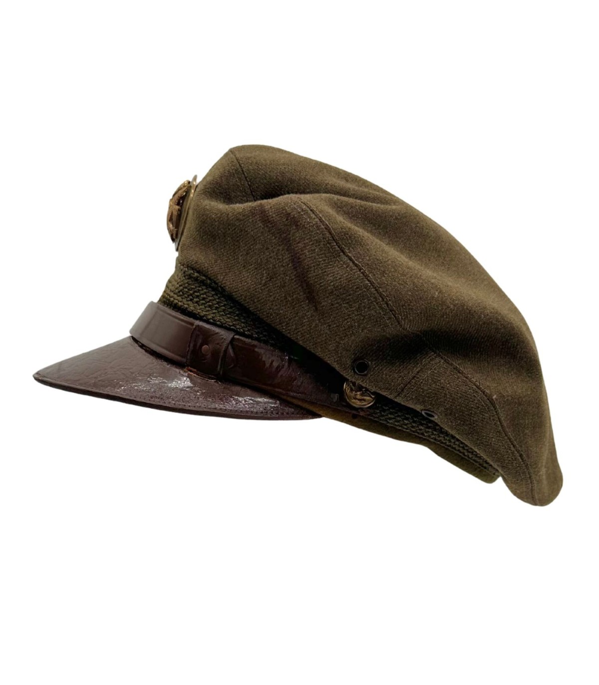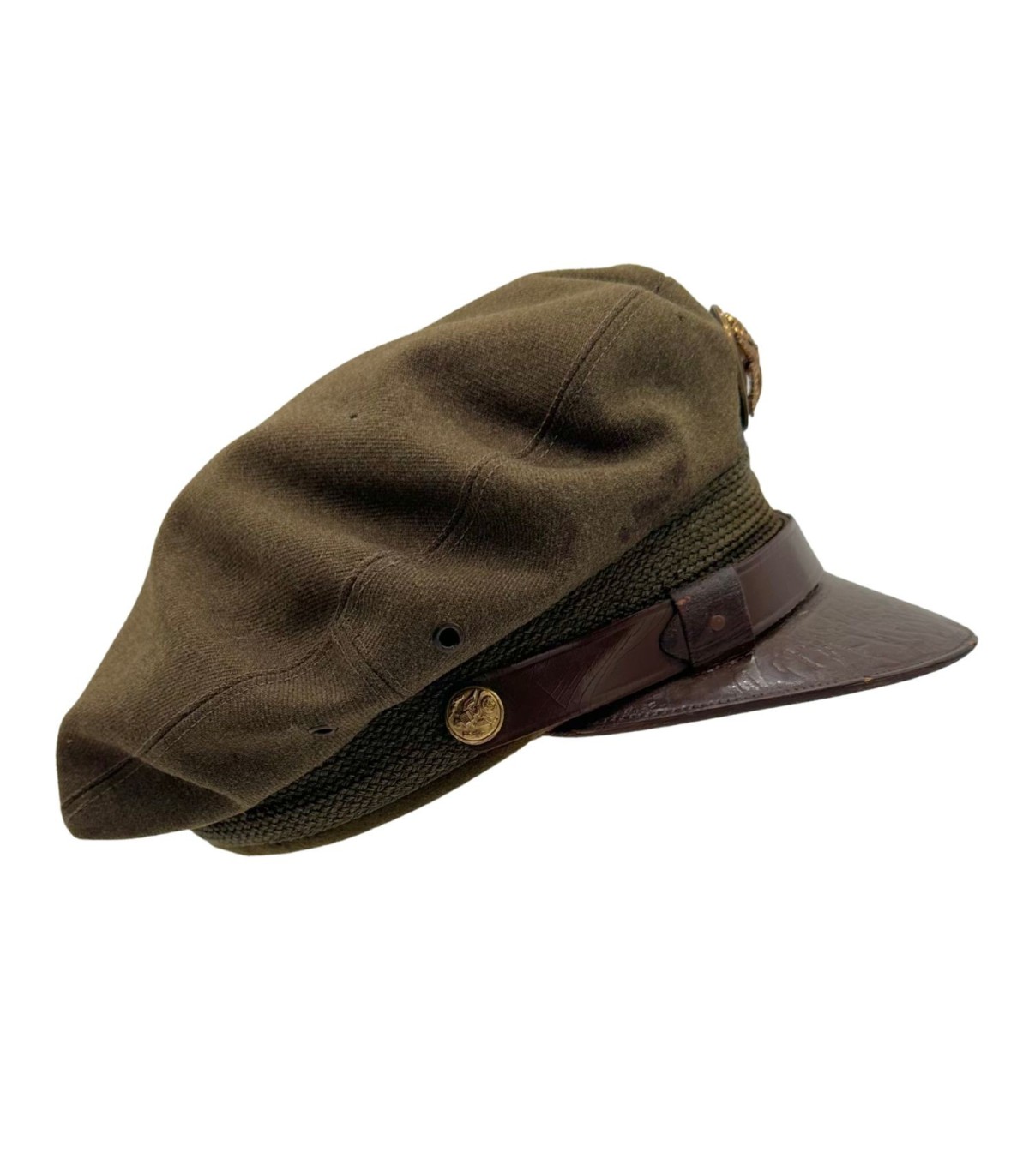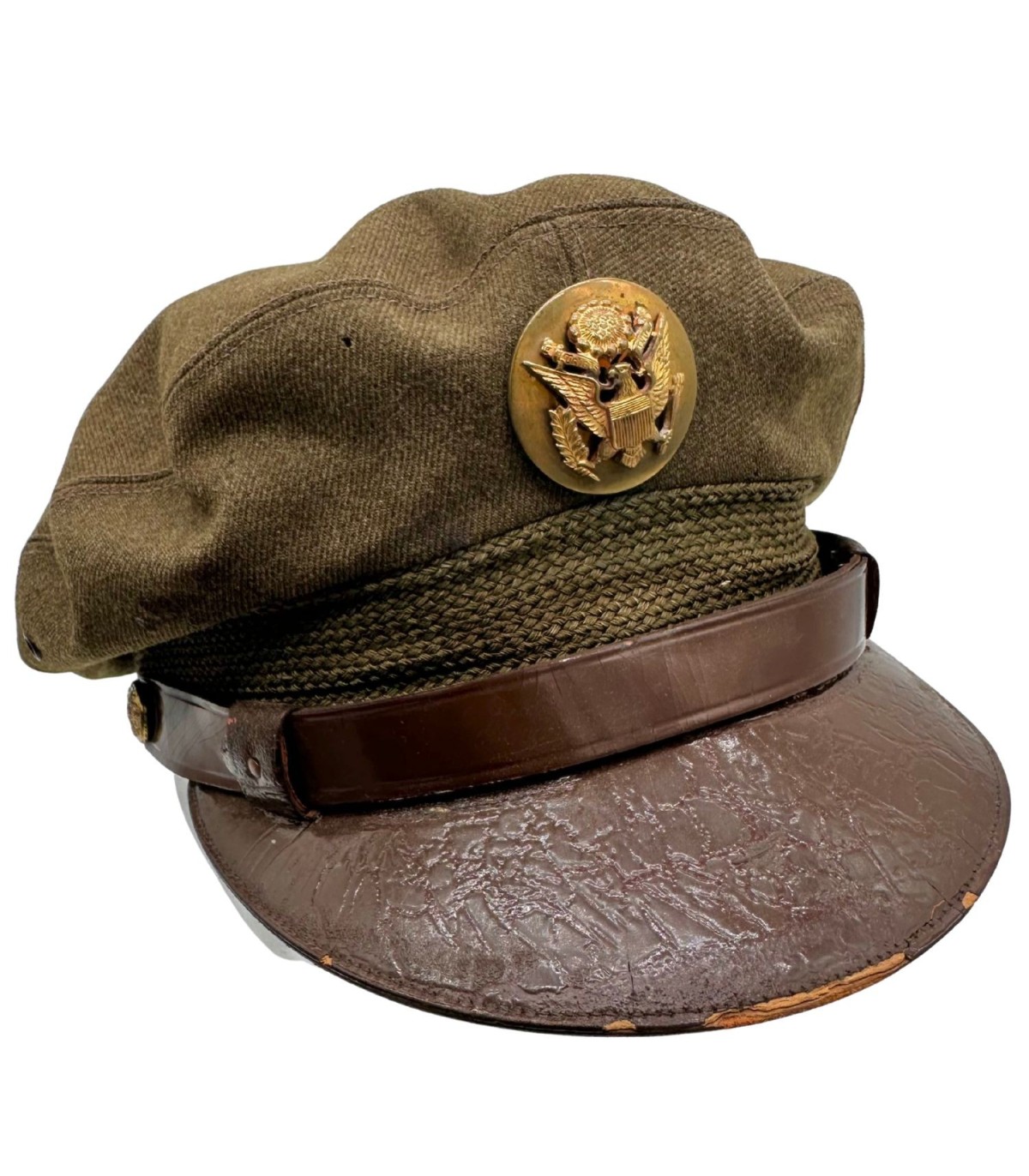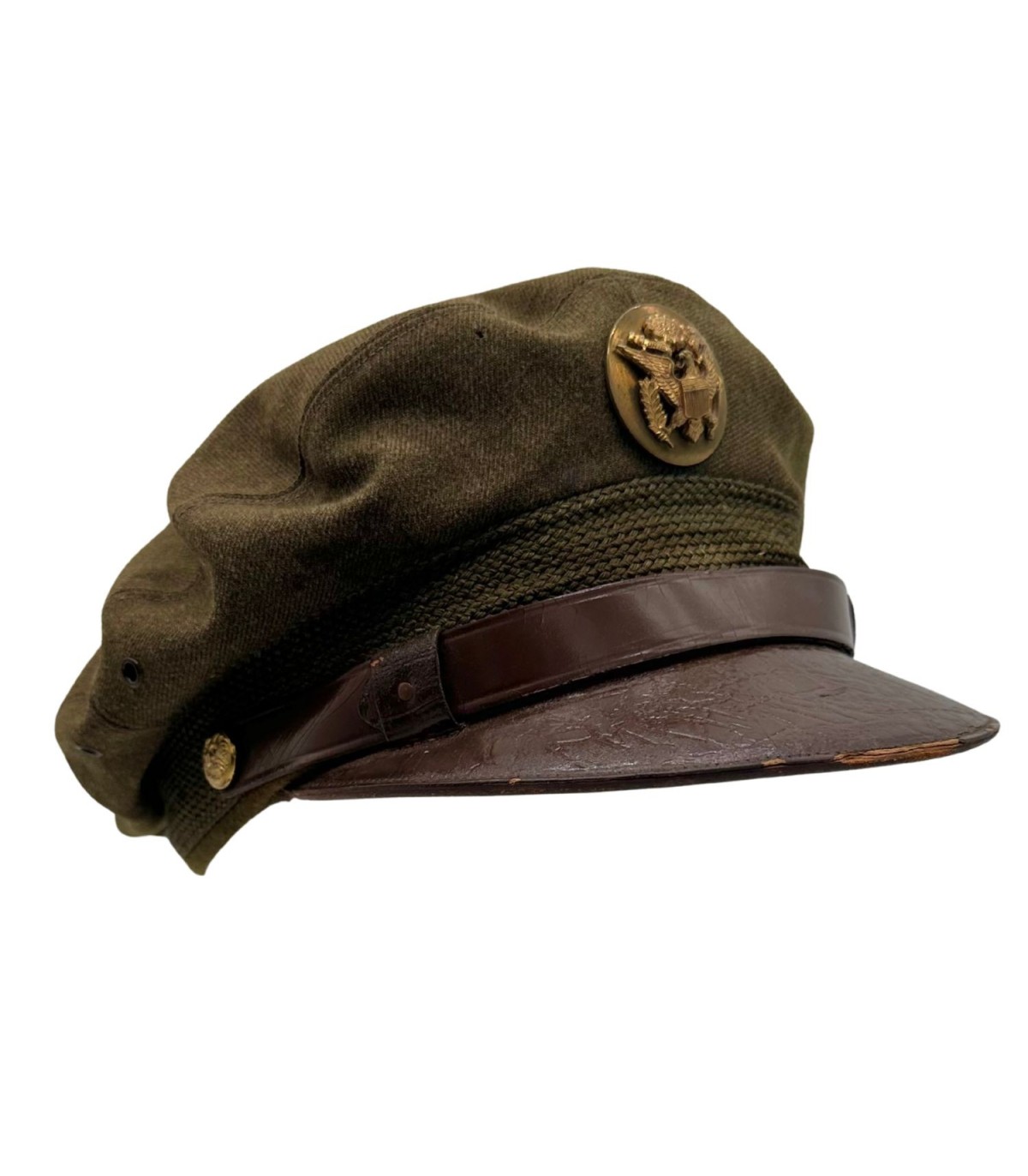 Portée par les équipages de B-17, B-24 et P-51, cette casquette en gabardine de laine Olive Drab était accompagnée de la rondache troupe ou insigne de casquette officier.