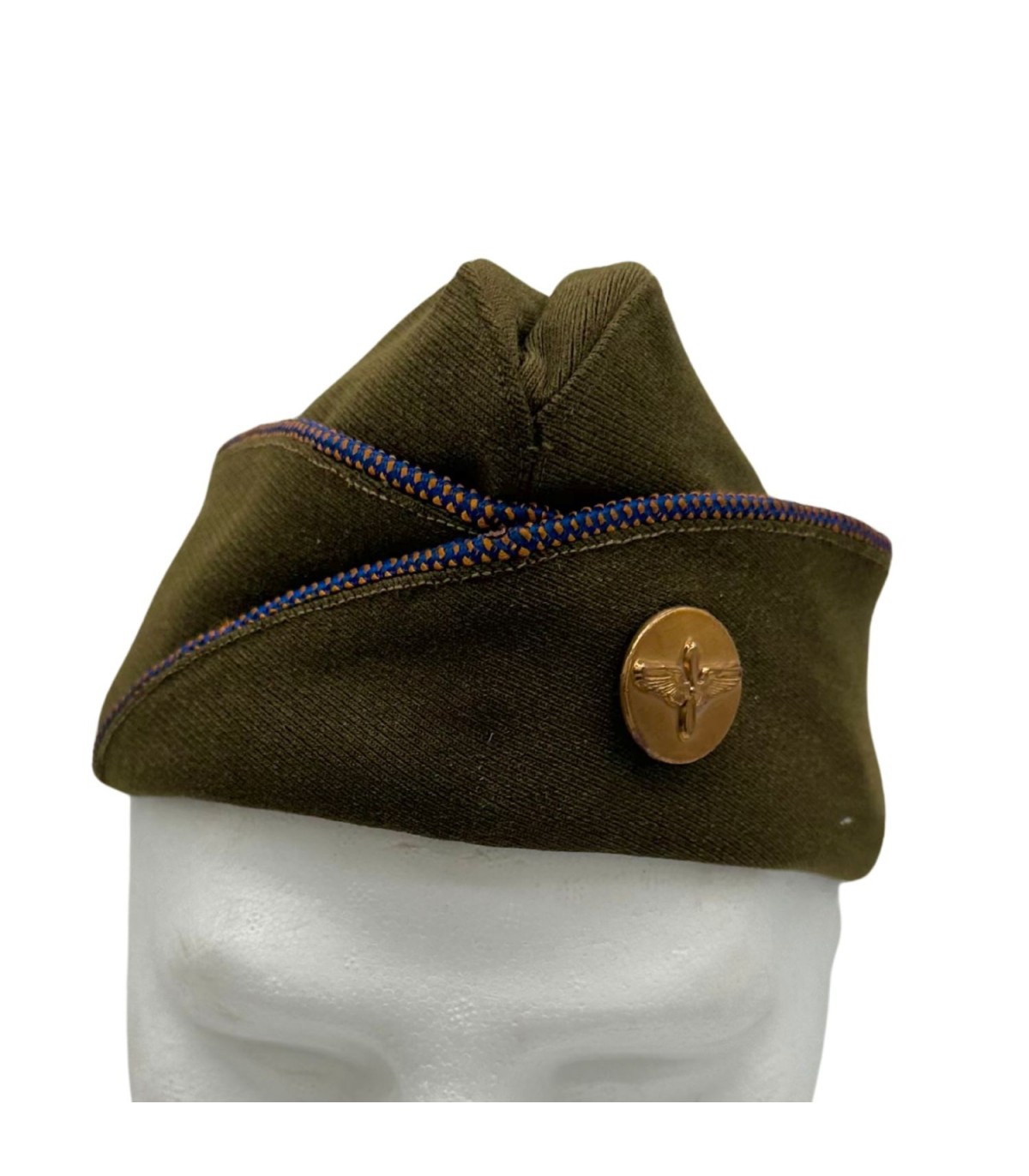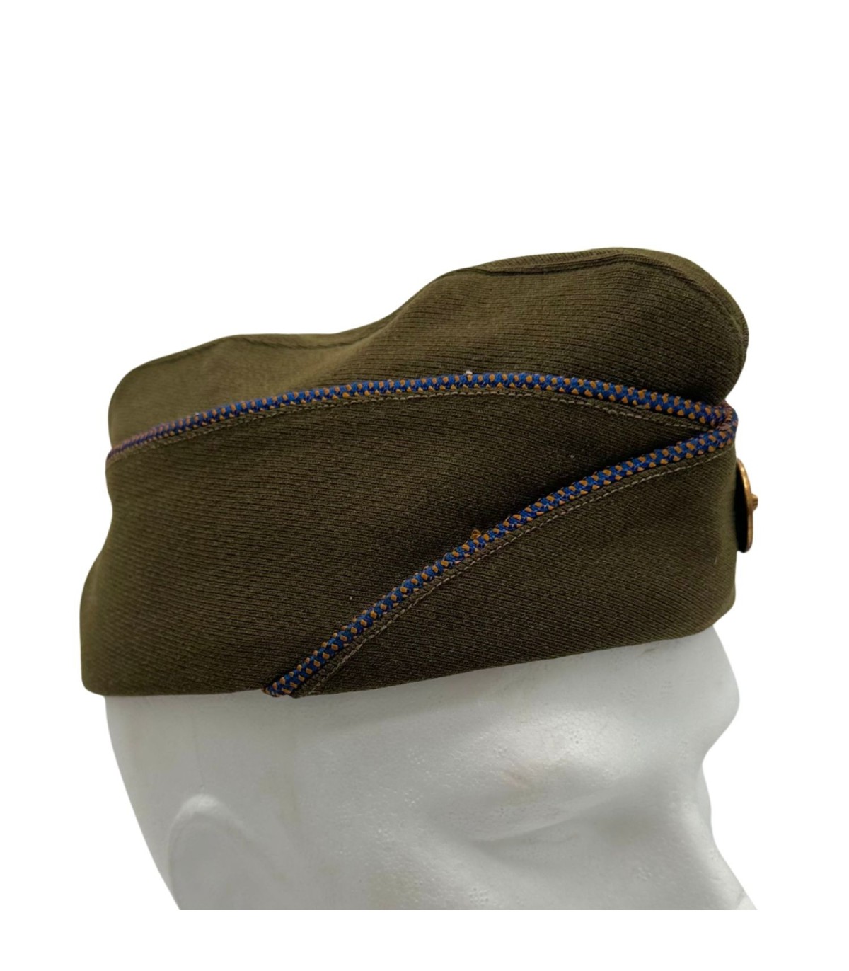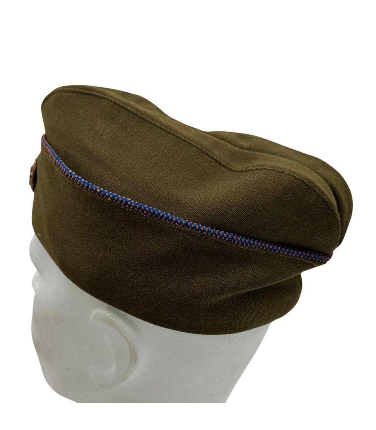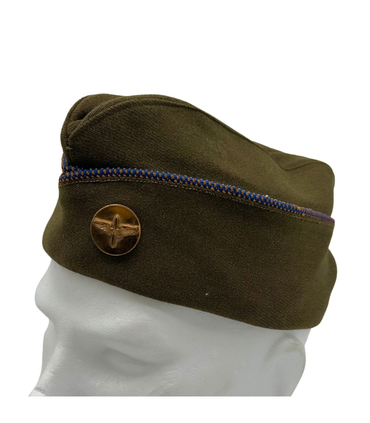 Cet exemplaire est un article 100 % authentique de l'époque. Il est de taille 7 US, une taille courante et recherchée pour l'affichage. Il présente les caractéristiques spécifiques de l'USAAF : un liseré (piping) en tissu bleu et orange bordant la coiffe. Ce code de couleur est unique à l'USAAF et est crucial pour l'identification de l'arme. De plus, il est livré avec son insigne de col USAAF (le Collar Insignia) apposé sur le côté, garantissant un ensemble complet et prêt à être exposé.