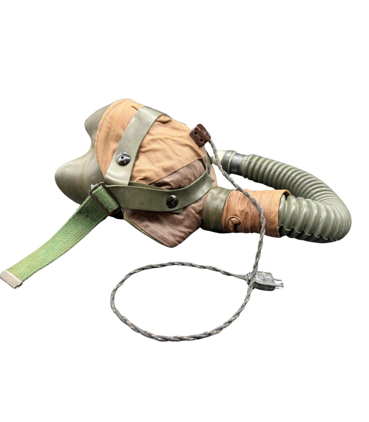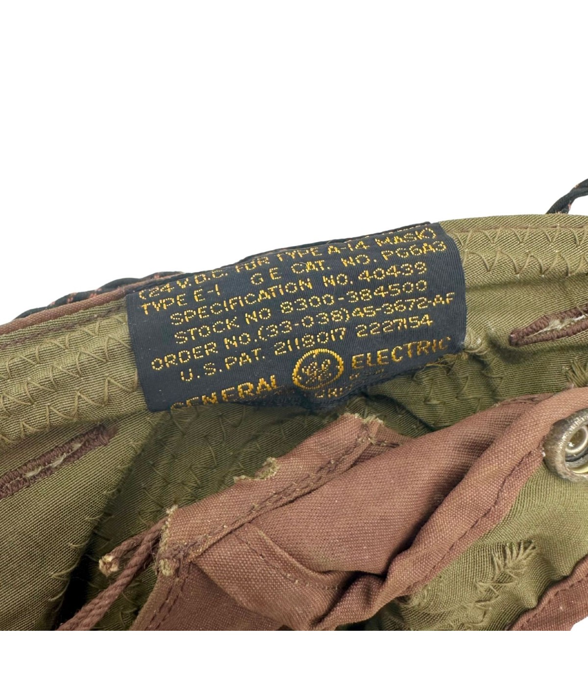 Accessoire de vol extrêmement rare, la housse chauffante E-1 était utilisée par les équipages de l’USAAF pour empêcher le gel du masque à oxygène A-14 lors des missions en haute altitude. Reliée au système électrique de l’avion, elle maintenait les soupapes du masque hors-gel, garantissant une alimentation en oxygène fiable même à –40°C.