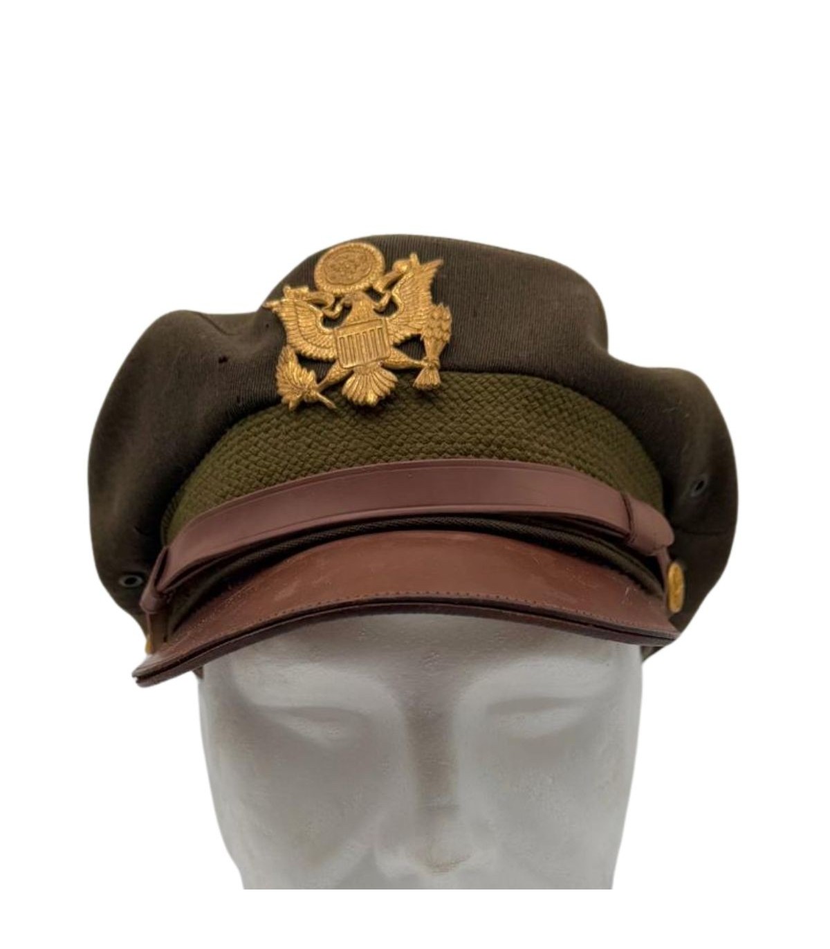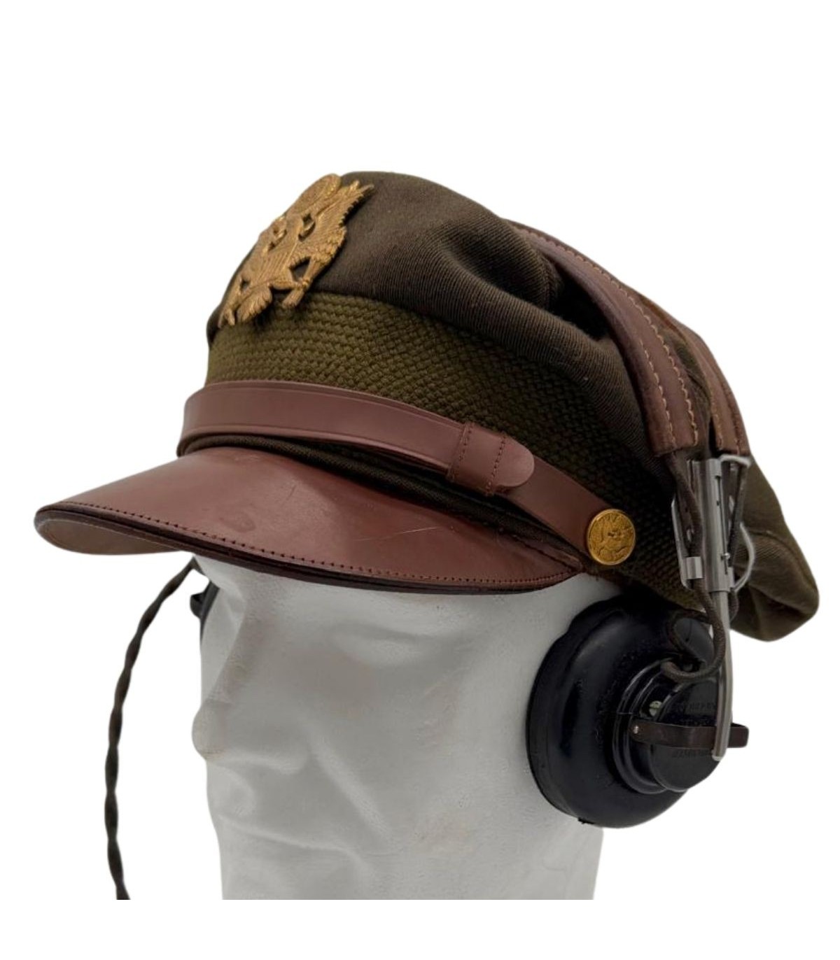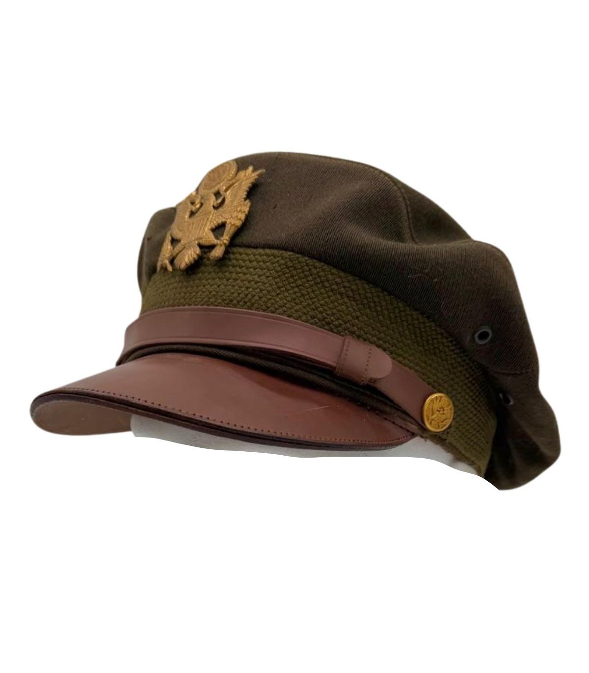 Casquette de vol emblématique des pilotes de l’US Army Air Forces durant la Seconde Guerre mondiale. Modèle dit « Crusher », reconnaissable à sa construction souple et à sa visière flexible, conçue pour le port du casque radio et devenue un symbole iconique des aviateurs.