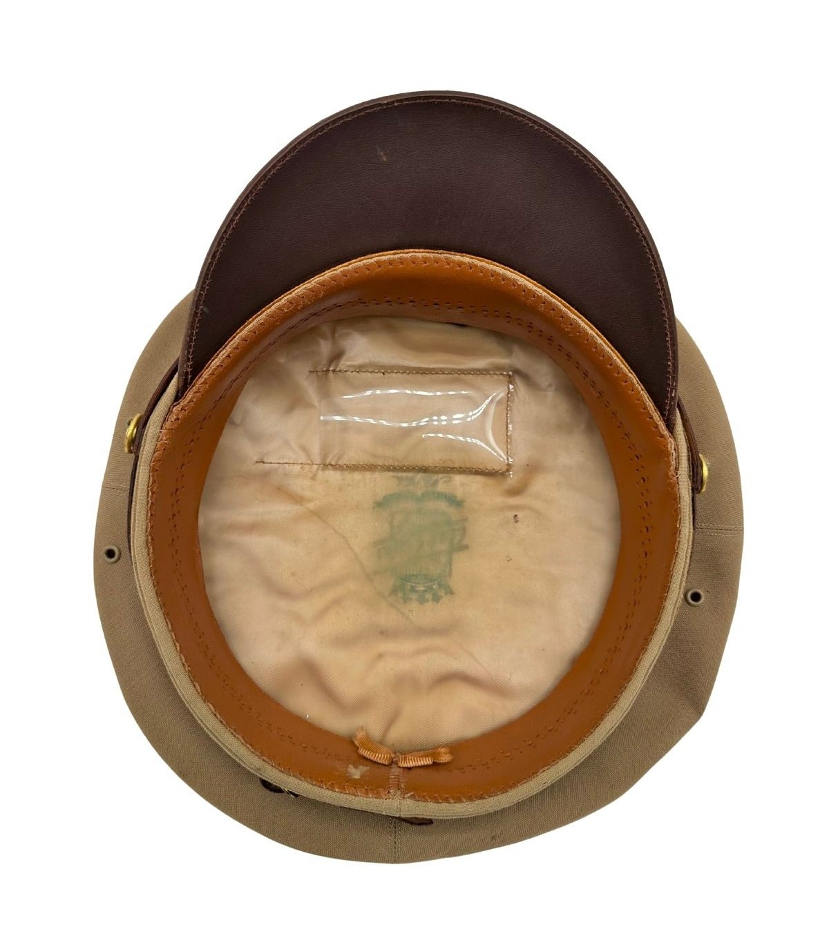 Il s'agit d'une fabrication de tailleur de haute qualité. Bien que le nom du fabricant soit aujourd'hui masqué par l'opacité naturelle du plastique de protection interne (un phénomène courant dû au vieillissement du mica/celluloïd), la finesse des coutures, la qualité du tissu et la souplesse du cuir témoignent d'un achat privé de luxe, typique des officiers de l'Air Force.