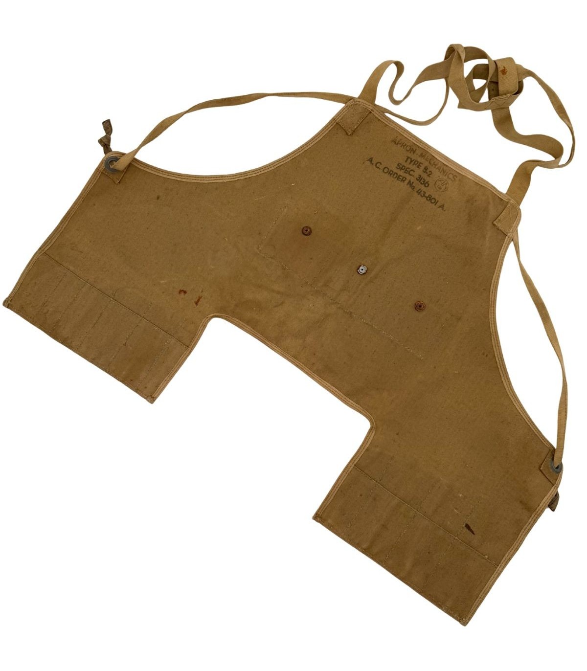 Le tablier Type B-2 est l'équipement de protection spécifique utilisé par le personnel au sol de l'Army Air Corps. Plus qu'une simple protection, c'est l'uniforme de travail de ceux qui assuraient la maintenance des moteurs de bombardiers et de chasseurs sur les bases aériennes d'Angleterre ou du Pacifique.