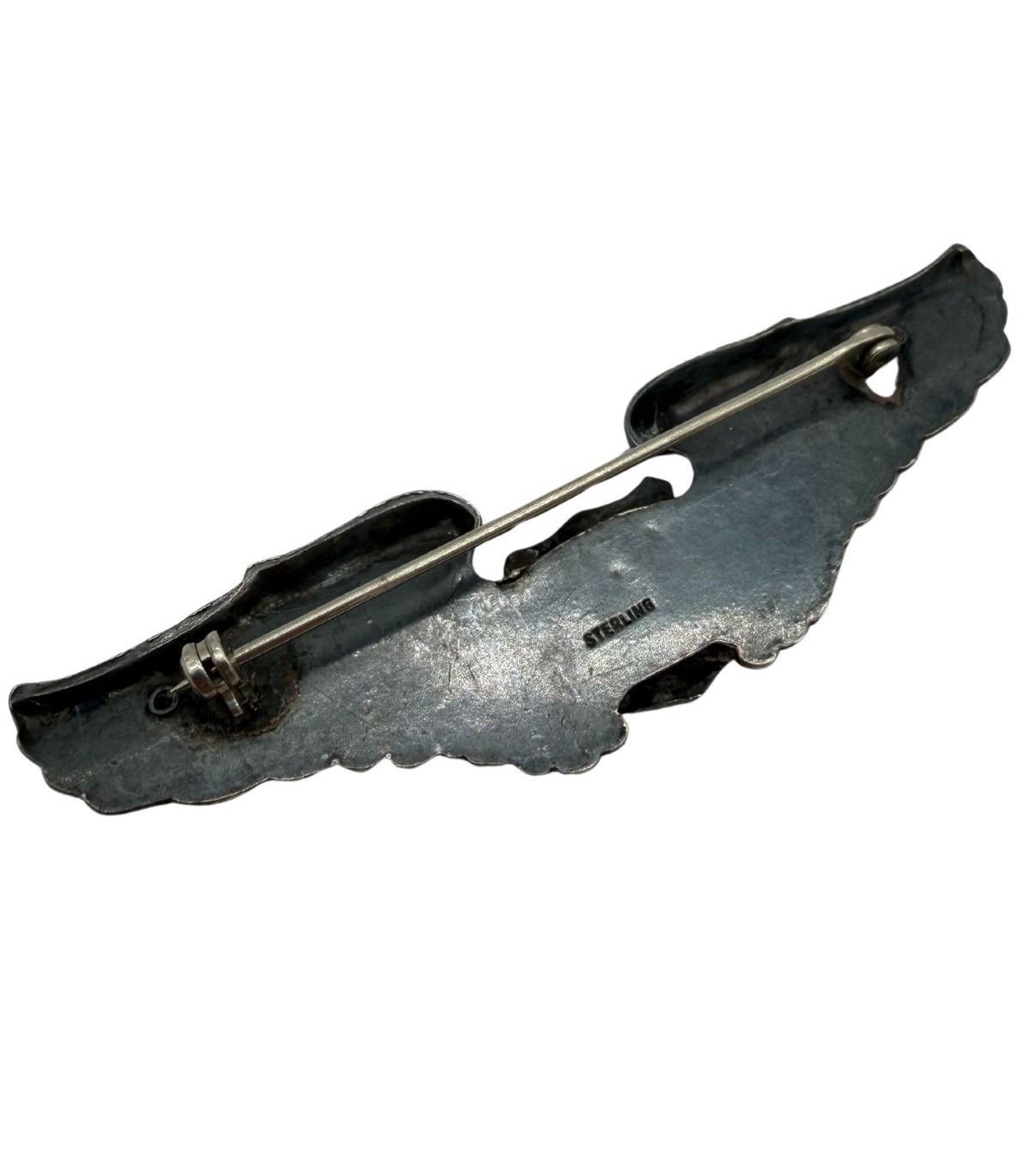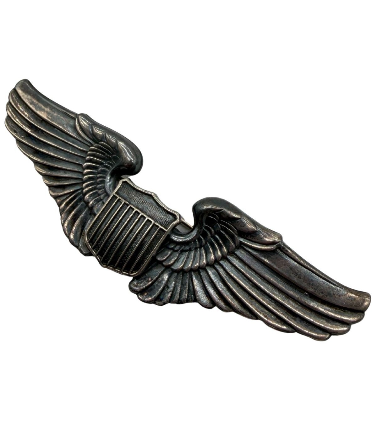 Fabriqué en argent massif (STERLING), il mesure 3 pouces et dispose d’un système d’attache Pin Back d’origine, solide et fonctionnel. Les détails des ailes et du blason central sont nets, avec une patine naturelle conservant tout le caractère historique.