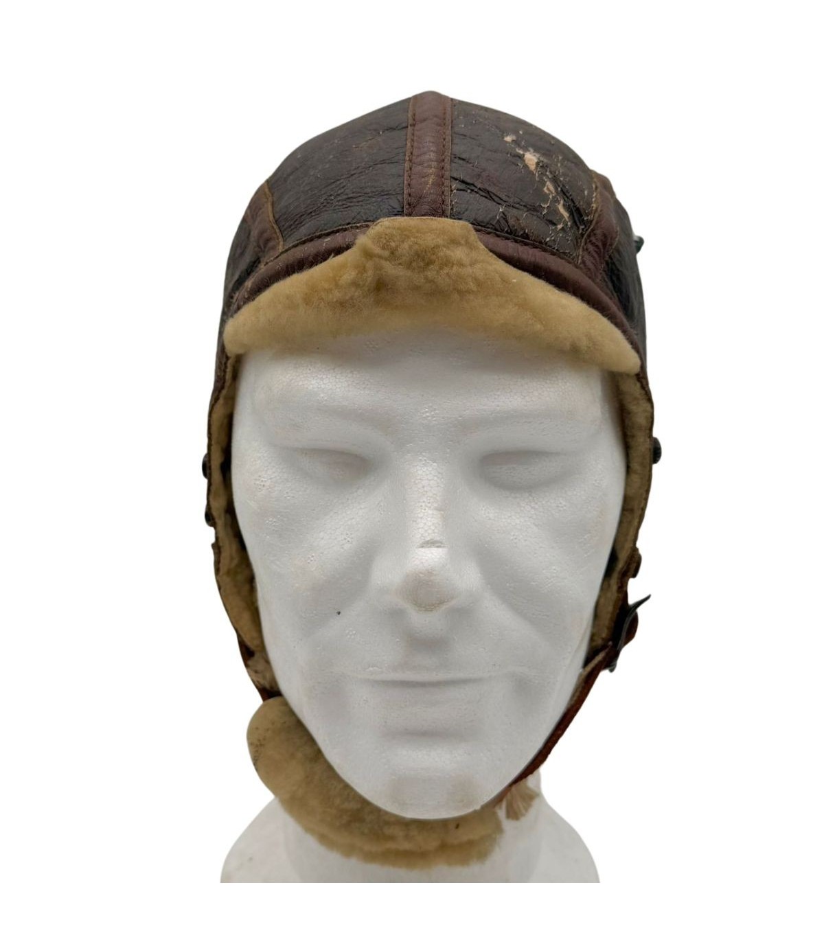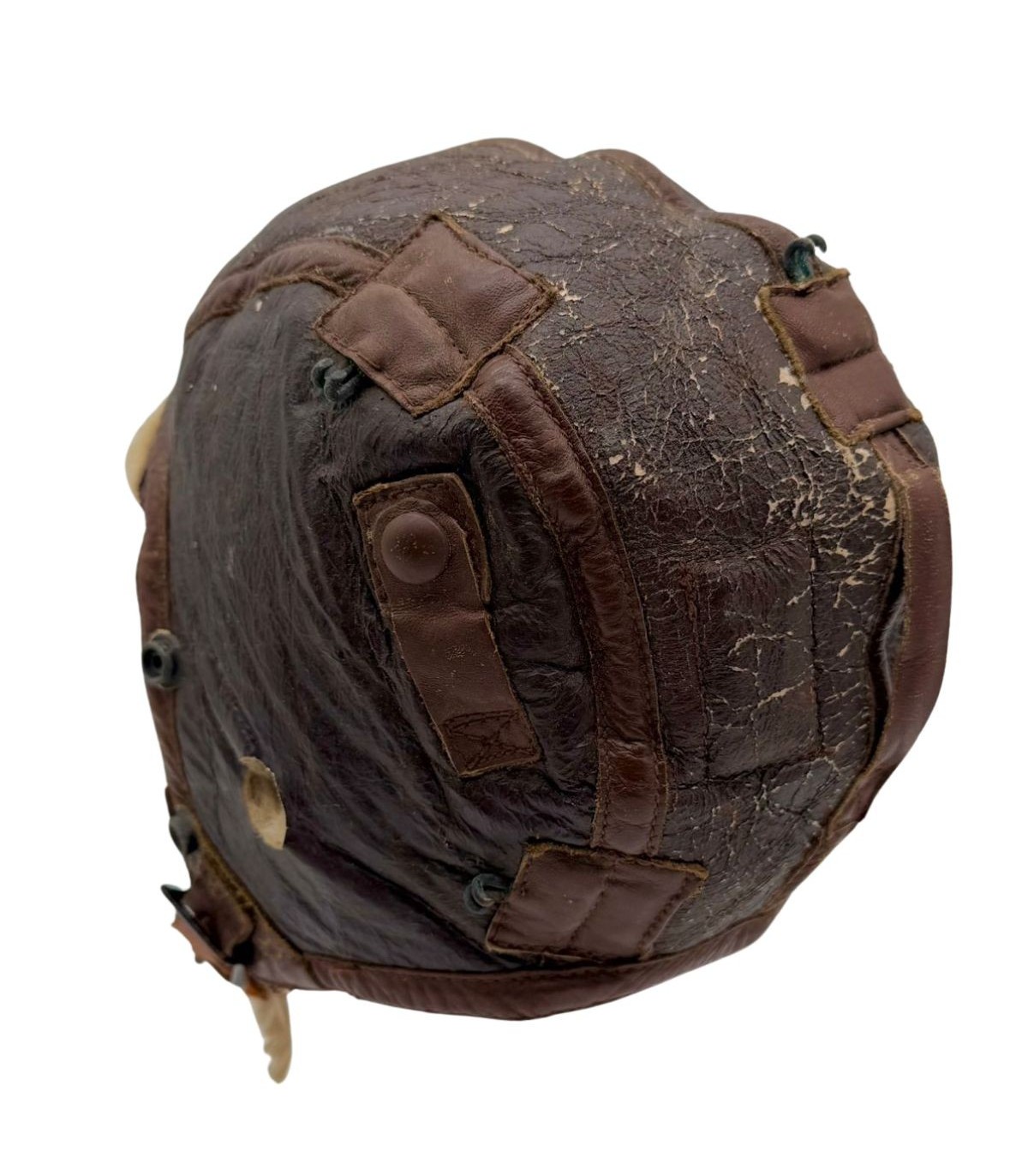 Cet exemplaire présente des modifications d’époque pour écouteurs, témoignant d’une utilisation réelle en vol. Les sangles et boucles de menton sont intactes, et le cuir, sain, peut être graissé pour retrouver souplesse et éclat.