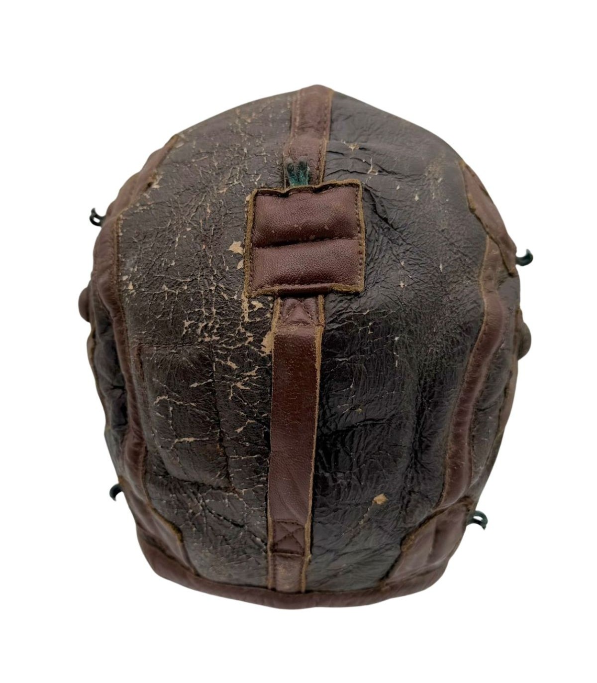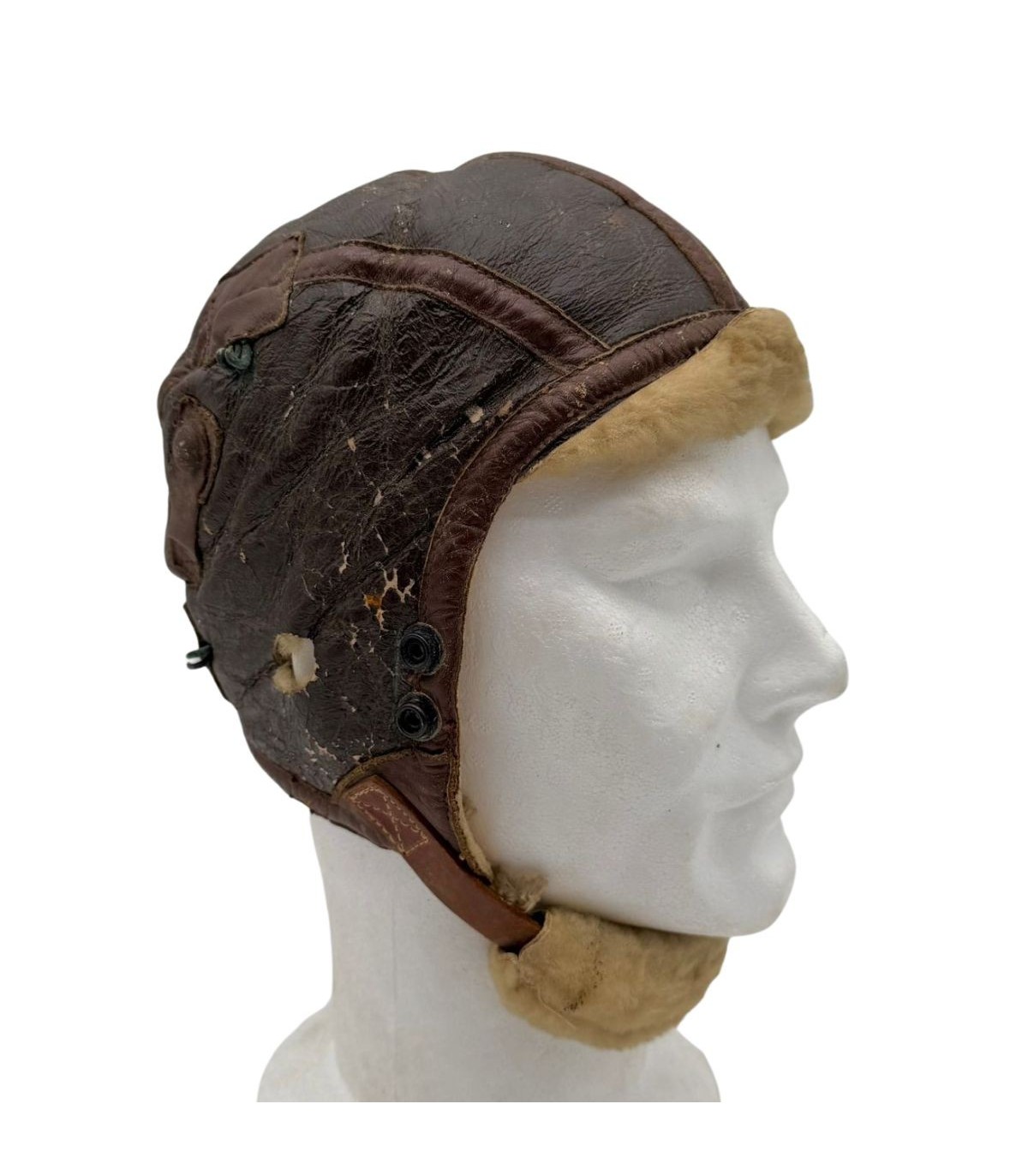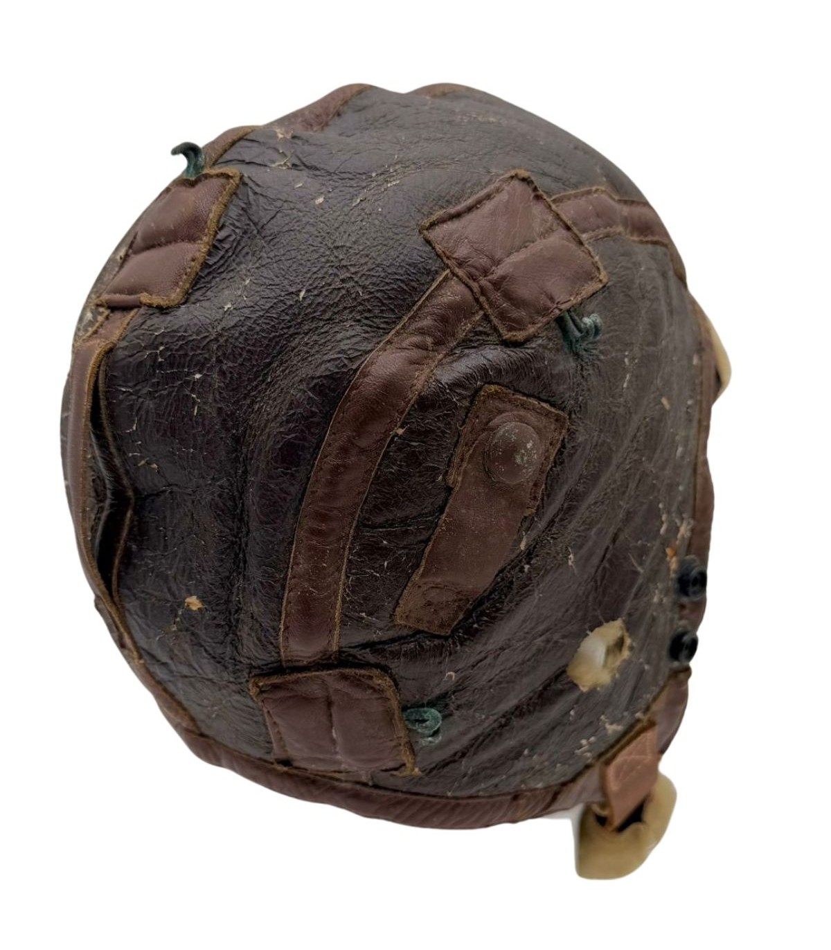 Modifications d'époque : Deux trous ont été réalisés au niveau des oreilles pour permettre le passage des écouteurs montés sur arceau. Cette modification de terrain, courante chez les aviateurs, témoigne d'une utilisation réelle et d'une adaptation aux besoins du combat.