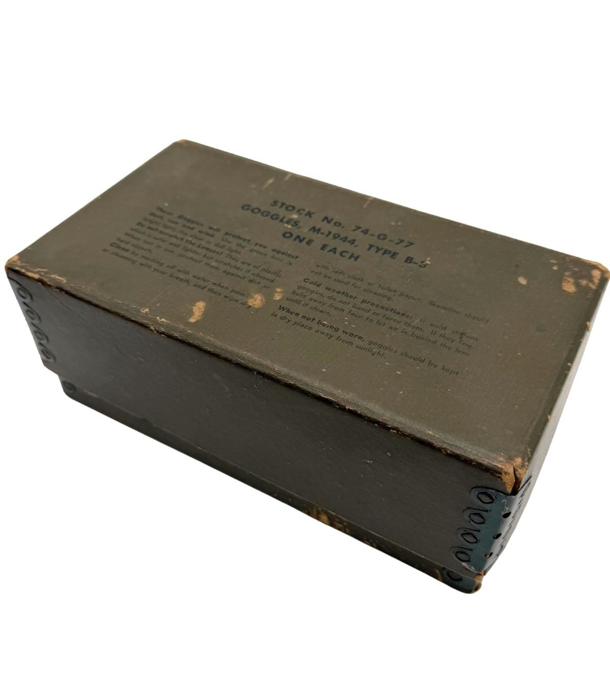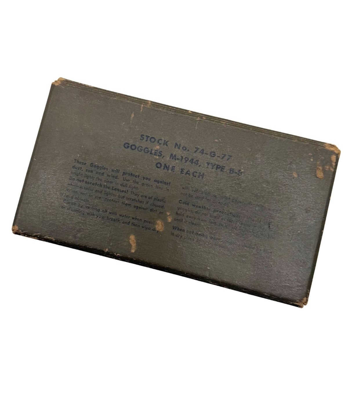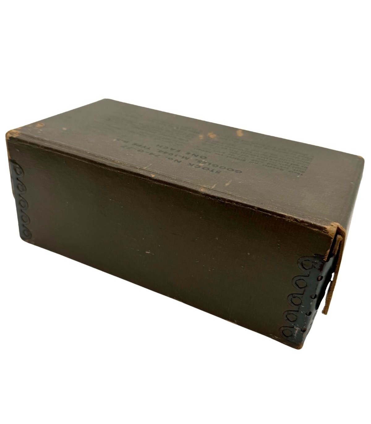 Les lunettes M-1944 Type B-8 sont déjà une pièce emblématique de l'équipement américain de la Seconde Guerre mondiale, mais leur présence avec la boîte de conditionnement d'origine en fait un ensemble rare. Ces lunettes étaient distribuées aux pilotes de l'USAAF, aux équipages de chars et aux troupes motorisées pour les protéger de la poussière et des intempéries. Le fait qu'elles soient conservées dans leur emballage carton d'époque témoigne d'un soin particulier ou d'un stock de réserve n'ayant jamais été déployé brutalement sur le terrain.