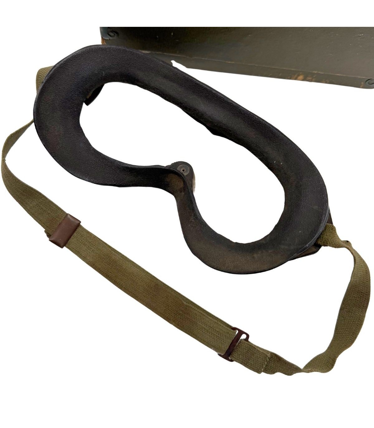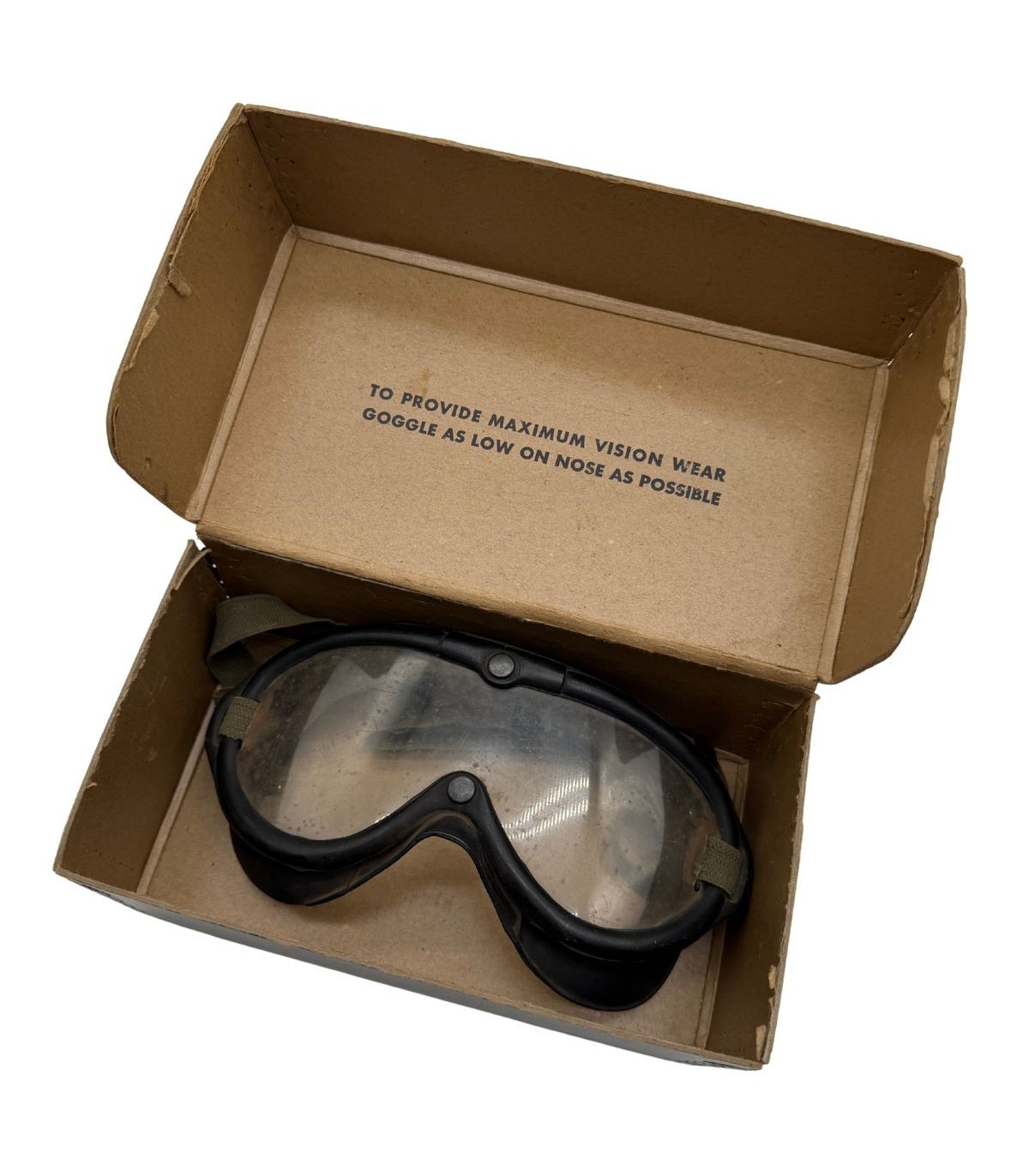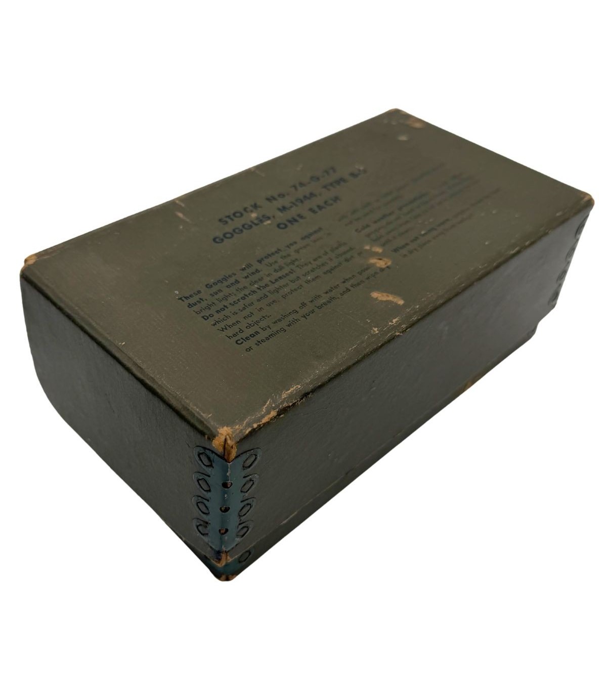 Les lunettes M-1944 Type B-8 sont déjà une pièce emblématique de l'équipement américain de la Seconde Guerre mondiale, mais leur présence avec la boîte de conditionnement d'origine en fait un ensemble rare. Ces lunettes étaient distribuées aux pilotes de l'USAAF, aux équipages de chars et aux troupes motorisées pour les protéger de la poussière et des intempéries. Le fait qu'elles soient conservées dans leur emballage carton d'époque témoigne d'un soin particulier ou d'un stock de réserve n'ayant jamais été déployé brutalement sur le terrain.