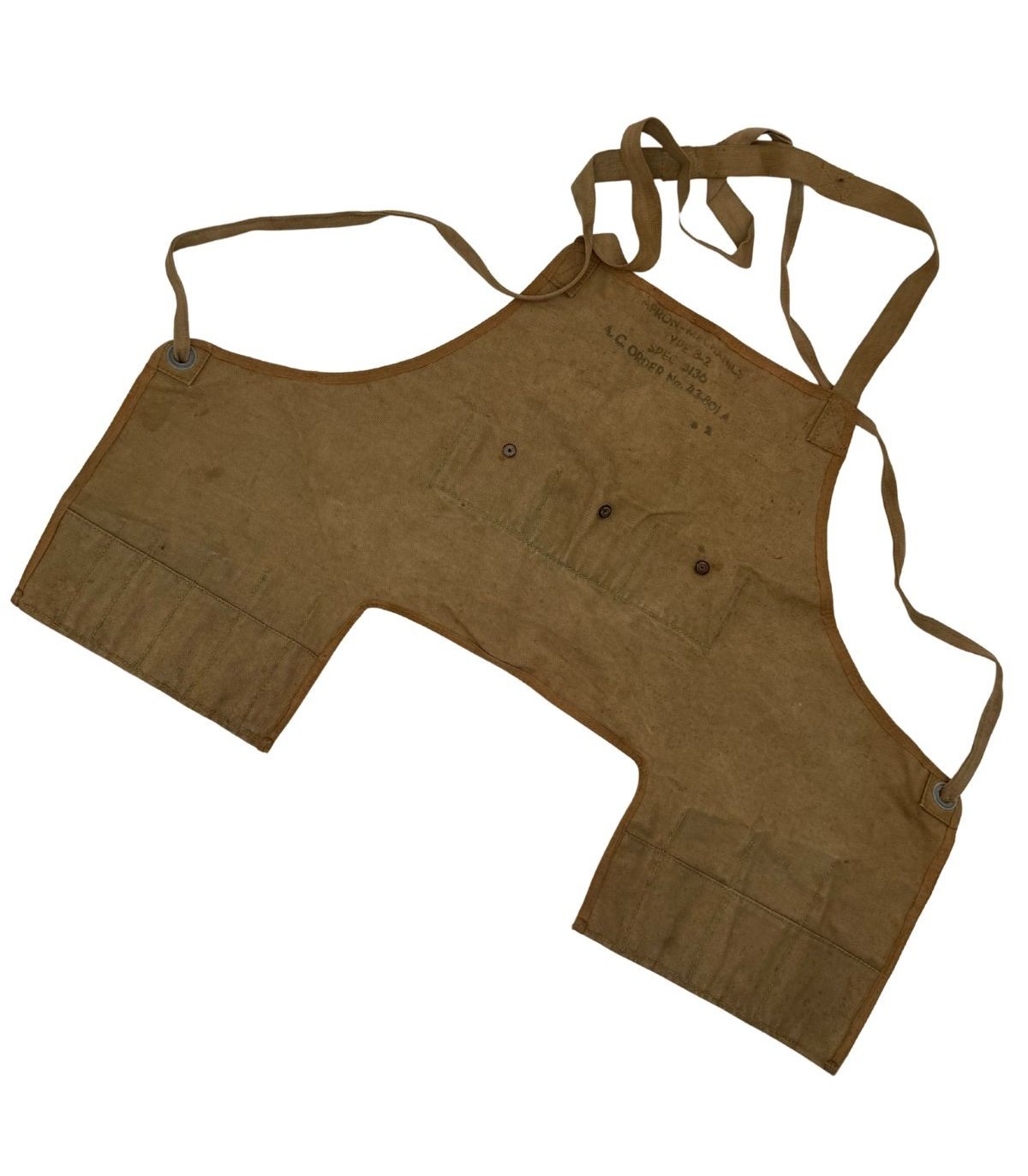 Les équipements de protection individuelle des personnels au sol sont souvent plus rares que les uniformes de combat, car ils ont été intensément usés jusqu'à destruction. Ce tablier, avec ses marquages bien lisibles, est un témoin direct de l'activité logistique sur les bases aériennes de la Seconde Guerre mondiale.