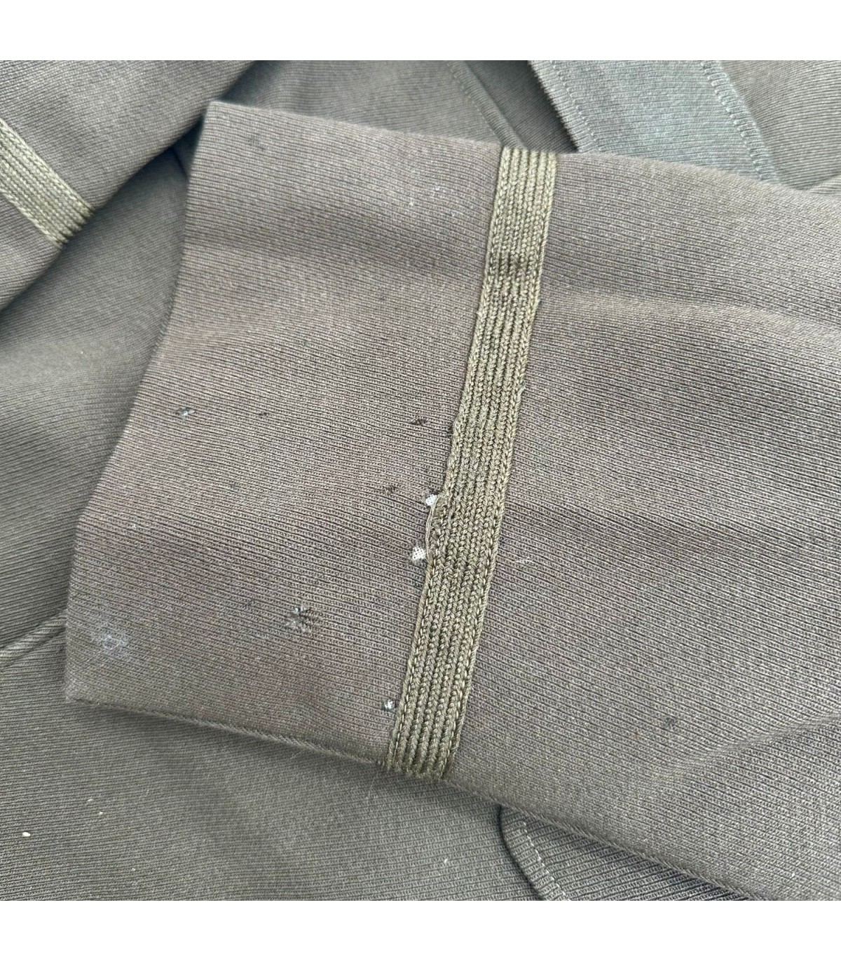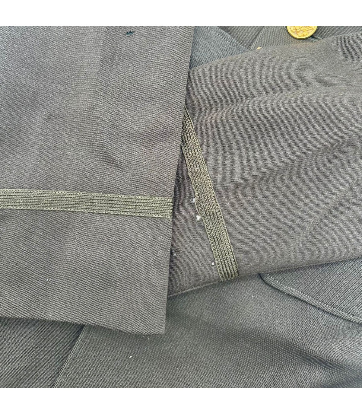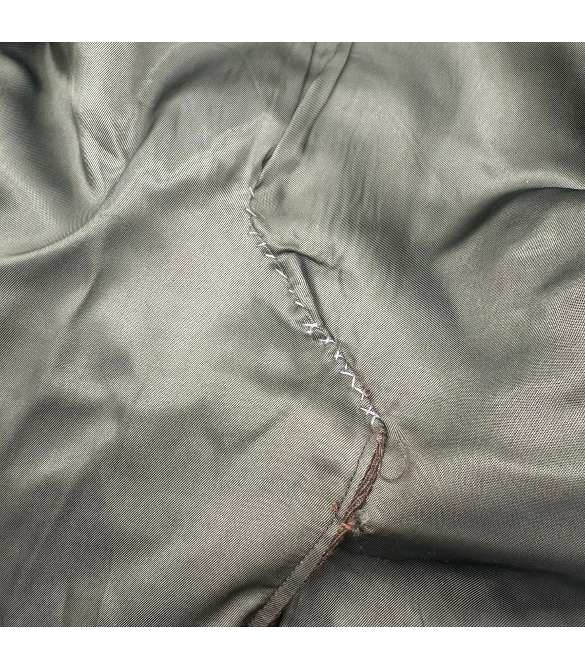 Elle présente 2 petits défauts mineur visibles sur les photos ; sur le bas d'une manche et dans le dos. Une répartion de la doublure a été effectuée sur 7 cms de long mais qui savère invisible (voir photo).
