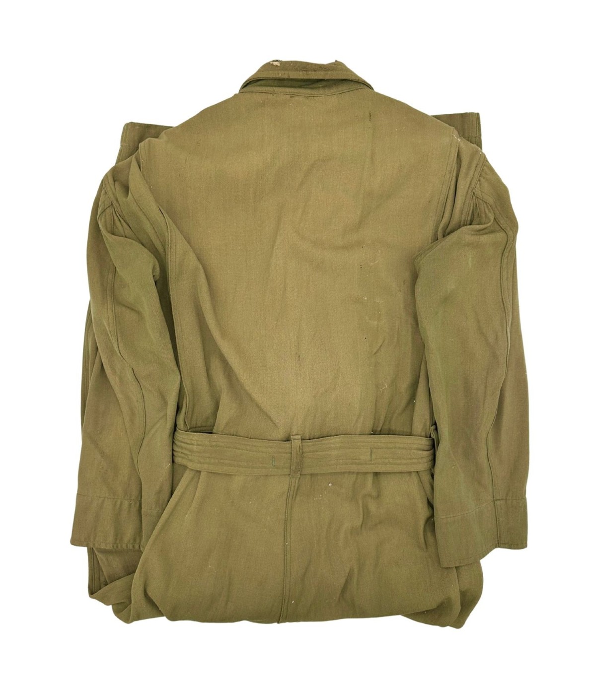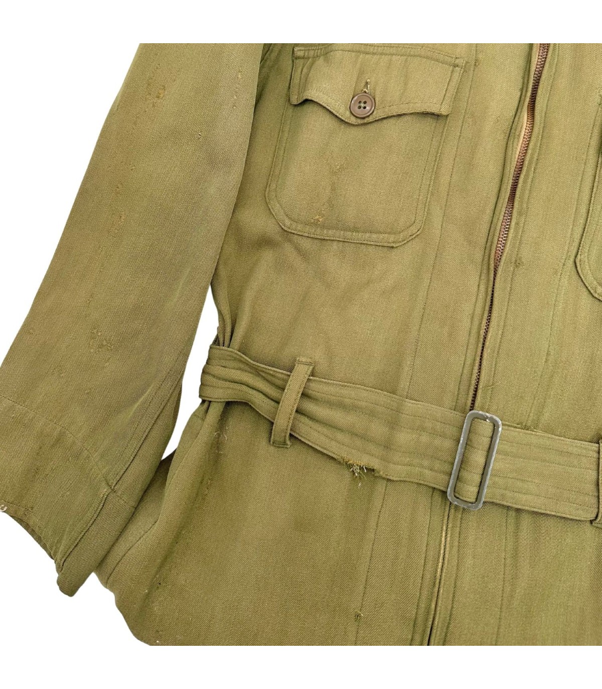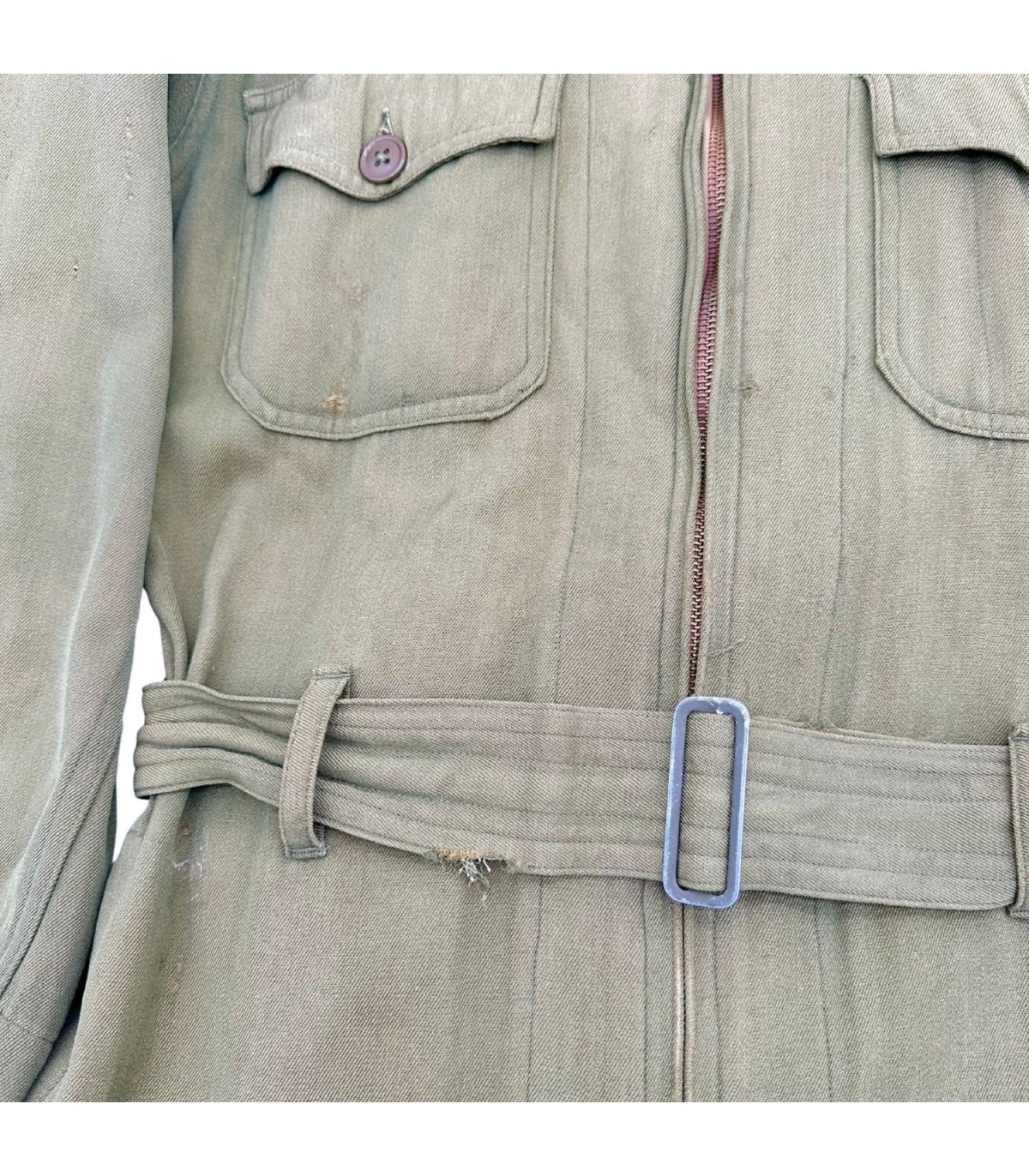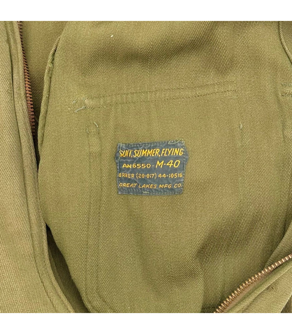 Exemplaire en bon état, quelques trous d'épingles dans le dos ainsi que des traces d'usures sur le tissu (manche, ceinture, poche avant gauche ; voir photos). Etiquette présente fabriquée par GREAT LAKES MFG Co et datée de 1944.