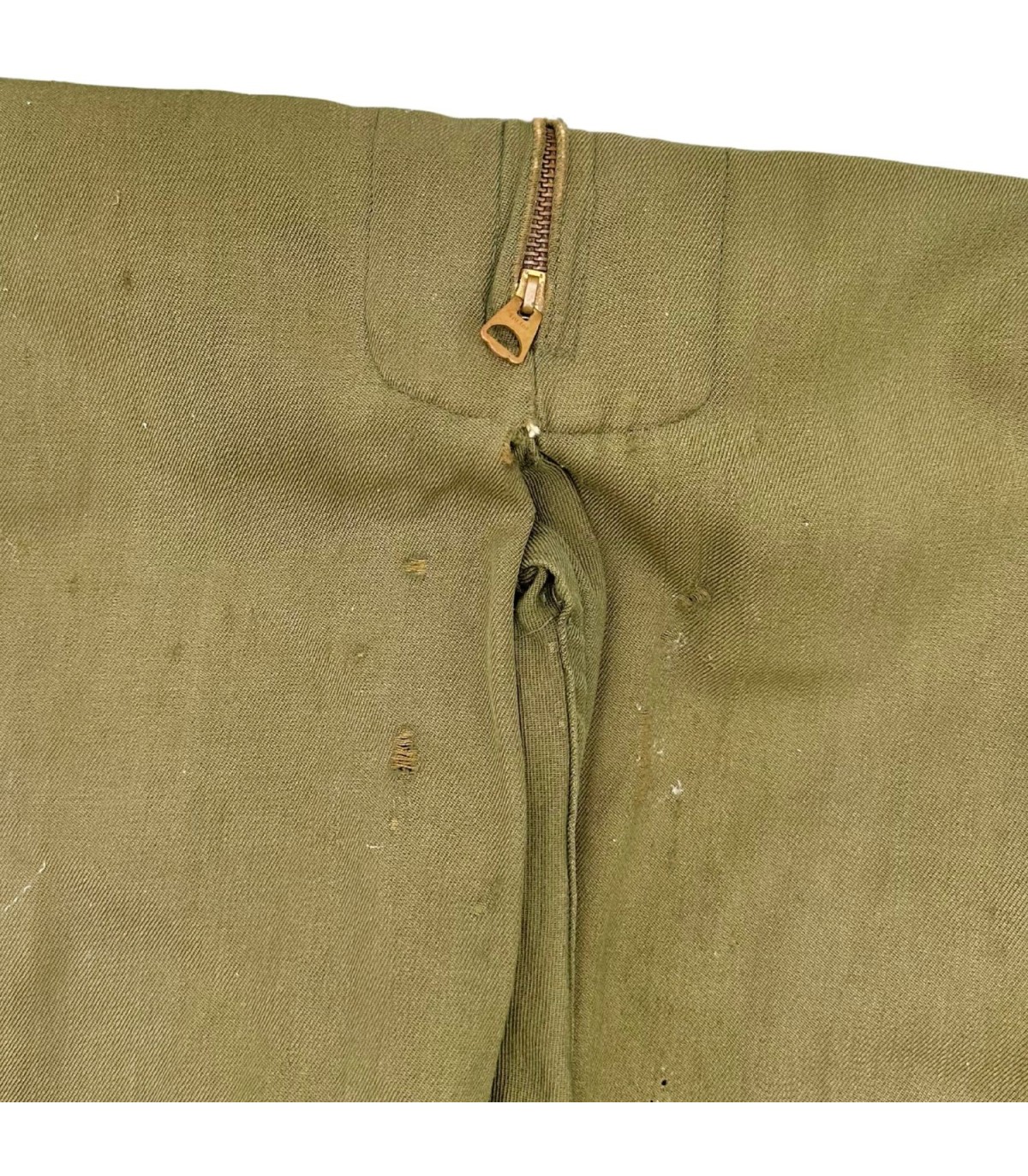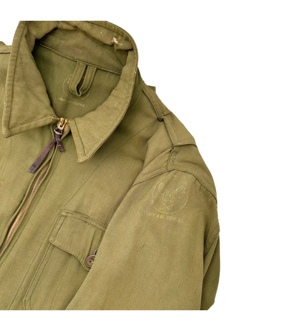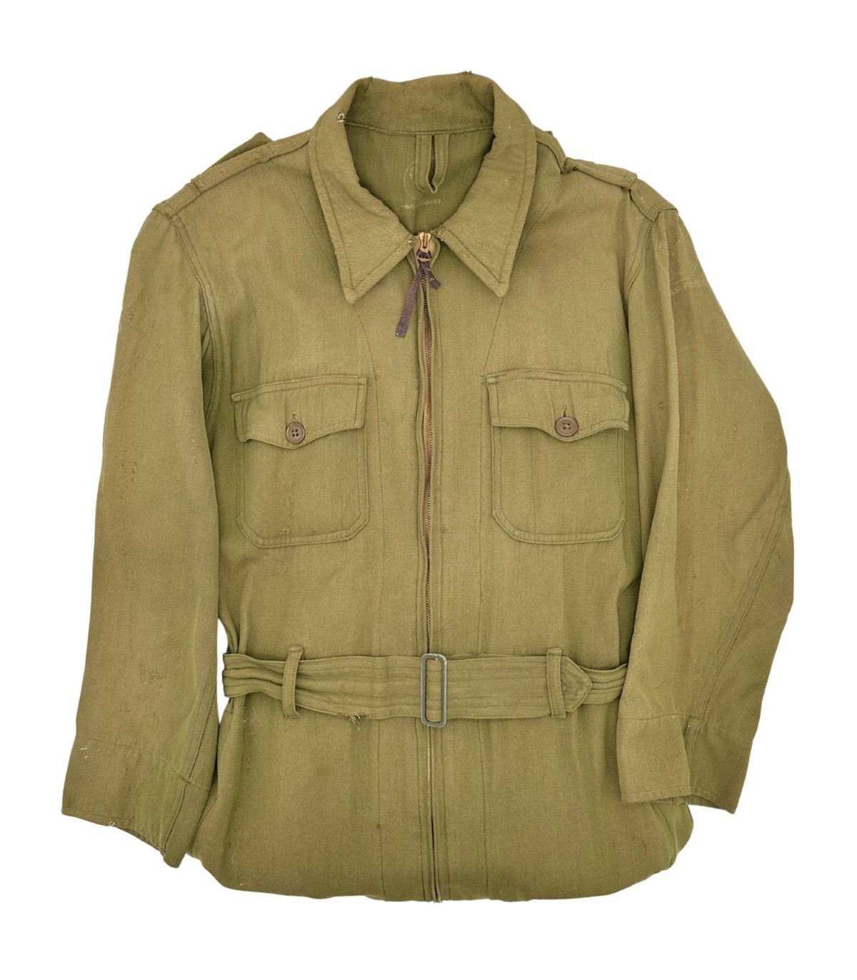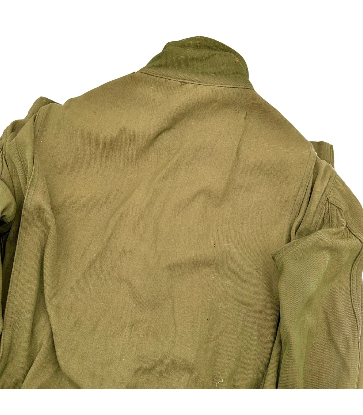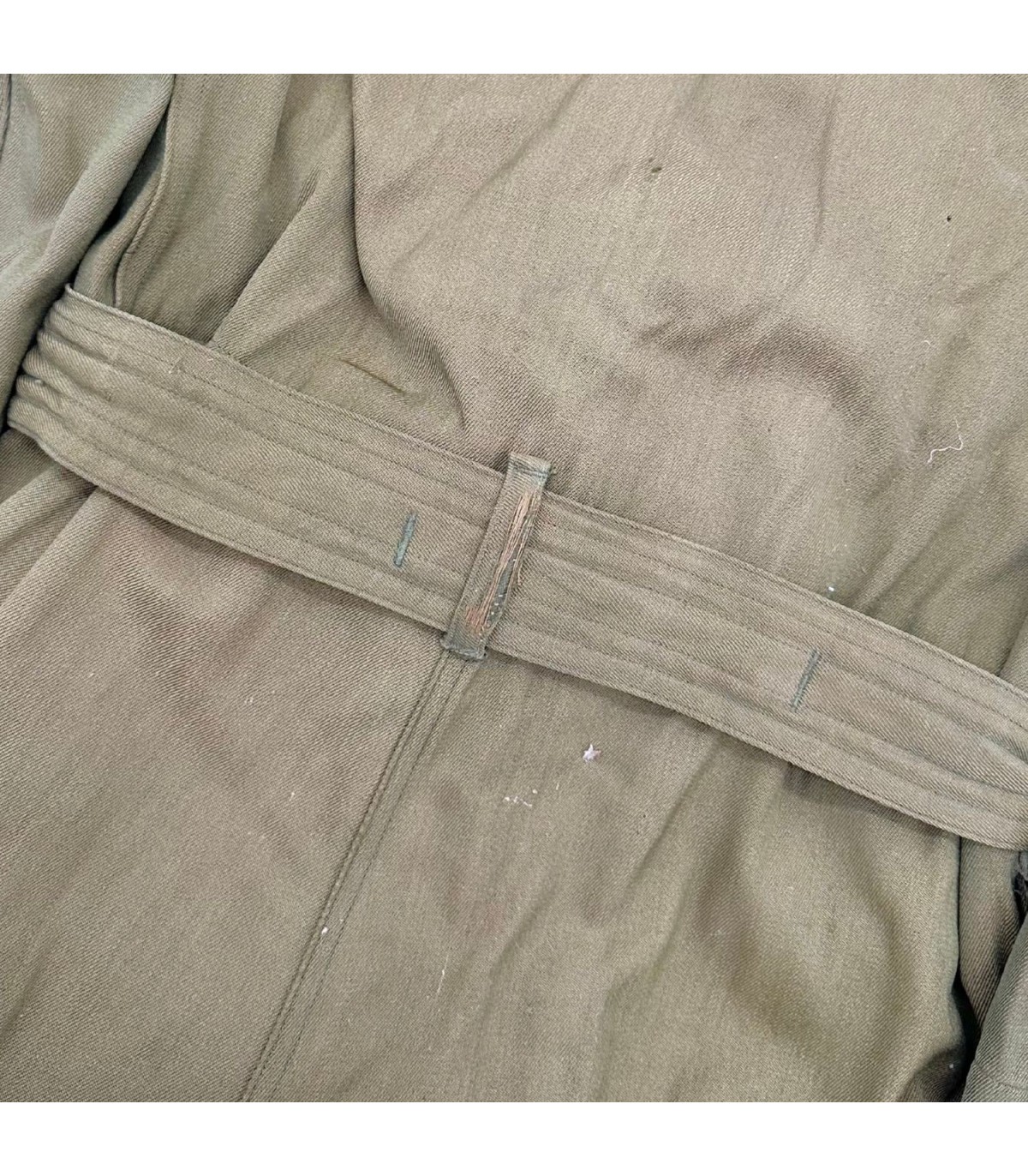 Exemplaire en bon état, quelques trous d'épingles dans le dos ainsi que des traces d'usures sur le tissu (manche, ceinture, poche avant gauche ; voir photos). Etiquette présente fabriquée par GREAT LAKES MFG Co et datée de 1944.