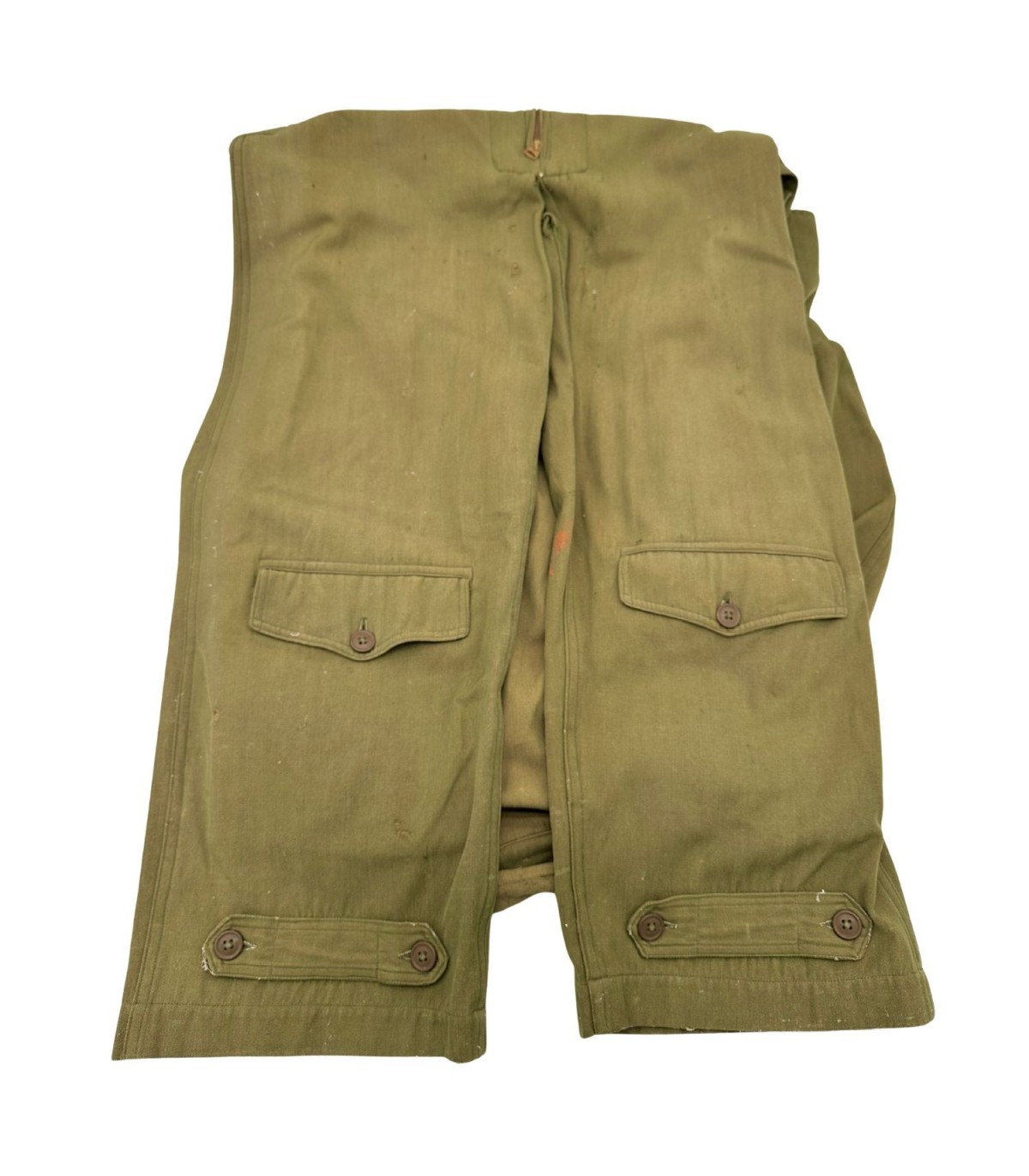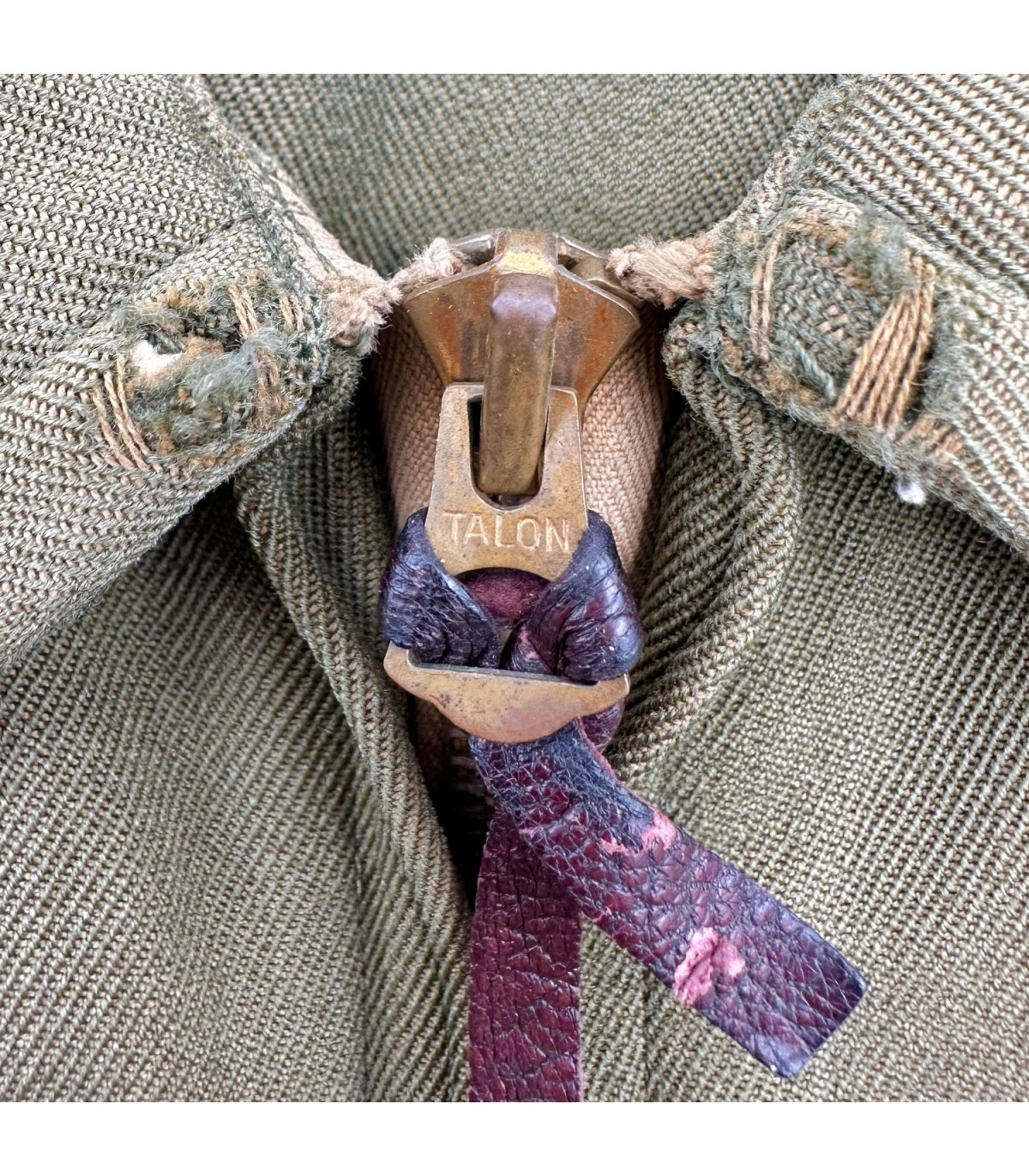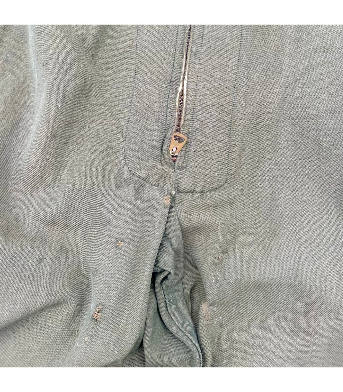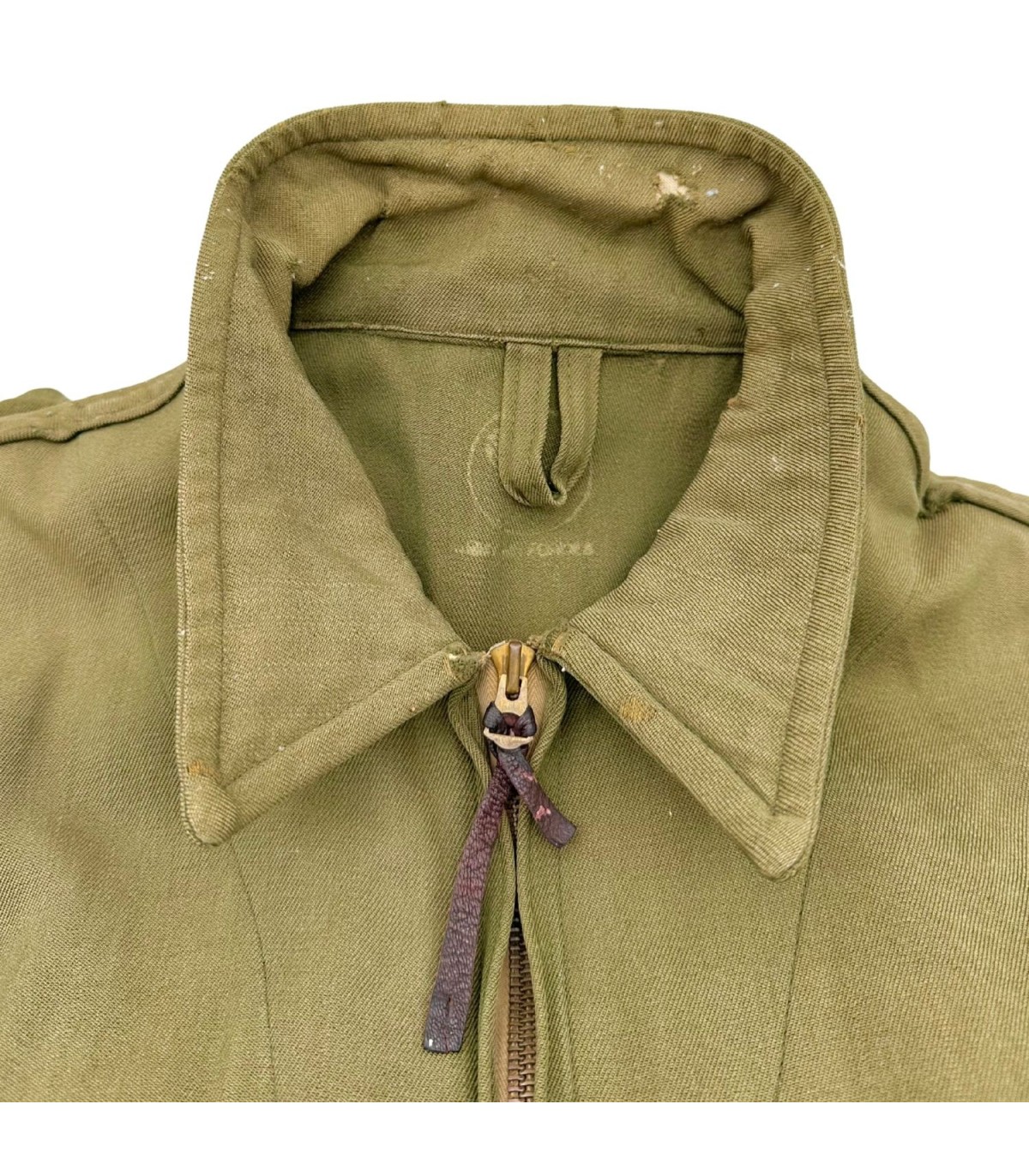 Exemplaire en bon état, quelques trous d'épingles dans le dos ainsi que des traces d'usures sur le tissu (manche, ceinture, poche avant gauche ; voir photos). Etiquette présente fabriquée par GREAT LAKES MFG Co et datée de 1944.