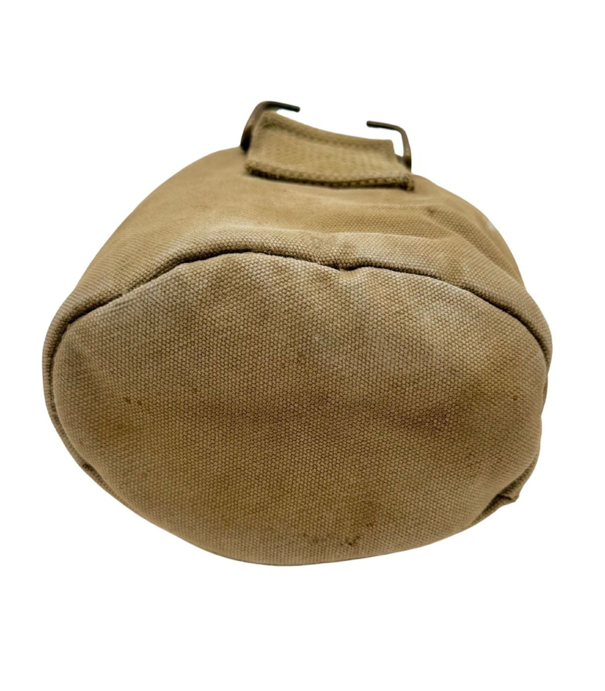 Housse datée 1942 : toile épaisse kaki OD#3 (Olive Drab), marquages lisibles, avec système d’attache M1910 permettant un port pratique sur la ceinture ou le brelage M-36.