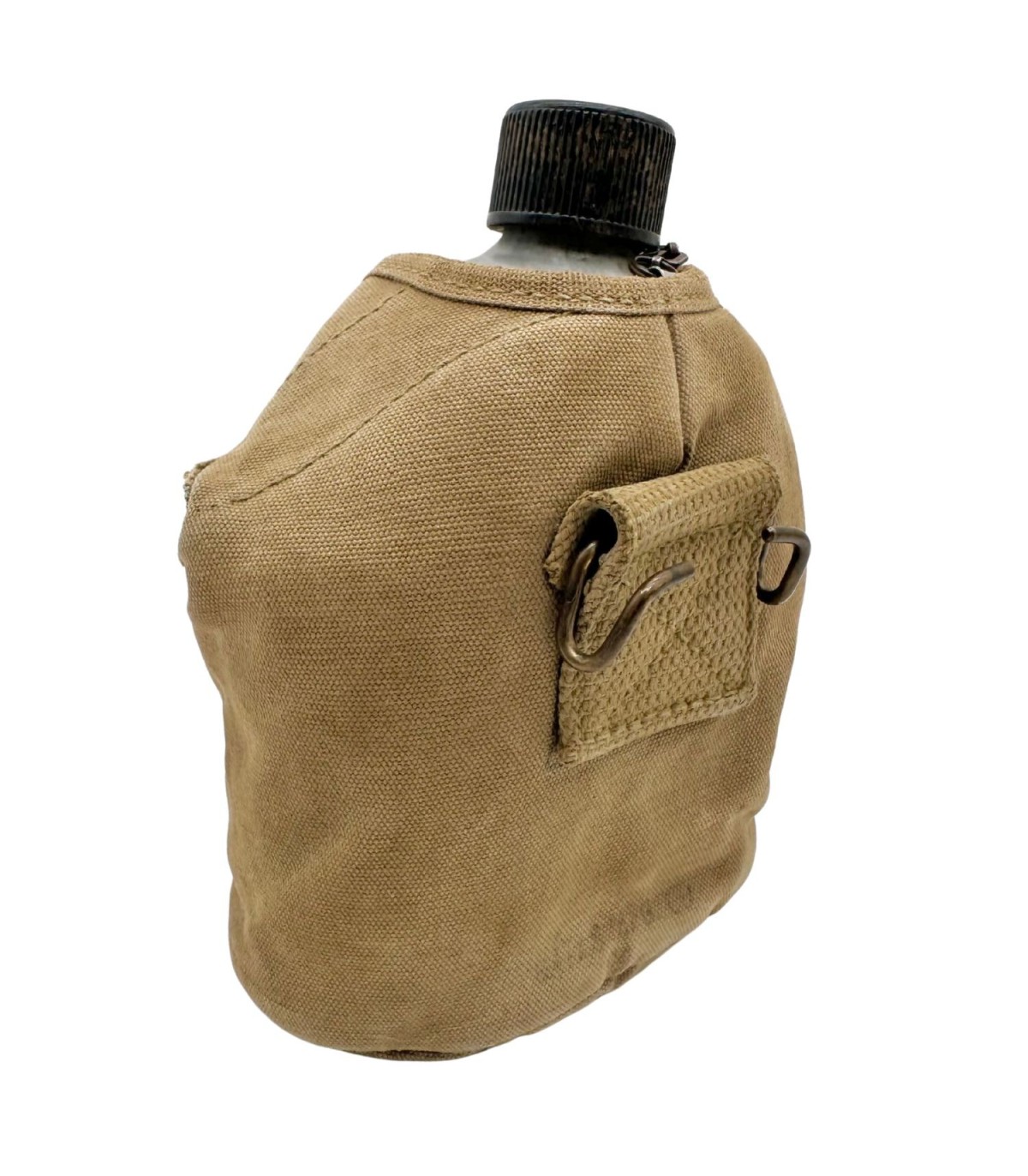 La gourde US modèle 1910, encore en service durant la Seconde Guerre mondiale, a été l’équipement indispensable du soldat américain. Transportée à la ceinture ou fixée sur le brelage, elle accompagnait le GI sur tous les terrains, garantissant son approvisionnement en eau lors des longues marches ou des combats.