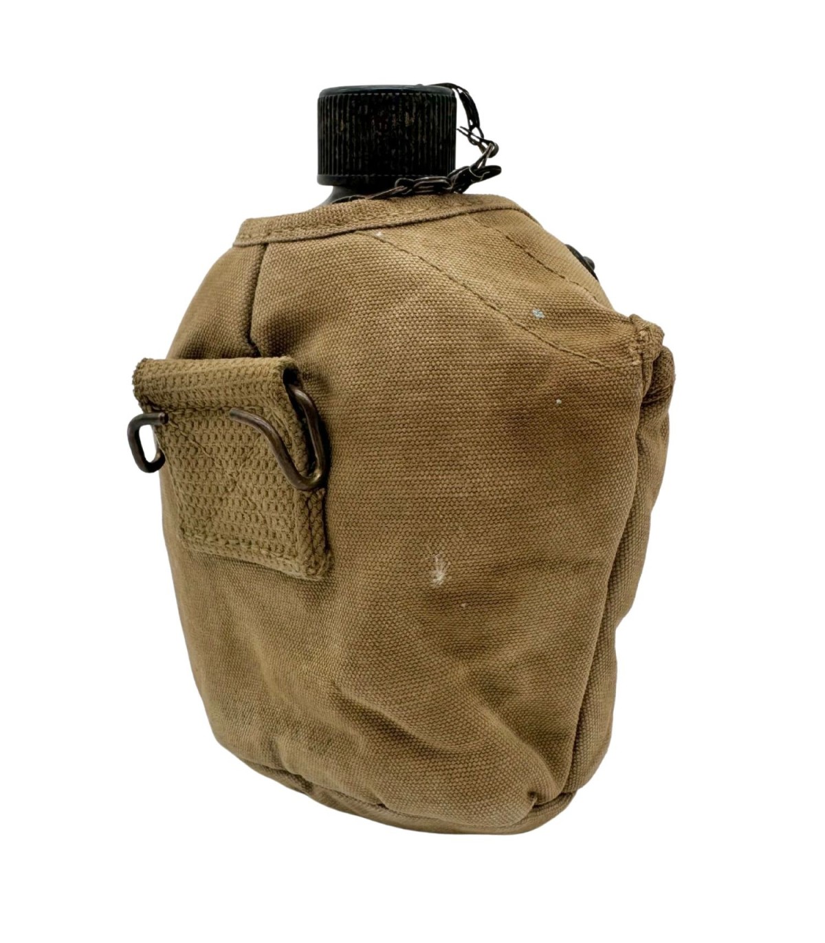 Gourde US ARMY d'origine deuxième guerre. La housse est en excellent état de deuxième type avec des pressions "STAR PULL" et une fixation par le biais d'un crochet M-1910. Exemptée de déchirure ou trou. Le quart est quant à lui fabriqué par S.M.Co en 1944. Le bidon est fabriqué par le même fabriquant S.M.Co mais la date est illisible.