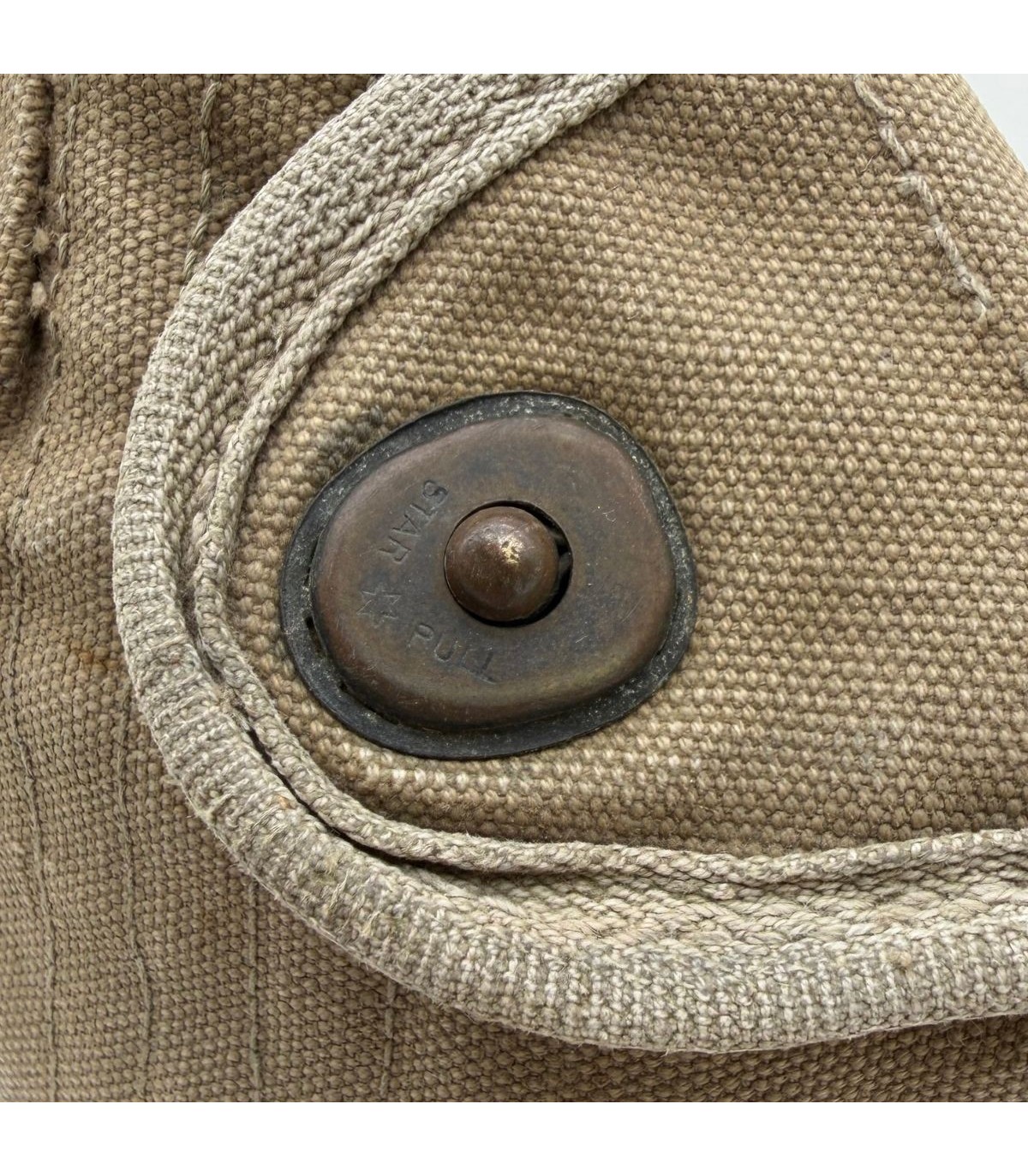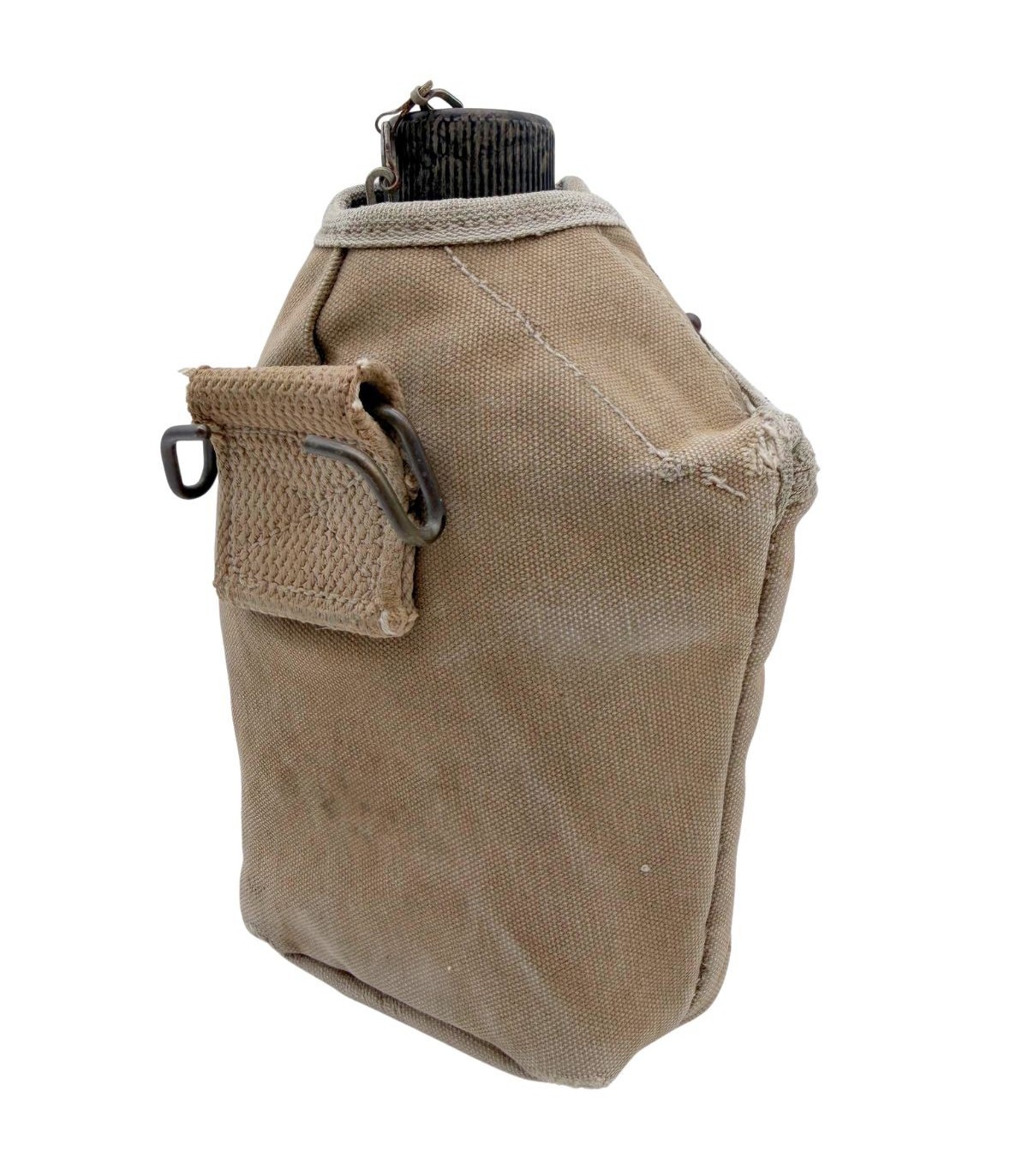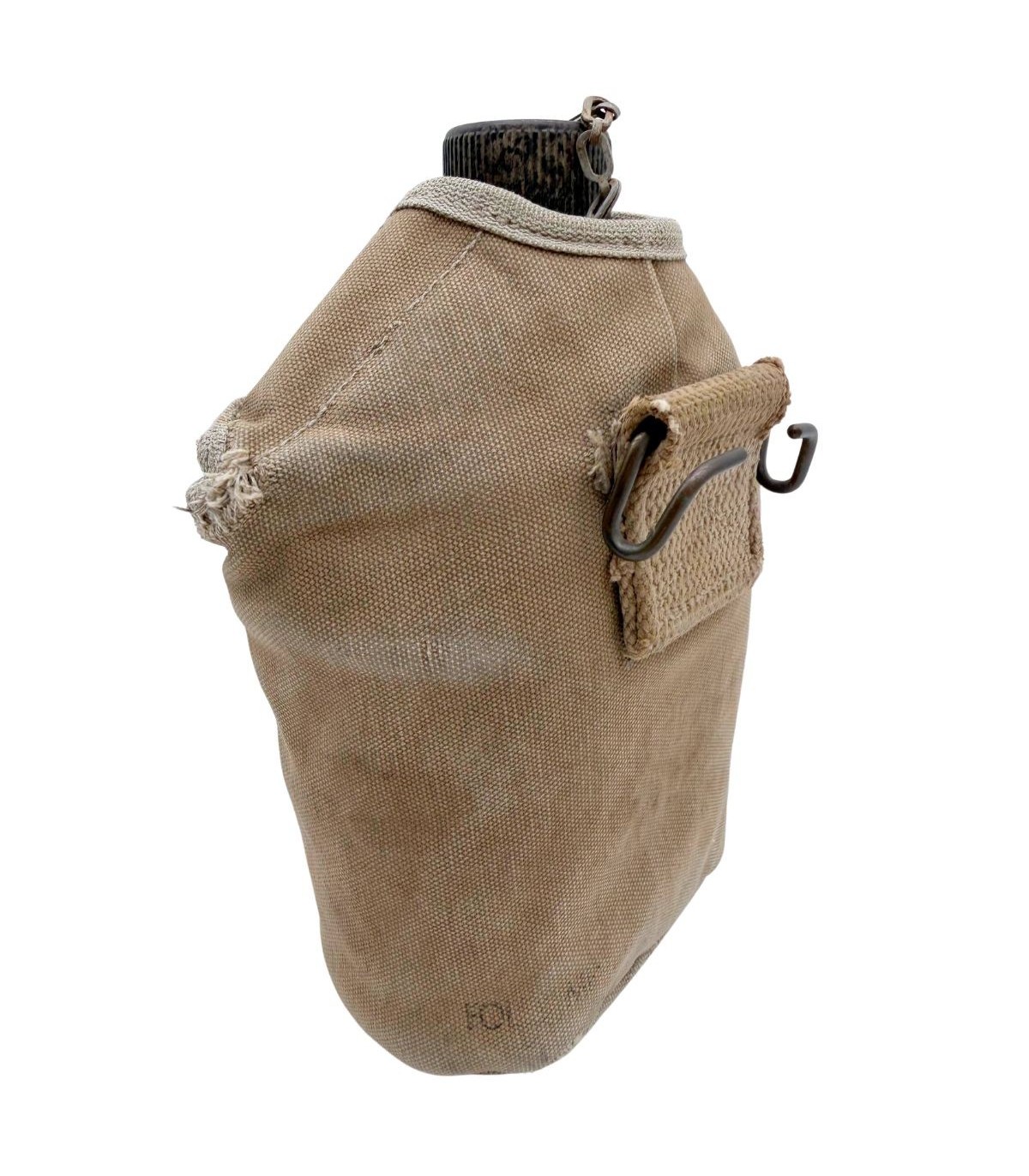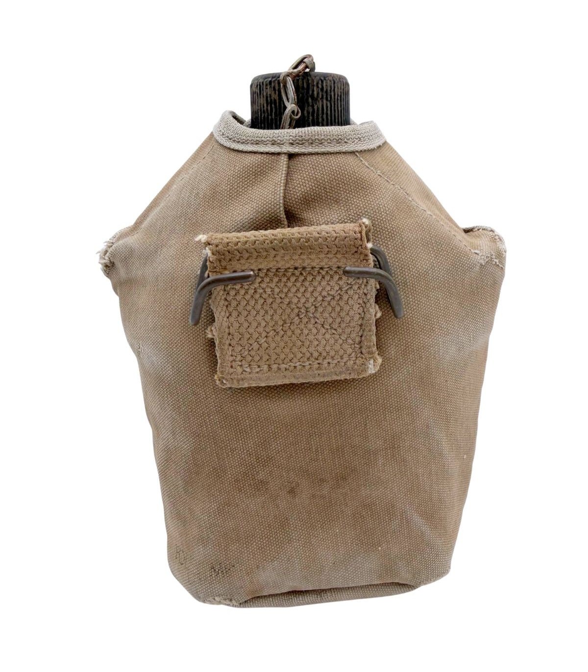 La housse qui accompagne ce bidon est tout aussi remarquable. Elle est équipée des célèbres pressions de type "Star Pull", reconnaissables à leur motif étoilé, qui sont parfaitement fonctionnelles. Ce détail est très recherché par les collectionneurs car ces pressions sont souvent grippées ou arrachées sur les exemplaires de terrain. Bien que la housse présente de légers accrocs dus à son usage opérationnel, ceux-ci renforcent son caractère authentique et prouvent qu'elle a vécu l'histoire. Elle possède bien entendu son crochet M1910 d'origine pour une fixation immédiate sur votre ceinturon M-1936 ou votre brelage.