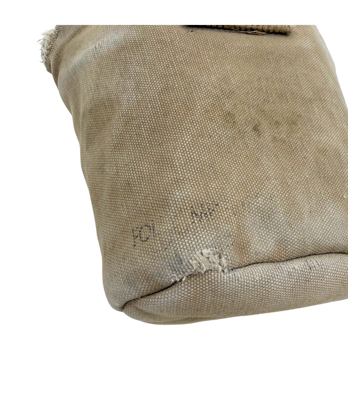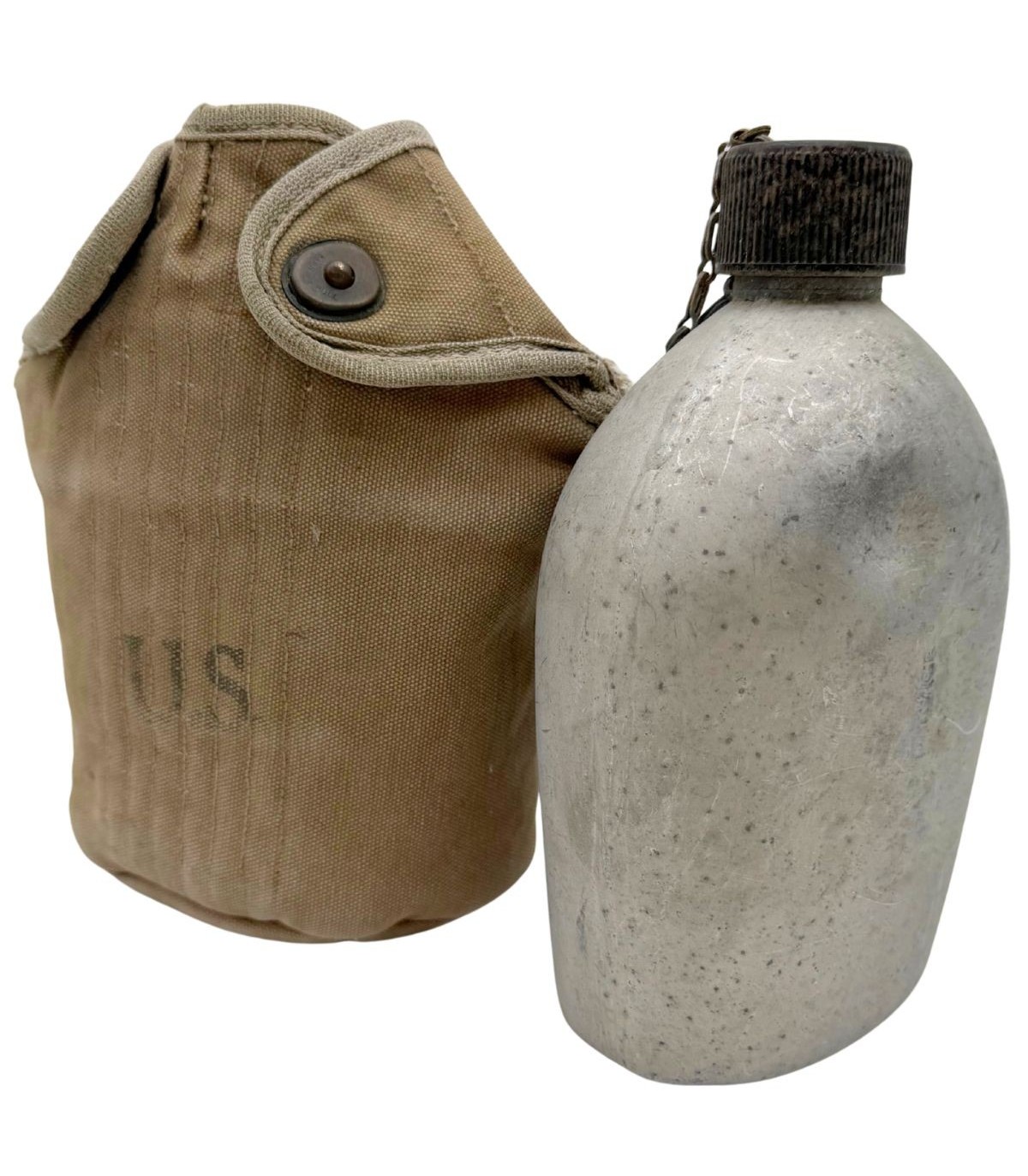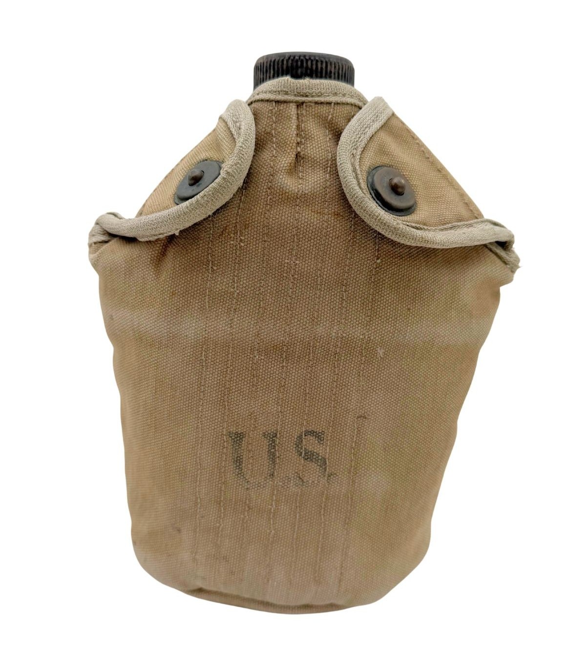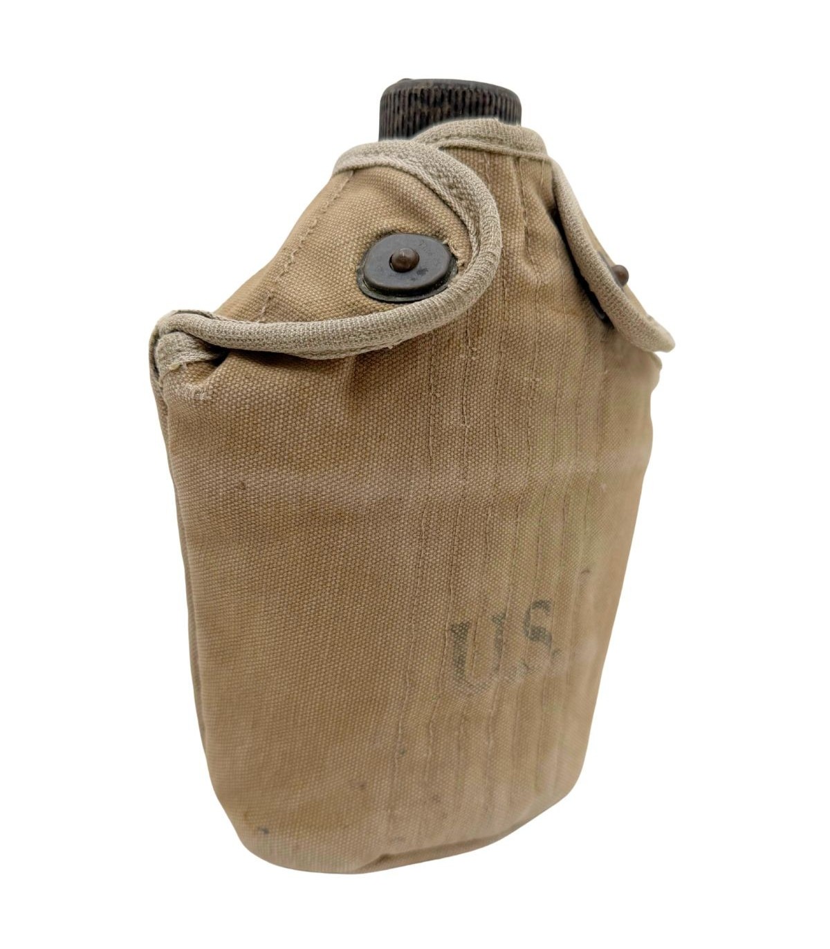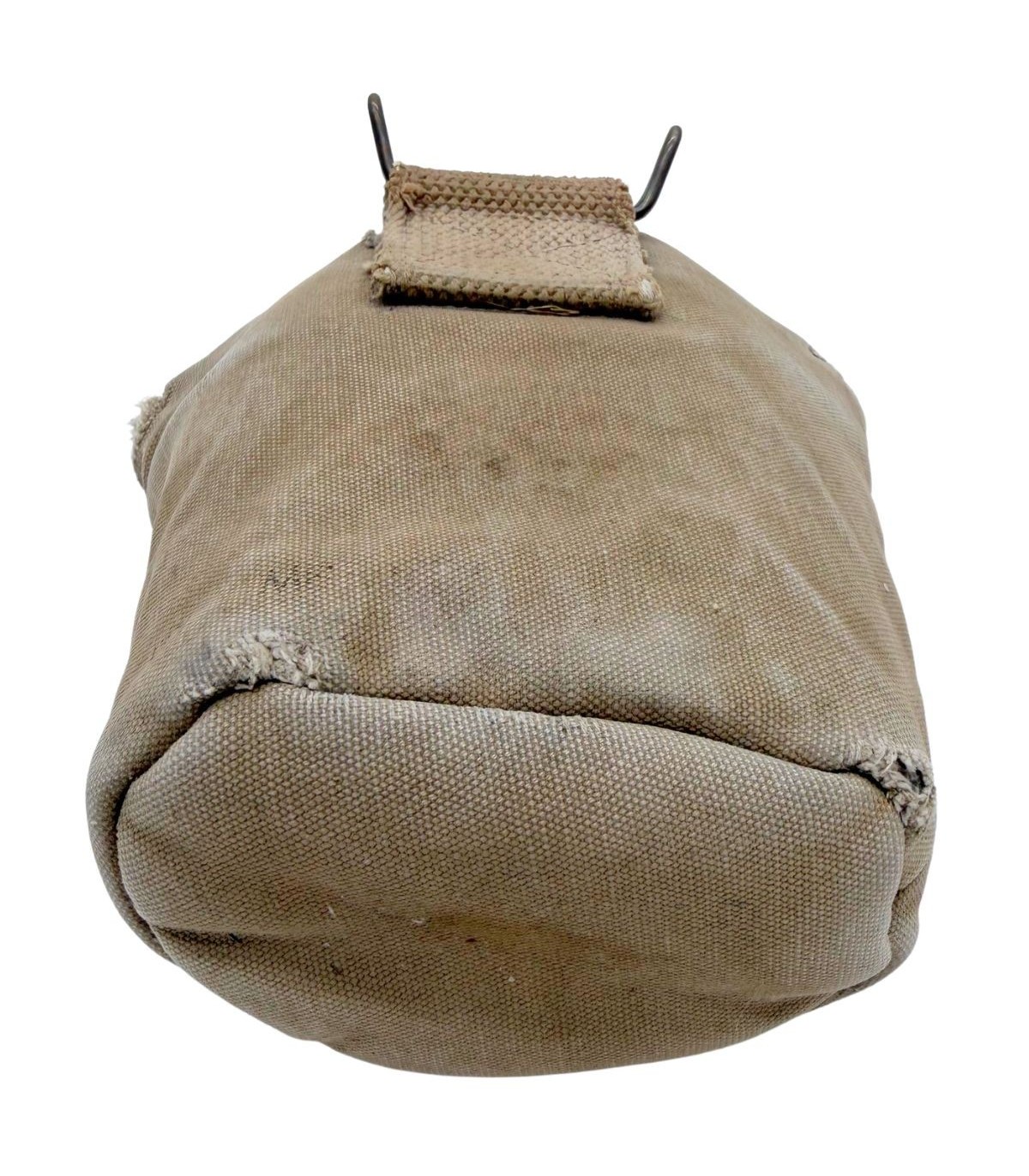 La housse qui accompagne ce bidon est tout aussi remarquable. Elle est équipée des célèbres pressions de type "Star Pull", reconnaissables à leur motif étoilé, qui sont parfaitement fonctionnelles. Ce détail est très recherché par les collectionneurs car ces pressions sont souvent grippées ou arrachées sur les exemplaires de terrain. Bien que la housse présente de légers accrocs dus à son usage opérationnel, ceux-ci renforcent son caractère authentique et prouvent qu'elle a vécu l'histoire. Elle possède bien entendu son crochet M1910 d'origine pour une fixation immédiate sur votre ceinturon M-1936 ou votre brelage.