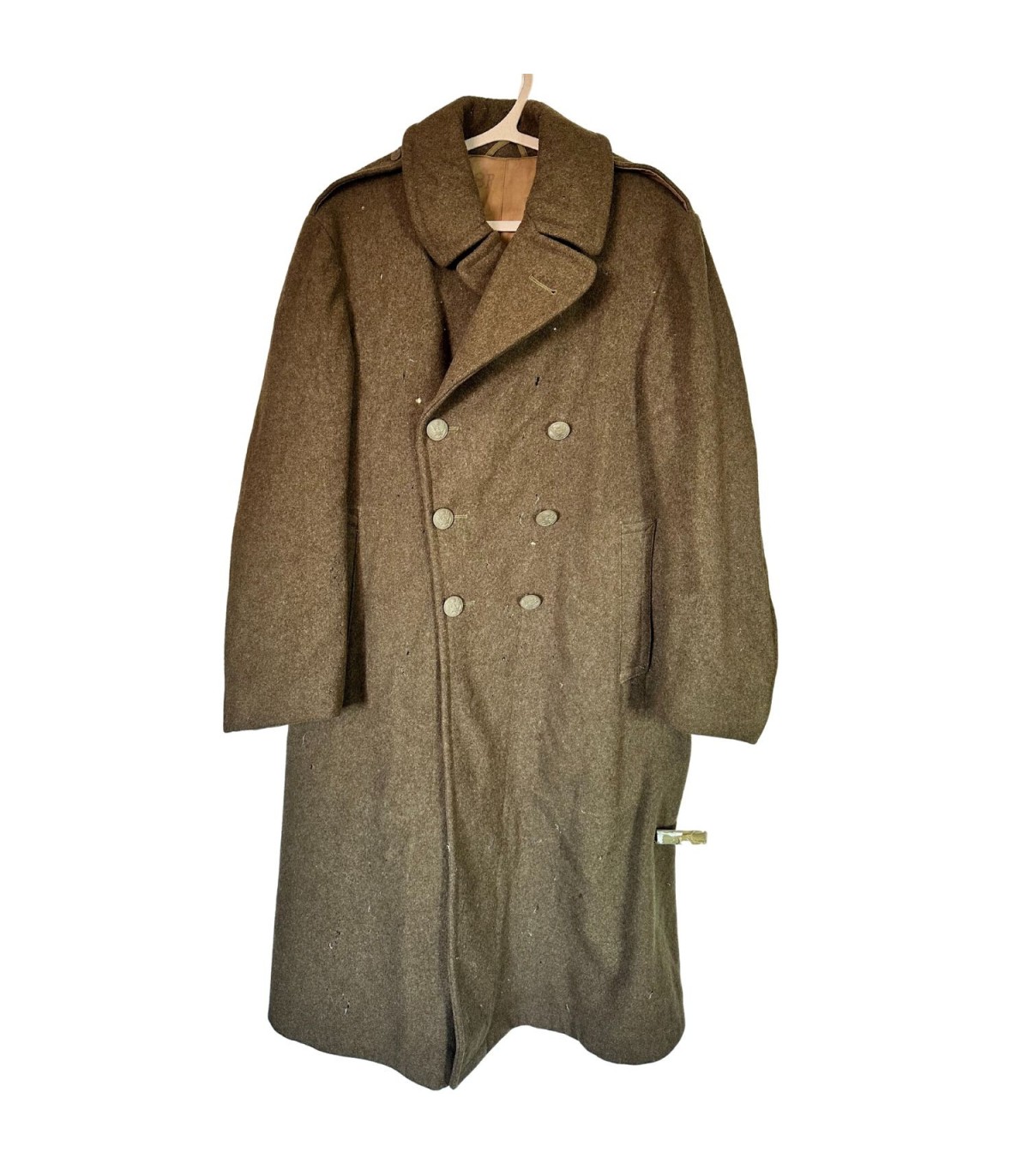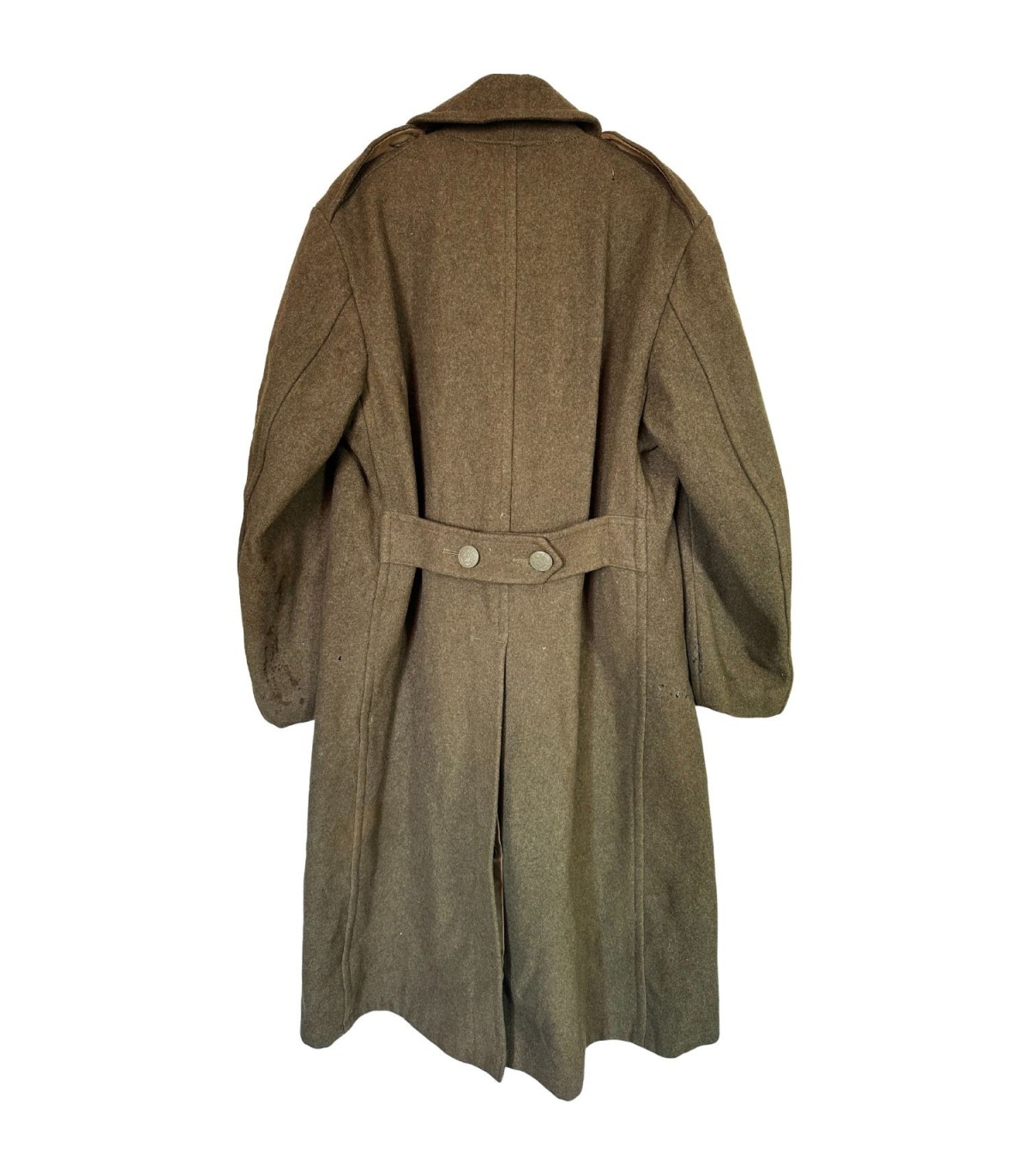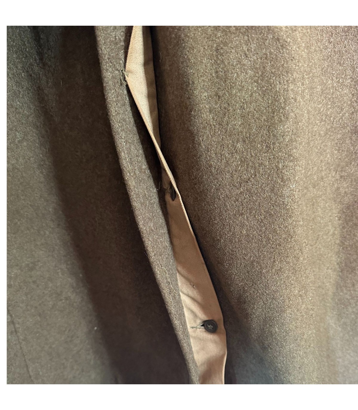 Capote en drap de la troupe d'origine deuxième guerre. Cet overcoat a été adopté en 1939 et légérement modifié en 1942 ; en effet les boutons métal doré à l'origine sont remplacés par des modèles plastique à des fins économique.
