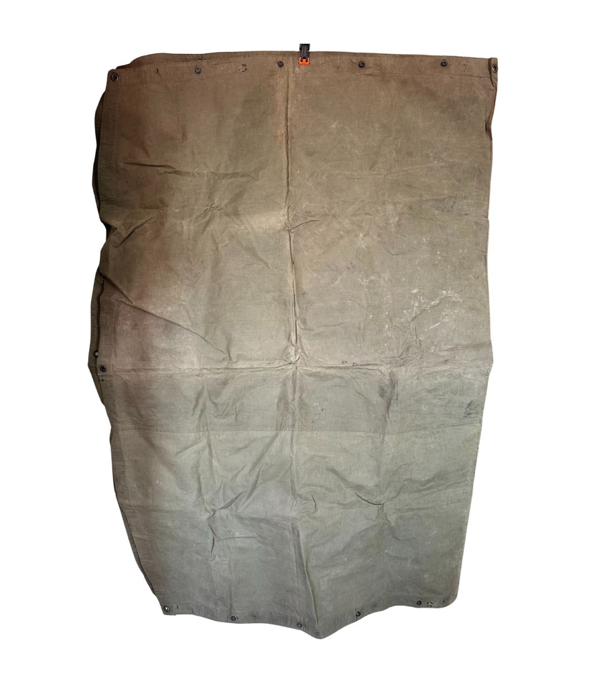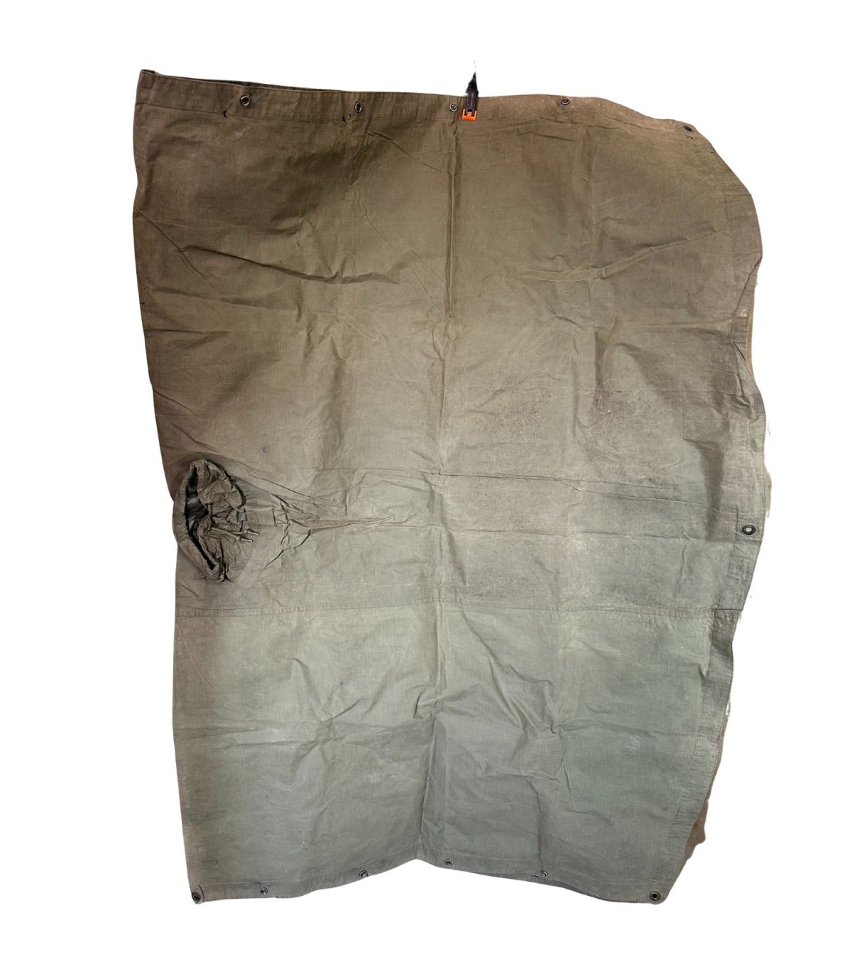Conçu pour affronter les conditions climatiques les plus rudes, ce poncho servait aussi bien de protection contre la pluie que de bâche d’abri sur le terrain. Fabriqué en toile caoutchoutée (olive drab), il illustre la robustesse et l’ingéniosité du matériel militaire américain de l’époque.