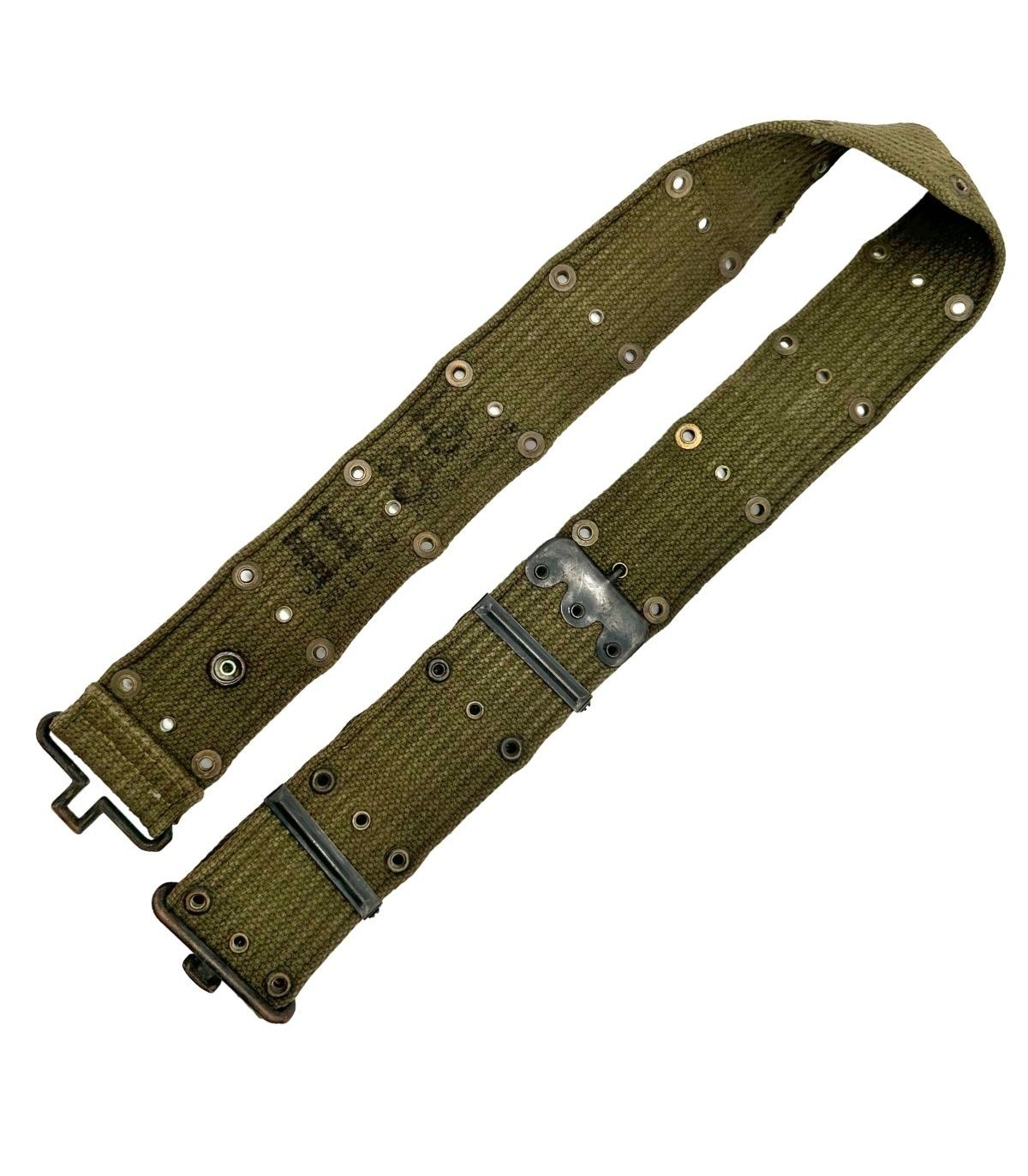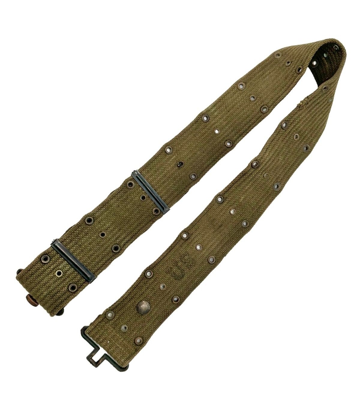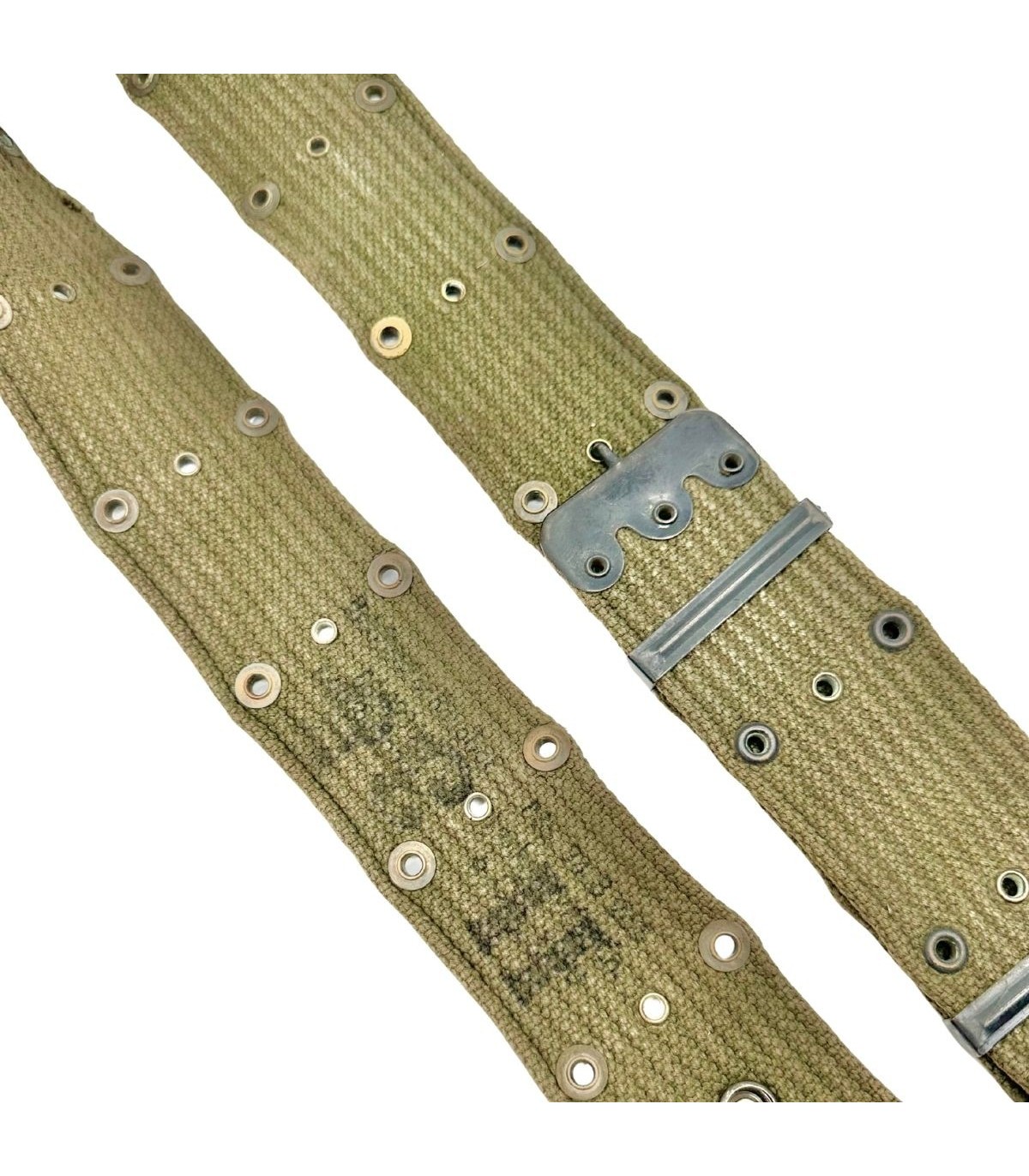Cet exemplaire est un ceinturon M-1936 authentique de l'US Army, reconnaissable à sa toile de coton robuste et à son système de réglage simple et efficace. Il se distingue par l'absence de marquage visible, un phénomène courant sur les pièces de terrain en raison de l'usure, ou parce que les tampons du fabricant et la date étaient parfois très discrets ou appliqués à l'intérieur du rabat. Son authenticité est néanmoins garantie par la qualité de sa boucle métallique caractéristique et la finesse de son tissage.