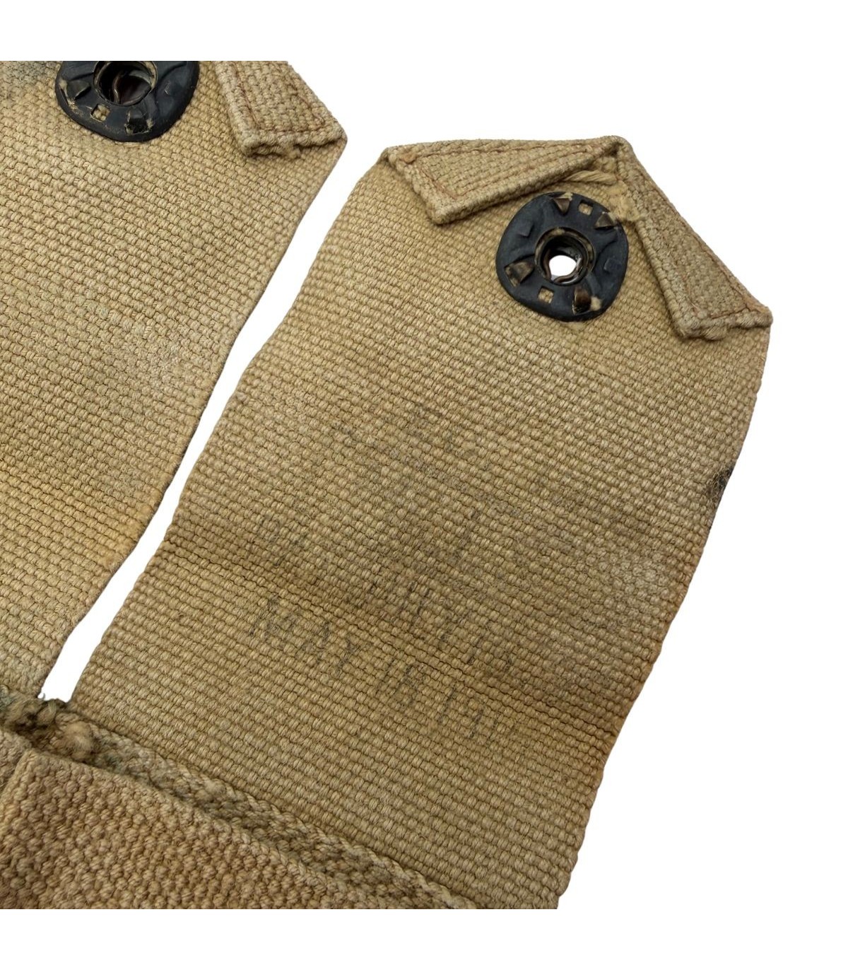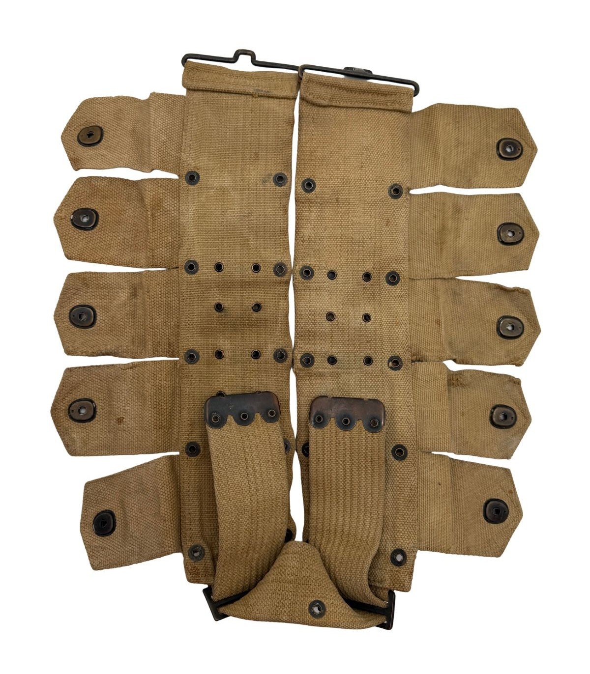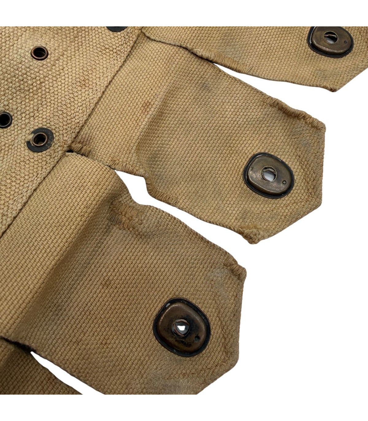 Pièce emblématique du corps expéditionnaire américain, ce ceinturon-cartouchière permettait de transporter 100 cartouches de .30-06. Cet exemplaire présente un assemblage d'époque cohérent associant les deux géants du tissage : Mills et Russell.