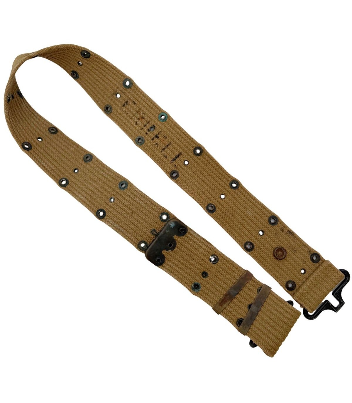 Ce qui rend cet exemplaire exceptionnel, c'est son marquage au pochoir (stencil) d'origine. On y lit distinctement le nom "FERNELL". Contrairement aux objets sortis de stocks neufs (NOS), ce ceinturon a une histoire à raconter. Ce type de personnalisation était courant sur le terrain pour identifier son matériel lors des rotations ou des passages en blanchisserie. Ce détail fait de cet objet une pièce de caractère, chargée de l'identité d'un GI ayant probablement foulé le sol européen.