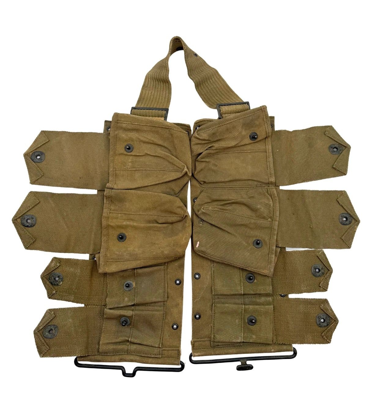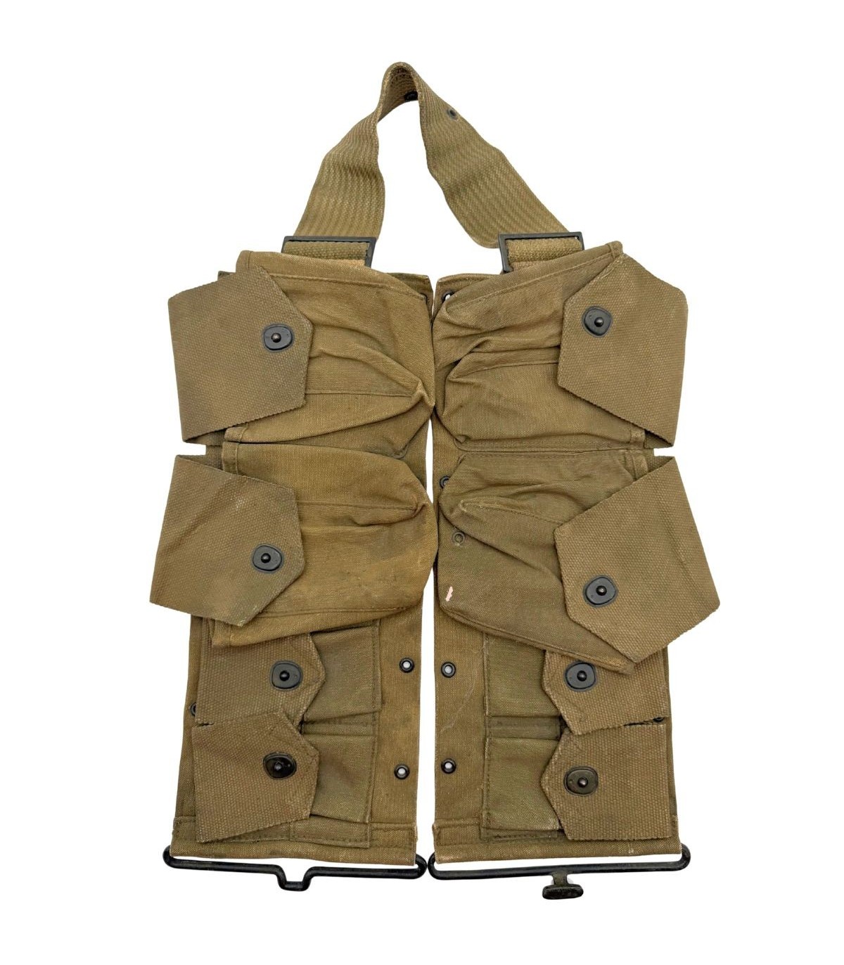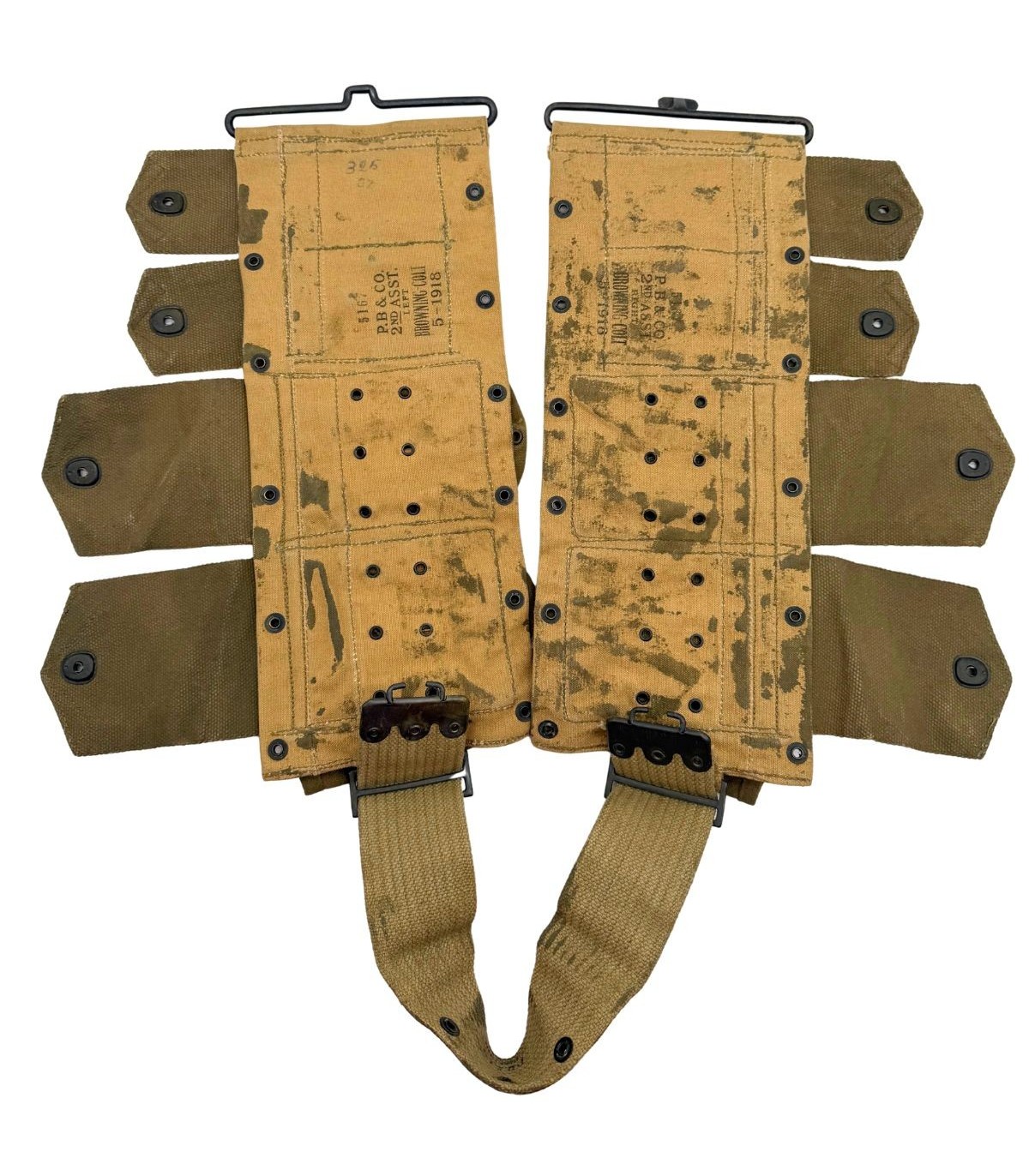 Pièce de sangle complexe et hautement recherchée, ce ceinturon était destiné au Second Assistant du tireur de BAR. Sa configuration unique permet l'emport mixte de 8 chargeurs de BAR et de 4 lames-chargeurs pour fusils Springfield.