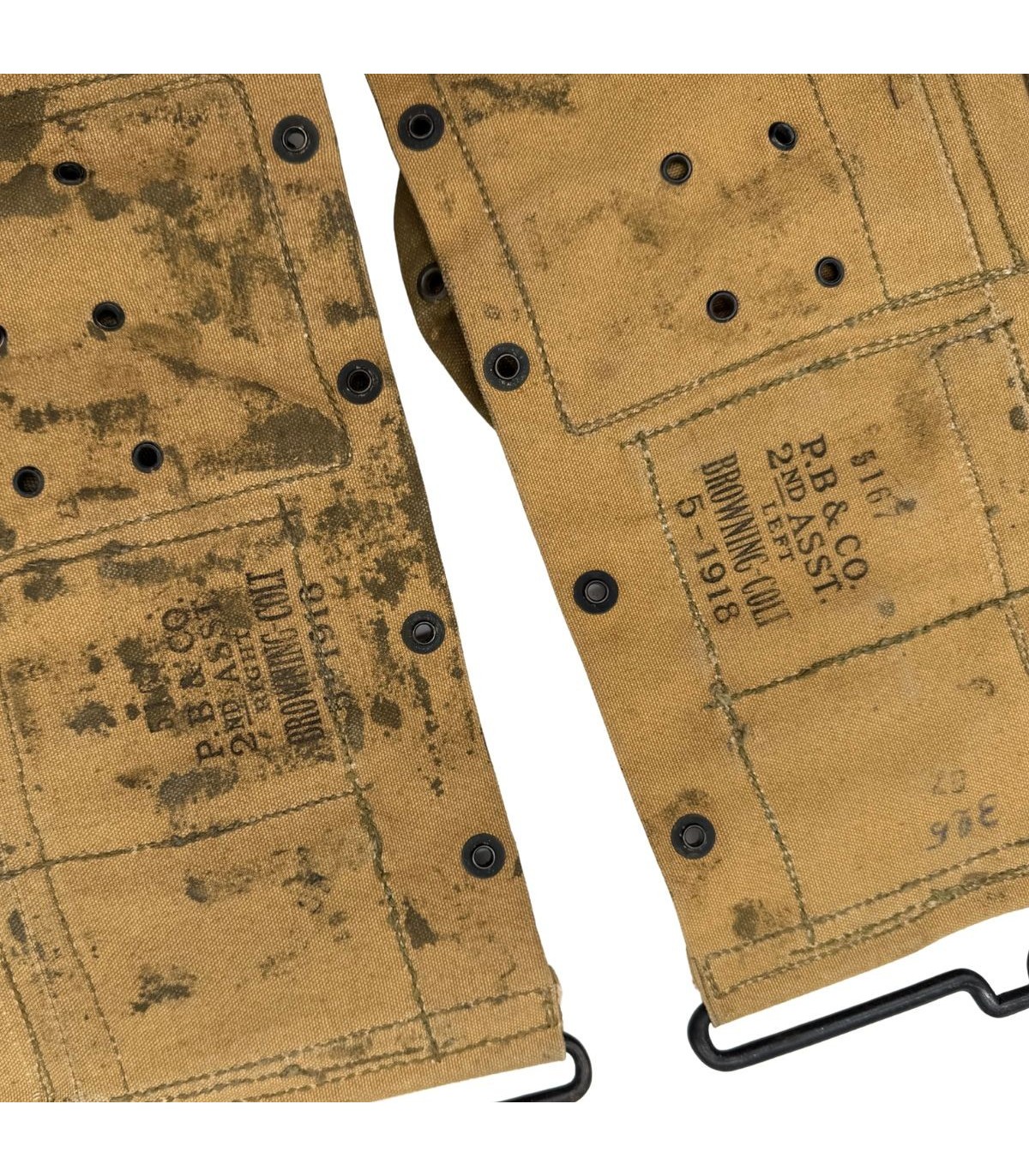 Fabriqué par la prestigieuse firme P.B. & CO. en 1918, ce ceinturon est un pur produit de la Grande Guerre. Cependant, son histoire ne s'arrête pas en novembre 1918. Comme en témoigne sa teinte kaki (Olive Drab), cet exemplaire a été officiellement reteinté par les services de l'intendance pour une réutilisation durant la Seconde Guerre mondiale. Cette pratique, courante en 1941-1942 pour harmoniser les stocks de 1918 avec les nouvelles tenues, confère à l'objet une double valeur historique : il a traversé les deux plus grands conflits du XXe siècle.