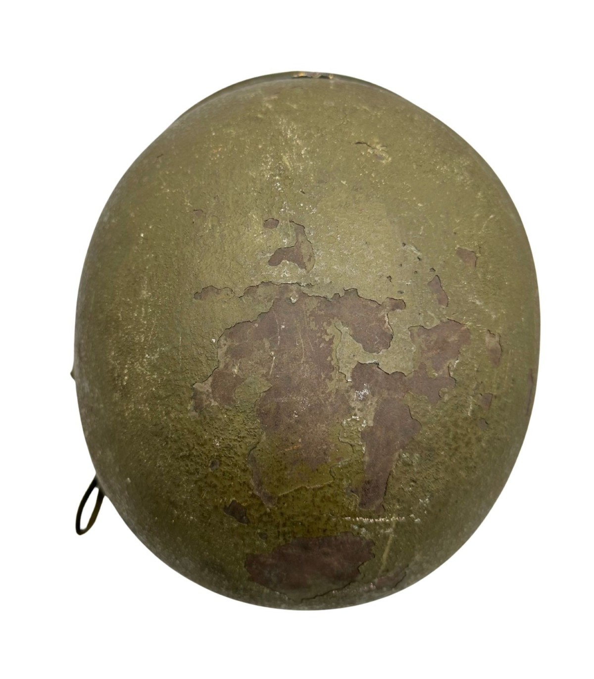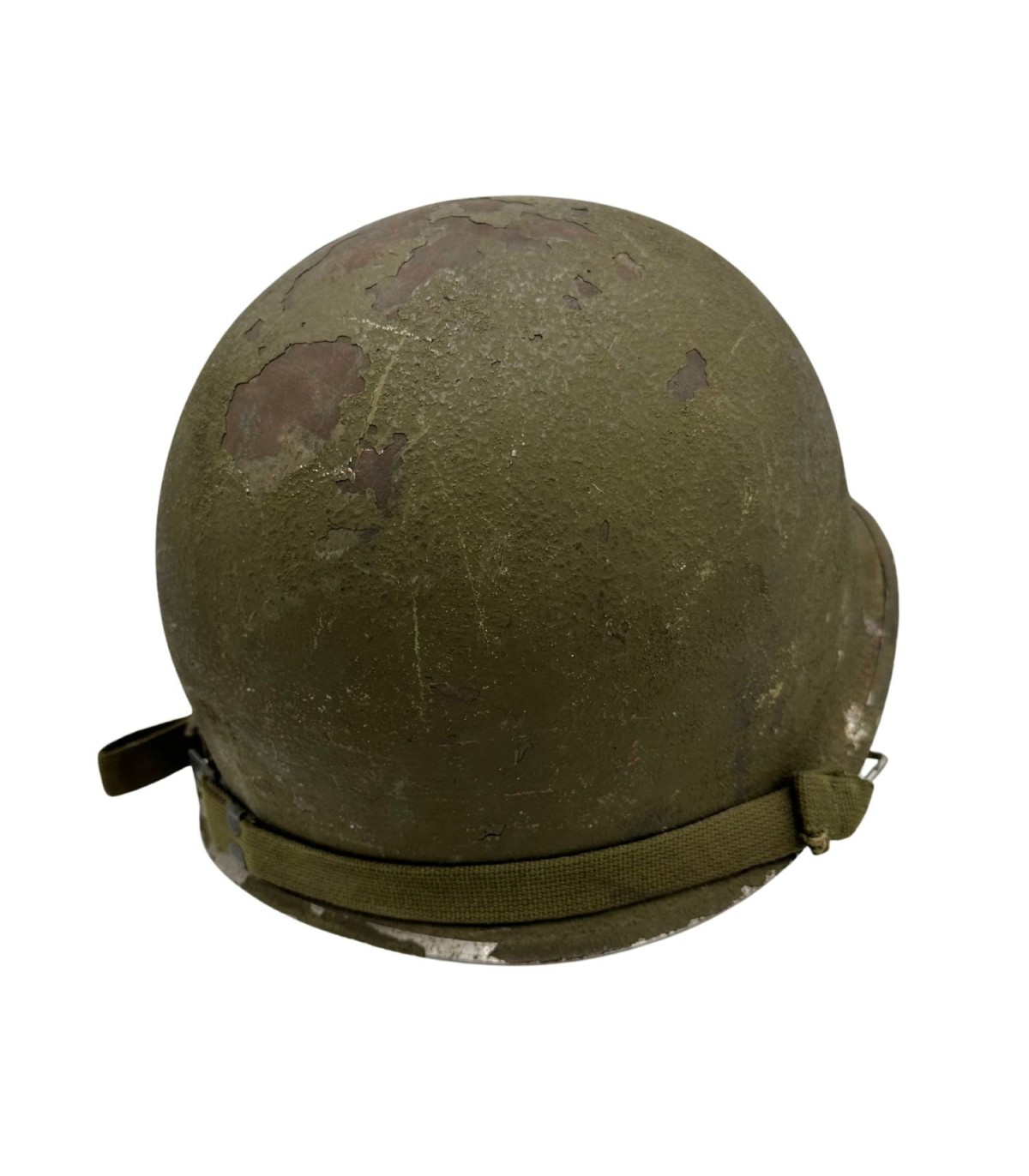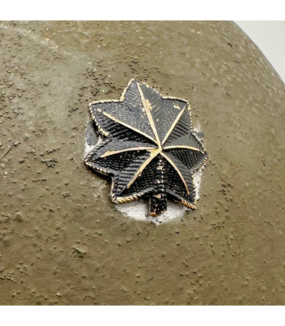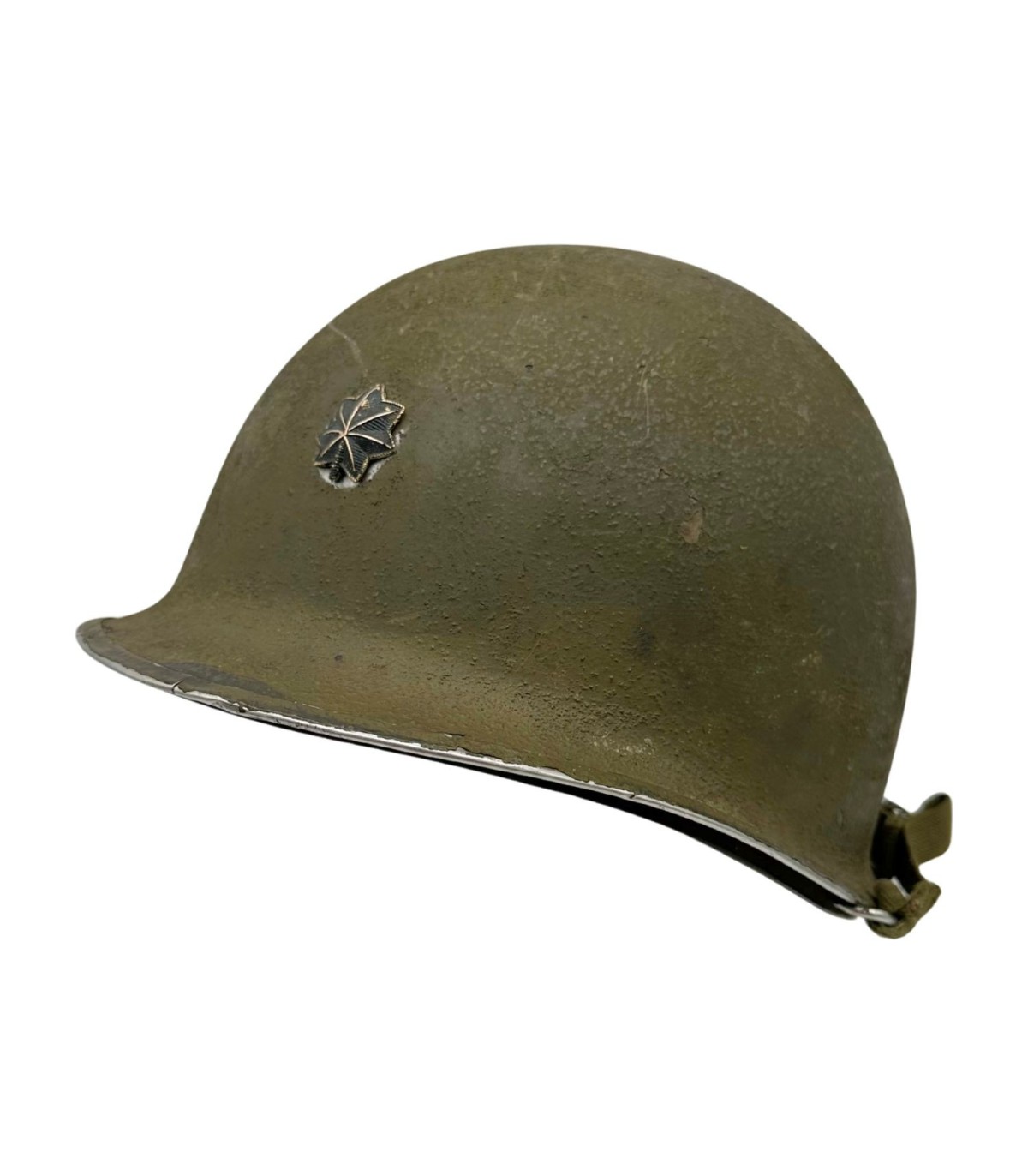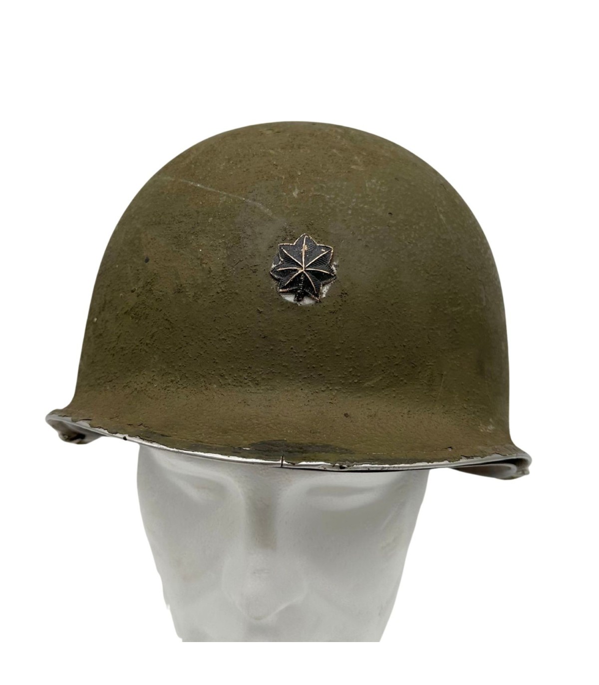 Ce qui confère une valeur exceptionnelle et une grande rareté à cette pièce est la présence d'un insigne de grade Major (feuille de chêne argentée) qui a été SOUDÉ directement sur le devant de la coque. Cette modification non standard, qu'elle soit une initiative de terrain ou un ajout exceptionnel, rend cette coque absolument unique et témoigne de l'équipement personnalisé d'un officier supérieur (O-4) de l'US Army.