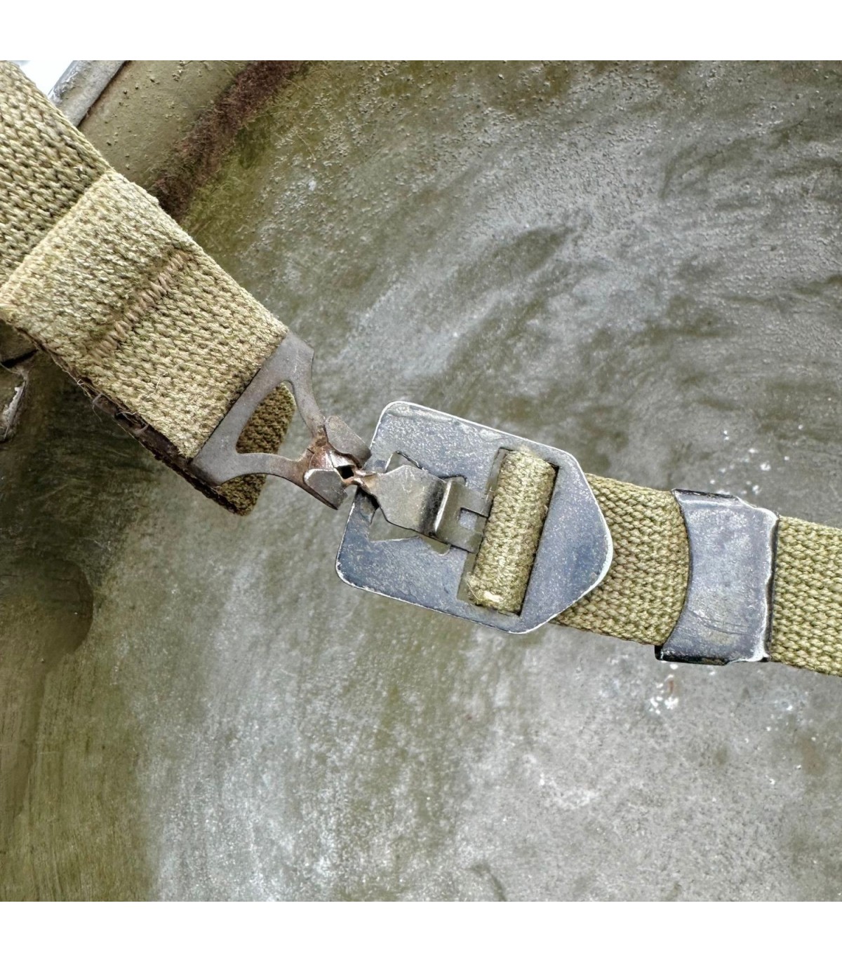 La coque est équipée de sa jugulaire en tissu montée d'origine. Un détail technique crucial est la présence du système de dégagement rapide T1 (mécanisme d'ouverture rapide) intégré à la jugulaire. Ce système fut introduit à la fin de la guerre pour permettre au soldat de retirer le casque rapidement en cas d'accrochage.