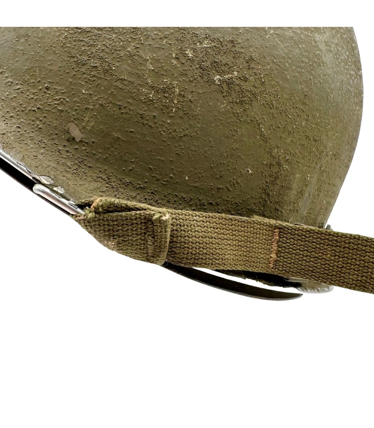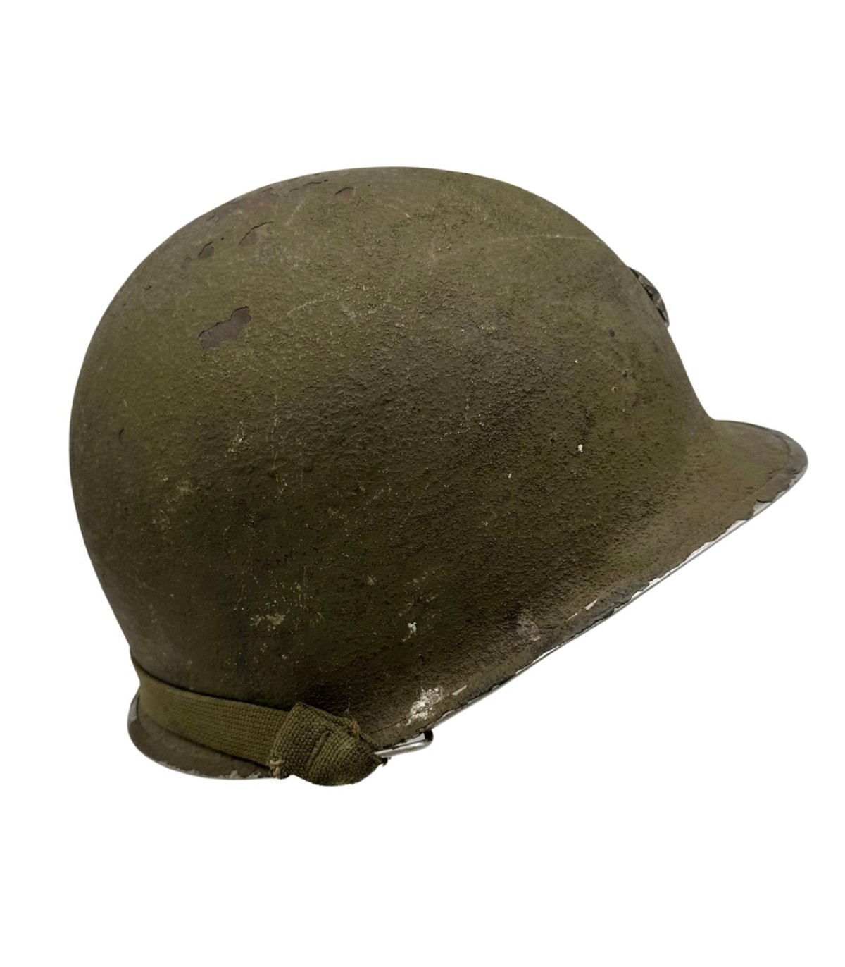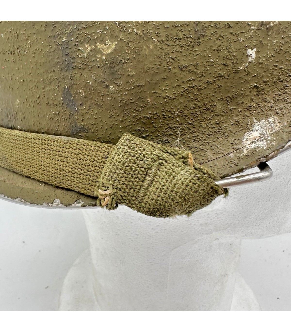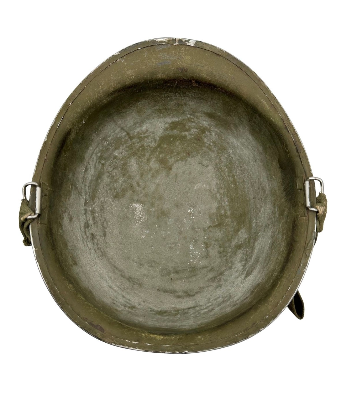 Nous vous proposons une coque de Casque USM1 qui raconte une histoire de commandement et de modification d'équipement sur le terrain. Ce casque est un modèle à pattes mobiles (Swivel Bale), introduit en 1944.