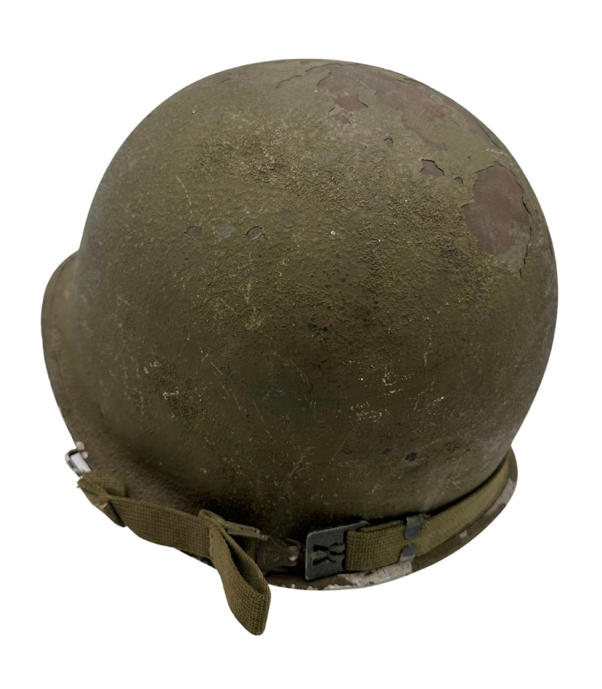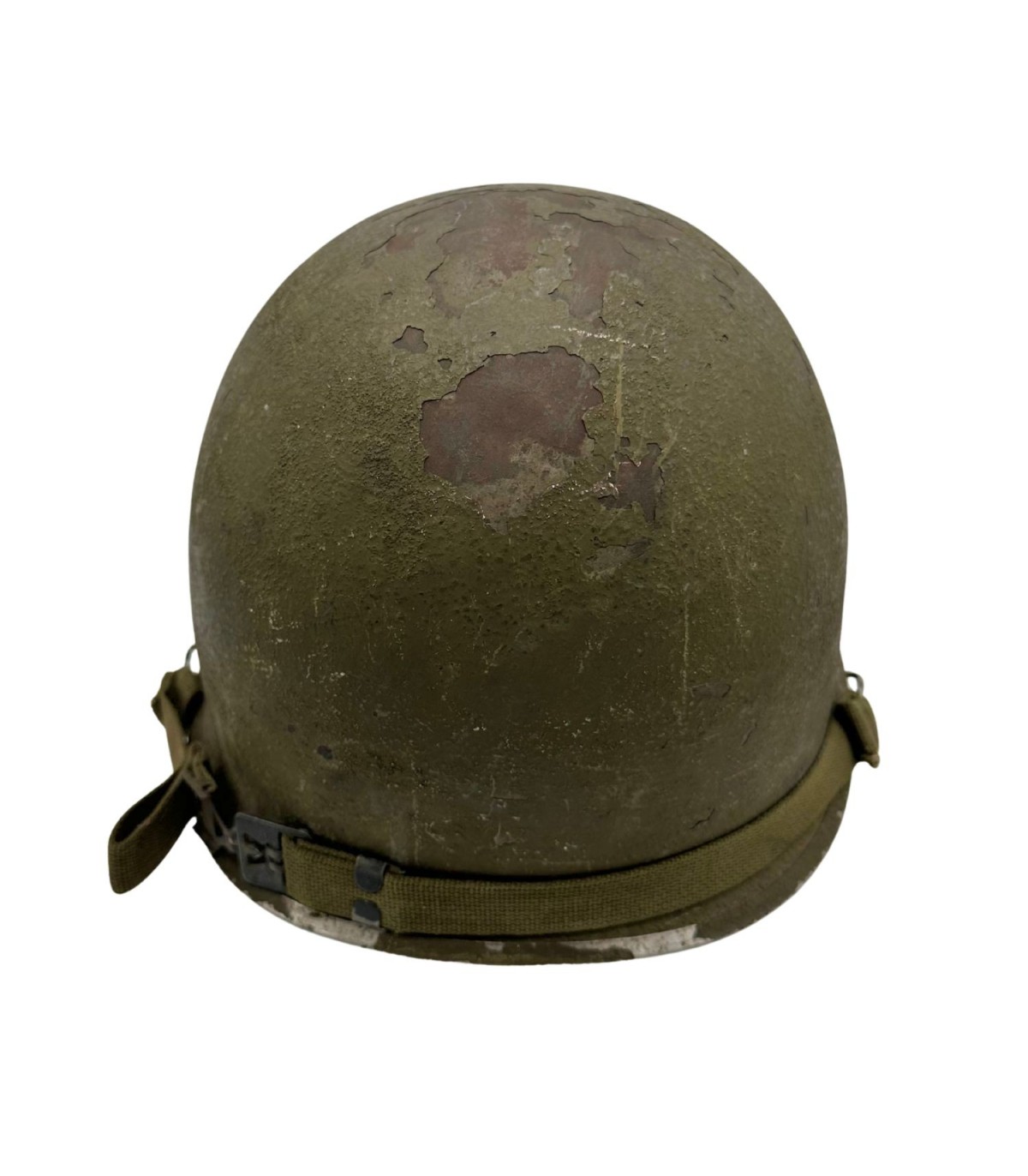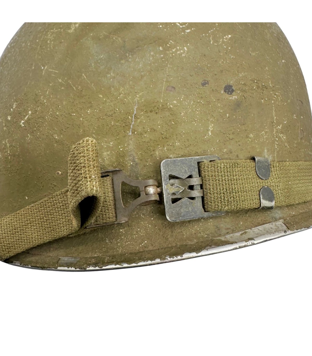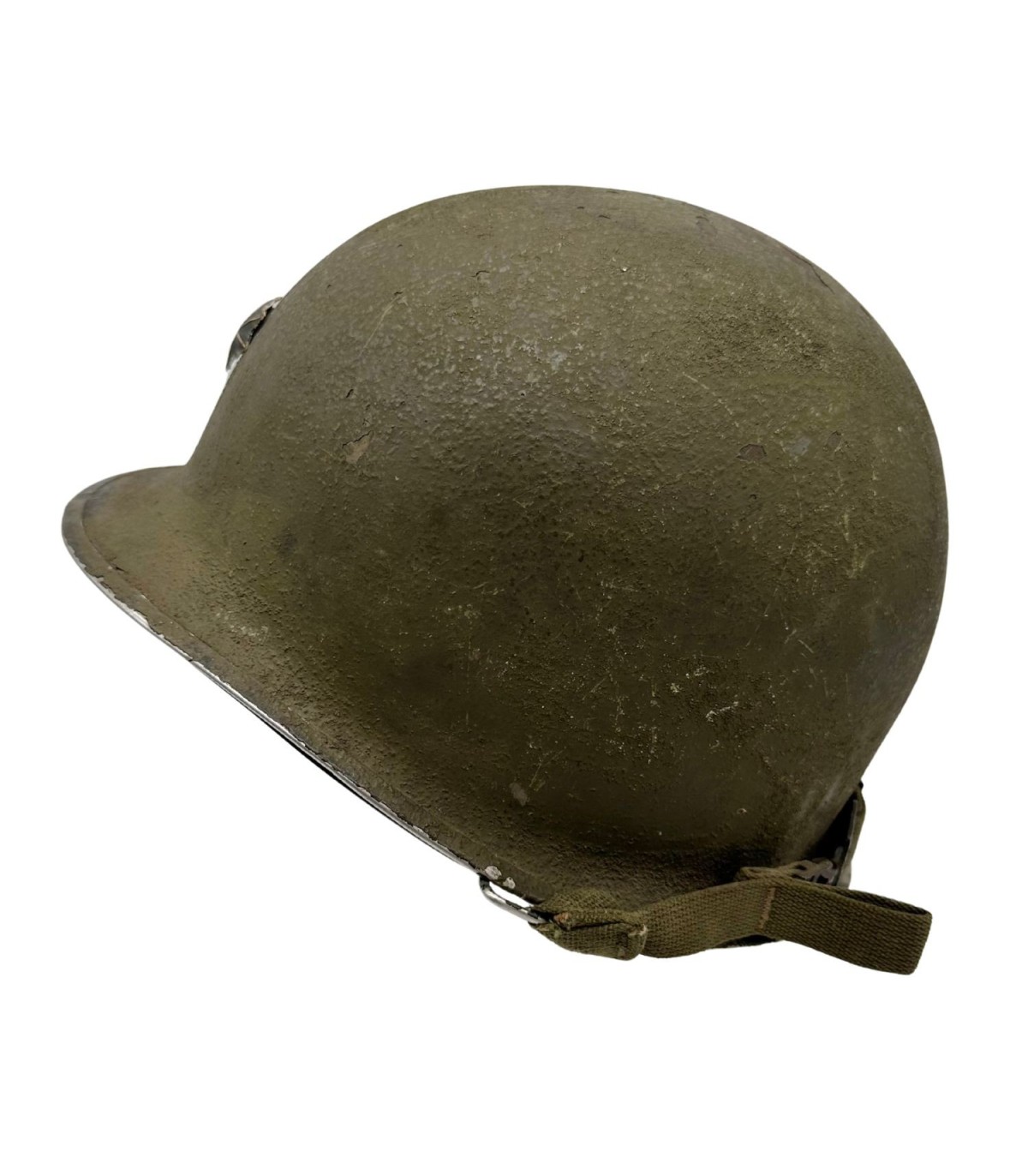 Nous vous proposons une coque de Casque USM1 qui raconte une histoire de commandement et de modification d'équipement sur le terrain. Ce casque est un modèle à pattes mobiles (Swivel Bale), introduit en 1944.