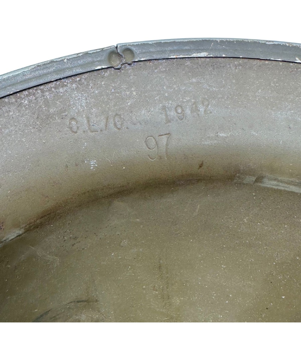 Le Canada a joué un rôle majeur dans la production d'équipements. Les casques produits par des compagnies comme CL/C en 1942, et qui n'ont pas été repeints par la suite, sont des témoins directs de la logistique et des codes de couleur spécifiques des débuts du conflit. Le maintien de cette teinte brun clair est un excellent indicateur d'une pièce préservée et peu modifiée. Ce casque est parfait pour compléter la tenue d'un soldat canadien de la période 1942.