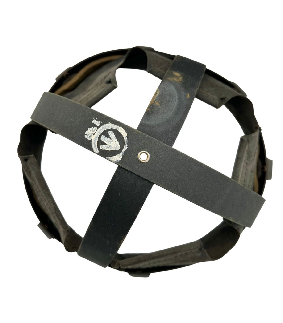 L’intérieur est complet avec sa coiffe en toile caoutchoutée, conforme aux modèles réglementaires de début de guerre. Jugulaire présente également.