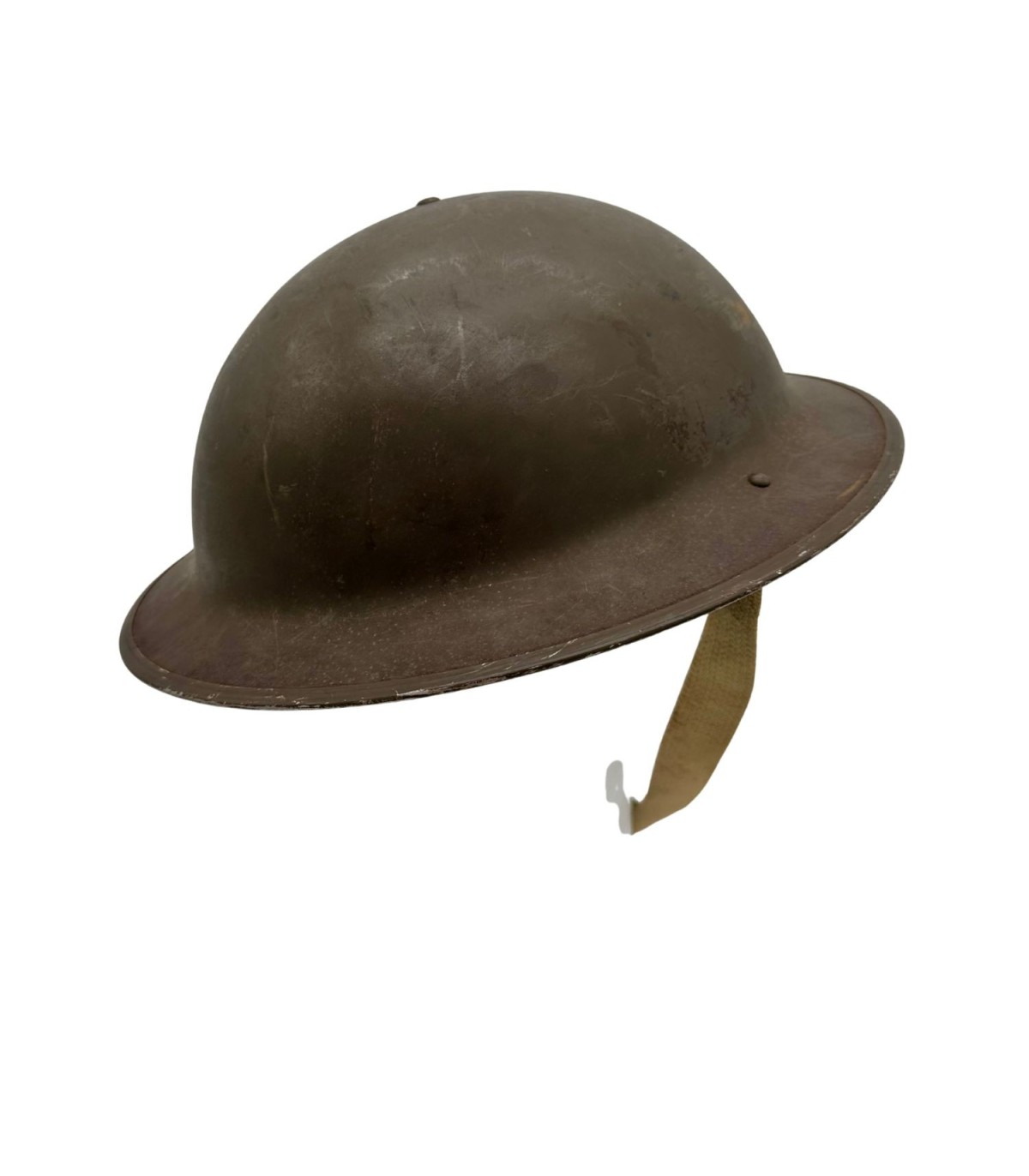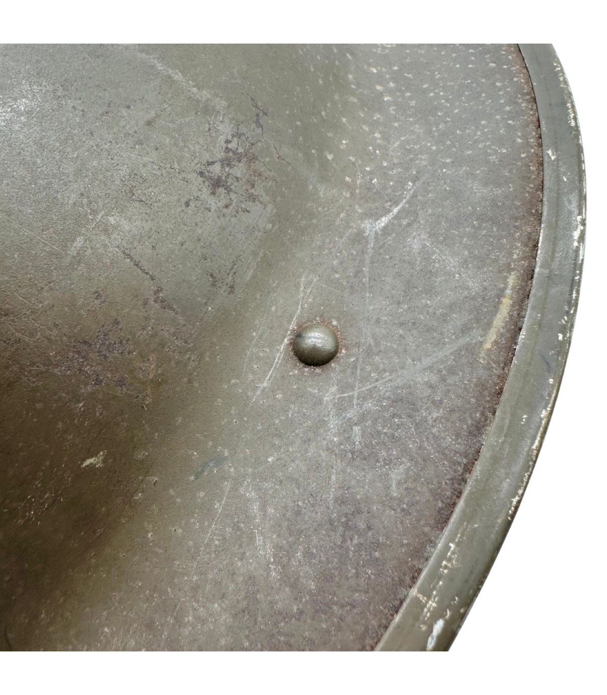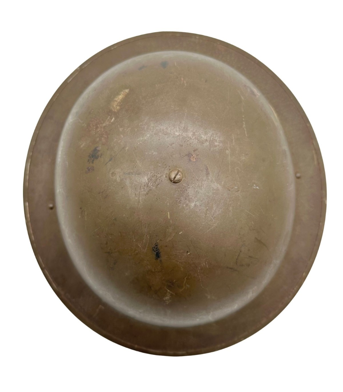 L'intérieur est complet et historiquement correct, conservant sa coiffe (liner) en toile caoutchoutée. L'attrait majeur de cette pièce réside dans sa couleur Brun Clair (première version), qui rend cette coque particulièrement rare et recherchée pour les collections d'uniformes de début de guerre ou des unités spécifiques du Commonwealth.