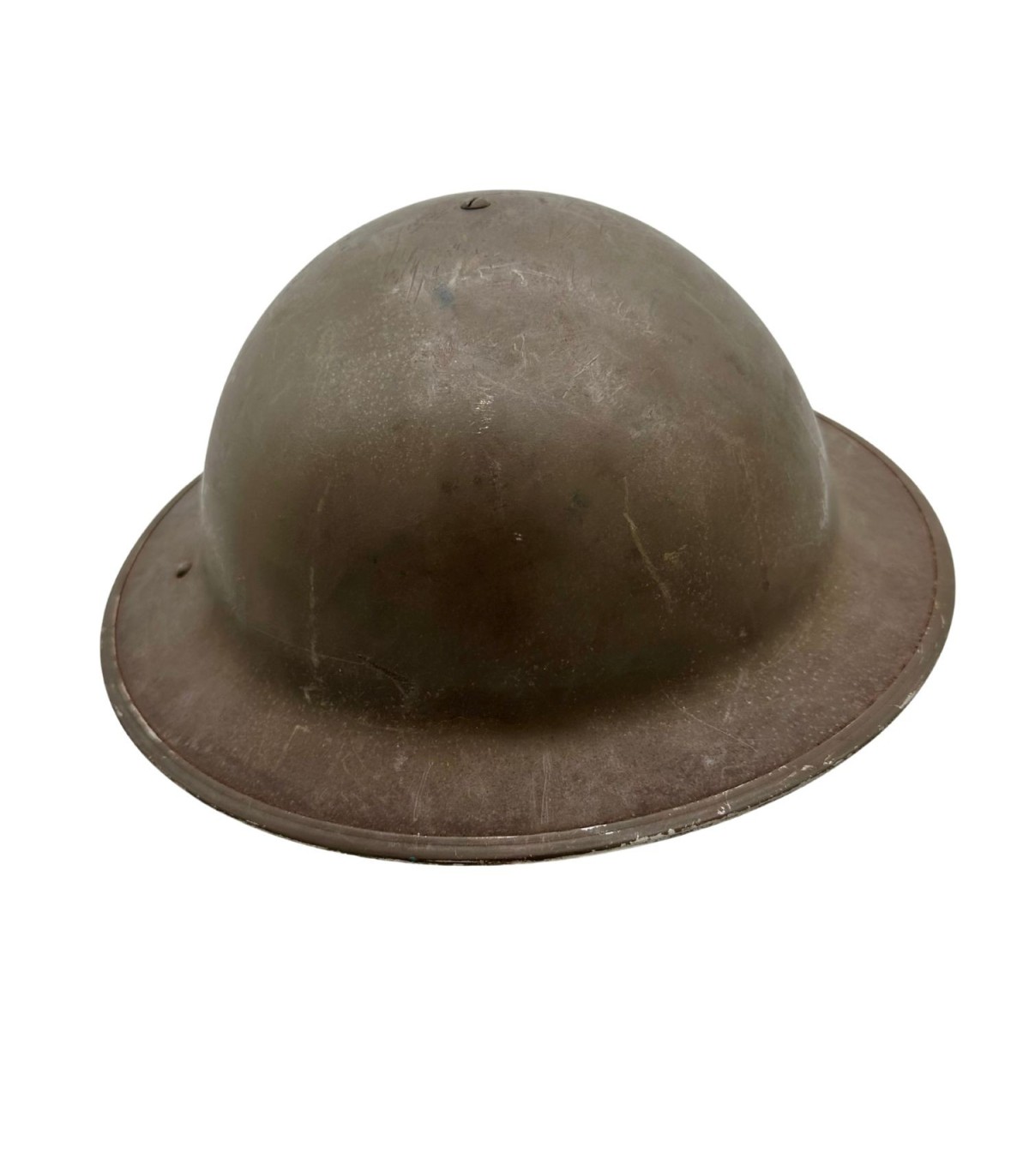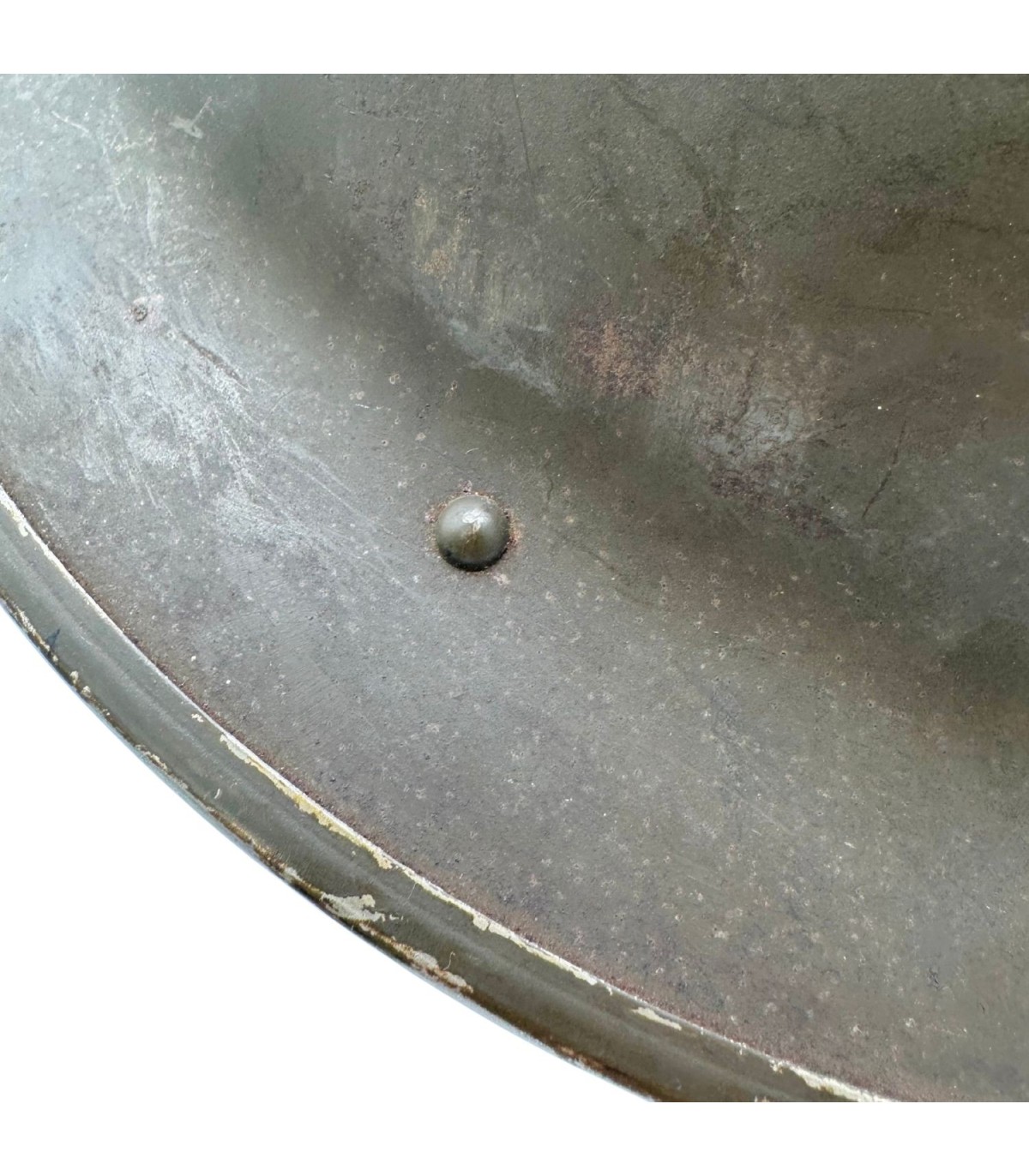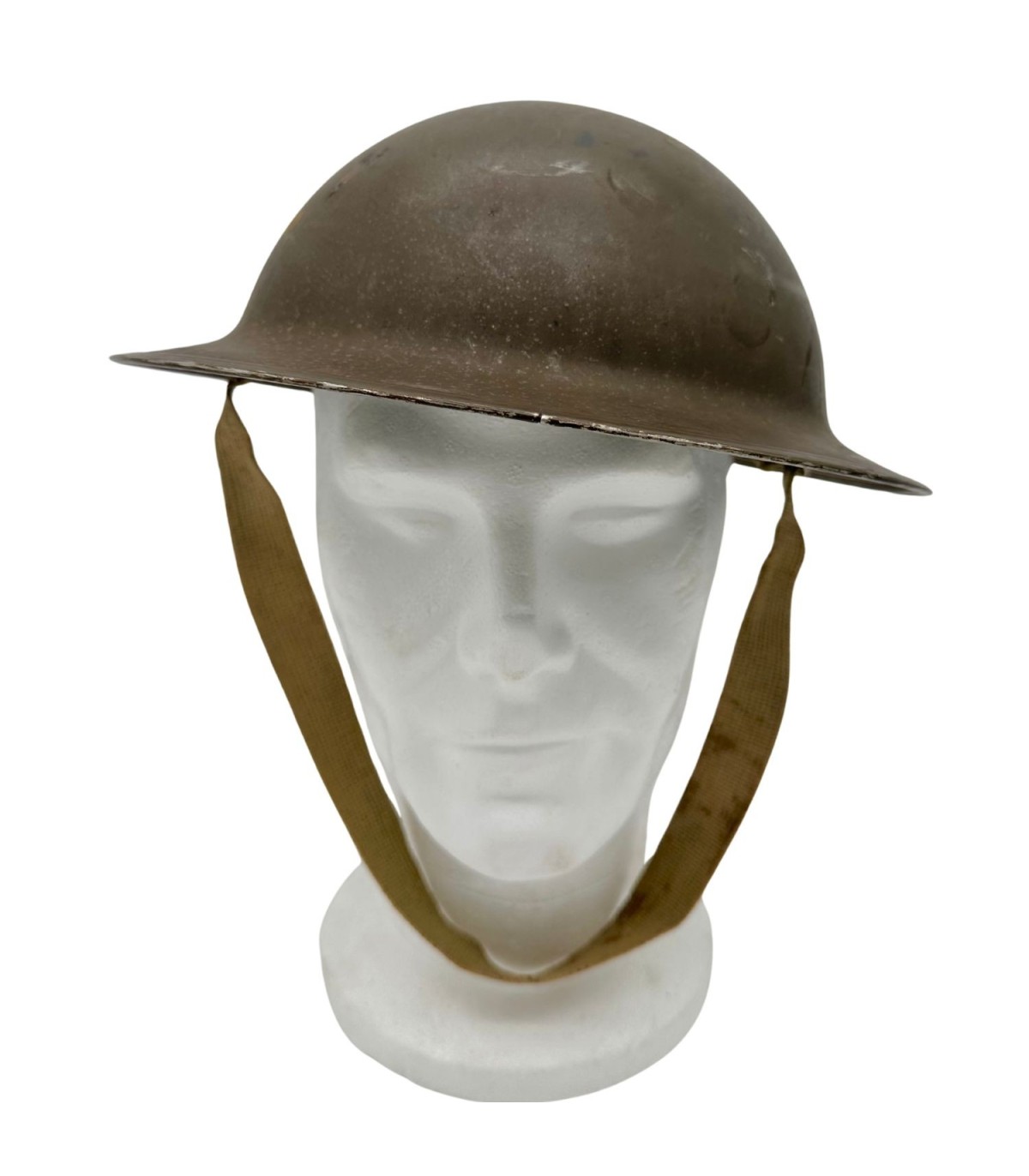 L'intérieur est complet et historiquement correct, conservant sa coiffe (liner) en toile caoutchoutée. L'attrait majeur de cette pièce réside dans sa couleur Brun Clair (première version), qui rend cette coque particulièrement rare et recherchée pour les collections d'uniformes de début de guerre ou des unités spécifiques du Commonwealth.