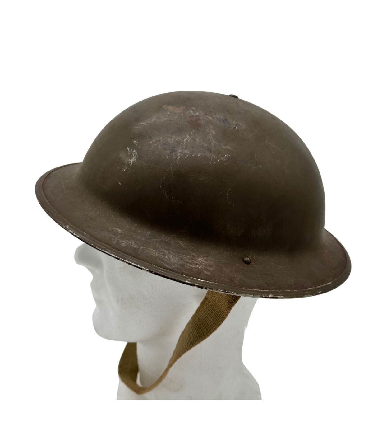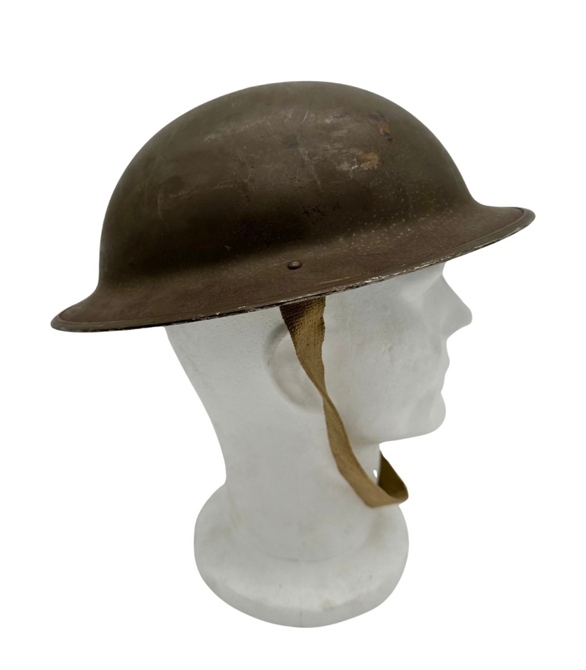 Casque Mk II canadien 100 % original, fabriqué par CL/C (Canadian Lamp Company) et daté 1942. Cet exemplaire se distingue par sa teinte brun clair d’origine, typique des premières productions canadiennes et aujourd’hui difficile à trouver, la plupart ayant été repeints en teinte plus sombre.