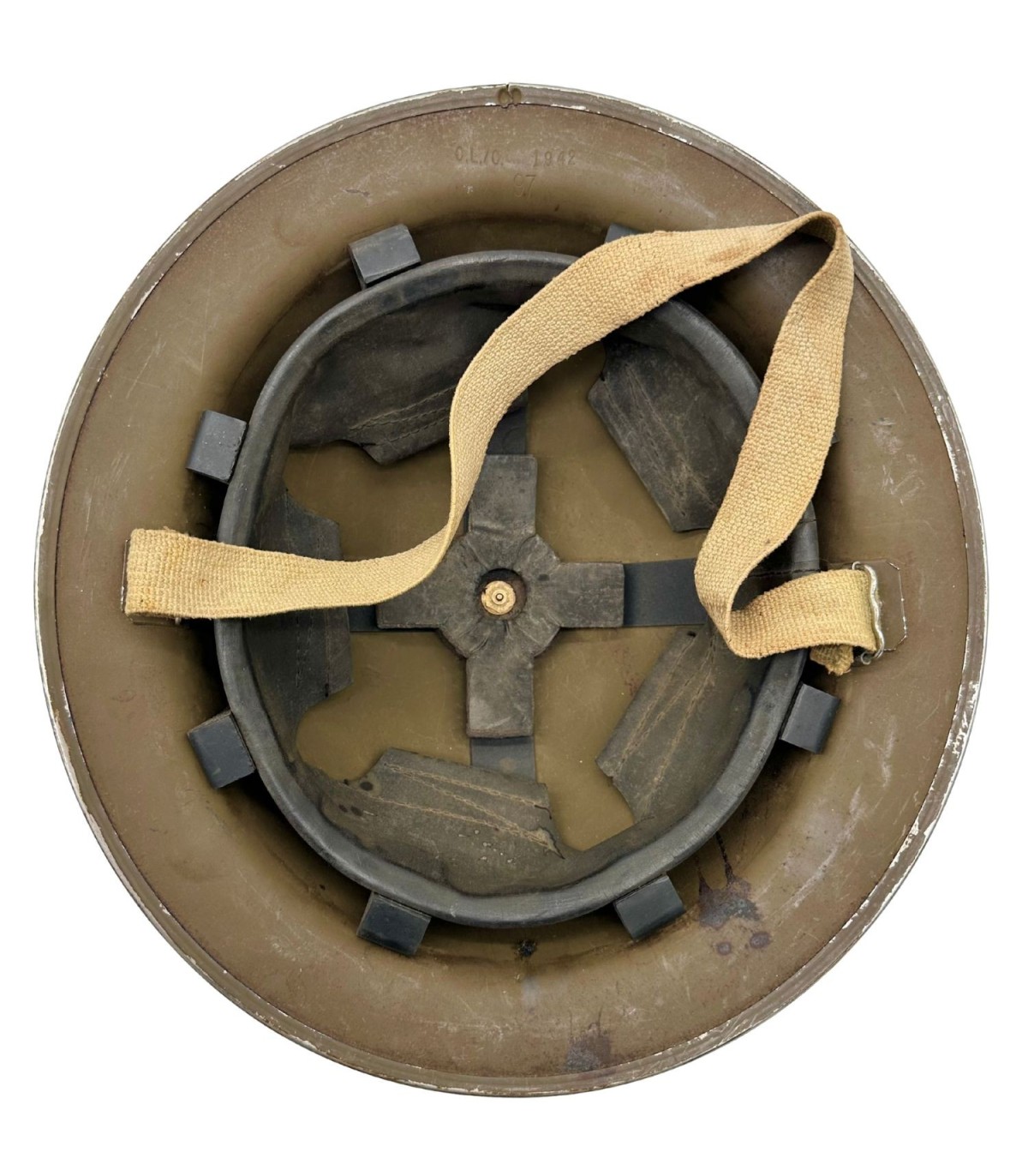 Nous vous proposons une pièce essentielle et visuellement distinctive de l'équipement de la Deuxième Guerre Mondiale : un Casque Mk II Standard provenant de l'Armée Canadienne, ayant conservé sa couleur brun clair d'origine. Cette teinte est souvent associée aux premières versions de production et aux stocks canadiens, offrant un contraste avec les teintes Olive Drab plus foncées et standardisées de la fin de la guerre.