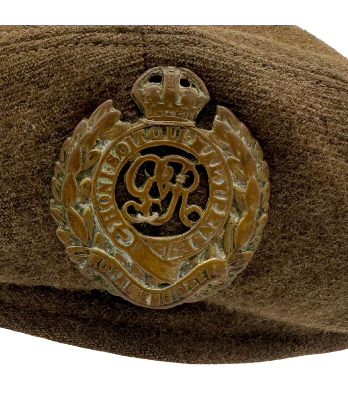 Insigne : Il est complet avec son Badge d'Unité (Cap Badge) des Royal Engineers, qui est cousu d'origine. Le fait qu'il soit cousu témoigne de l'usage en campagne.